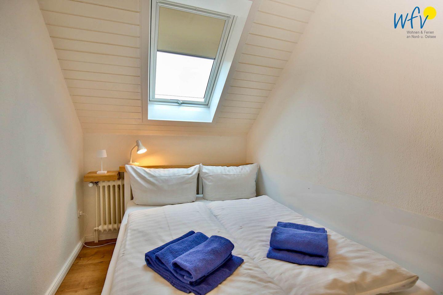 In dem separaten Schlafzimmer unserer Ferienwohnung auf Wangerooge befindet sich ein Doppelbett (140x200 cm), eine Kommode und ein zweiter Fernseher. Die Couch im Wohnraum kann für eine zusätzliche Schlafmöglichkeit ausgezogen werden.