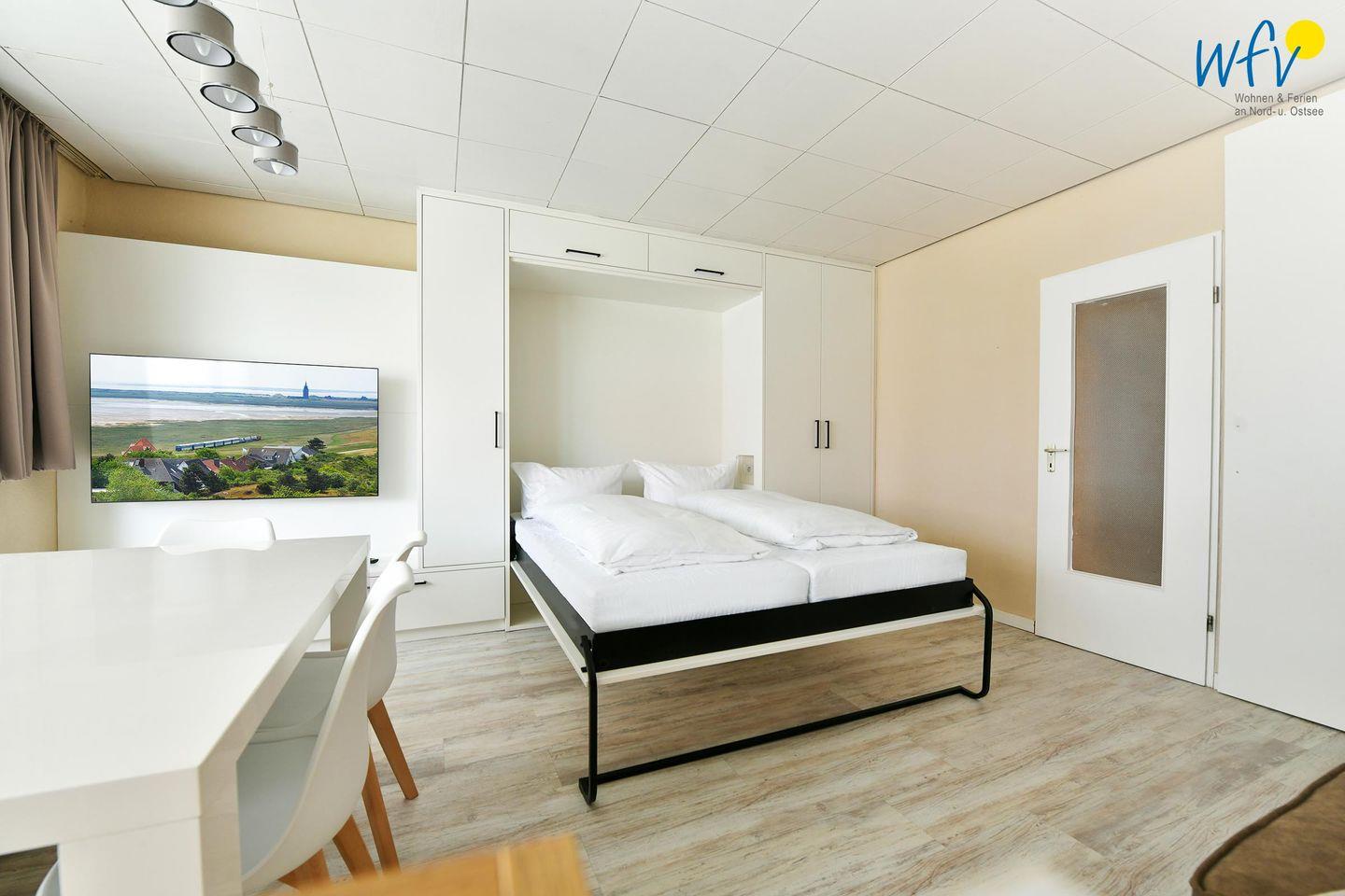 Für erholsame Zeiten in Ihrem Wangerooge-Urlaub ist das Wohnzimmer mit einer bequemen Couchecke mit TV eingerichtet. So können Sie ausgiebig entspannen und gemütlich den Urlaubstag ausklingen lassen. Durch eine große Fensterfront besitzt dieses Zimmer einen schönen Lichteinfall und damit eine freundliche Atmosphäre.