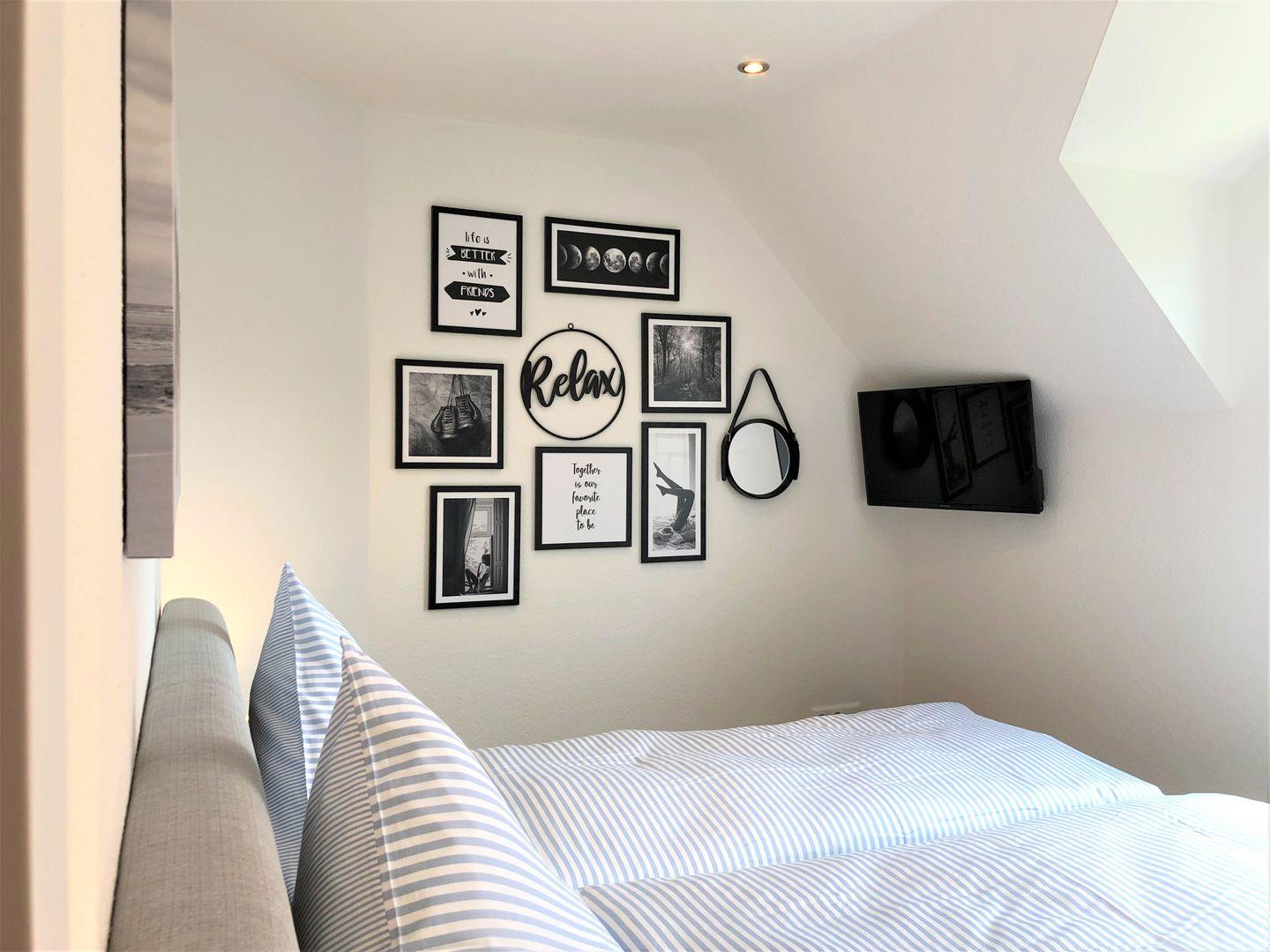 Das Hauptschlafzimmer überzeugt Sie mit einem komfortablen Doppelbett im mediterranen Design und einem weiteren HD-TV. Die weiteren zwei Schlafzimmer sind ebenso stilvoll mit Doppelbetten eingerichtet. Im Spitzbodengibt es einen separaten Schlafbereich mit einer zusätzlichen Spielecke (ca. 50 qm). Hier können sich die Jüngsten Ihre eigene Abenteuerlandschaft gestalten oder die Großen den Rückzugsort genießen. Die Betten im oberen Geschoss sind 90 cm auf 200 cm.