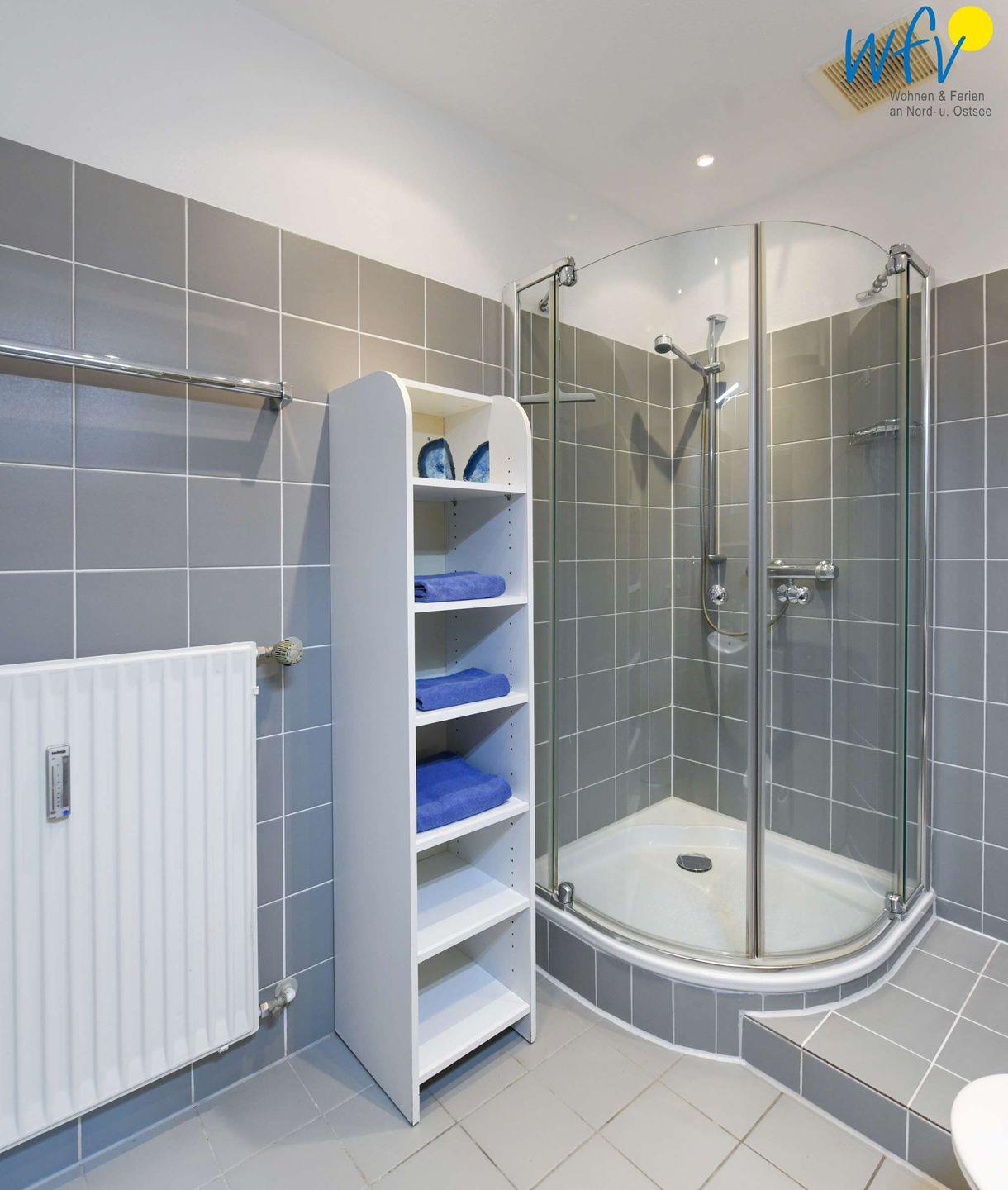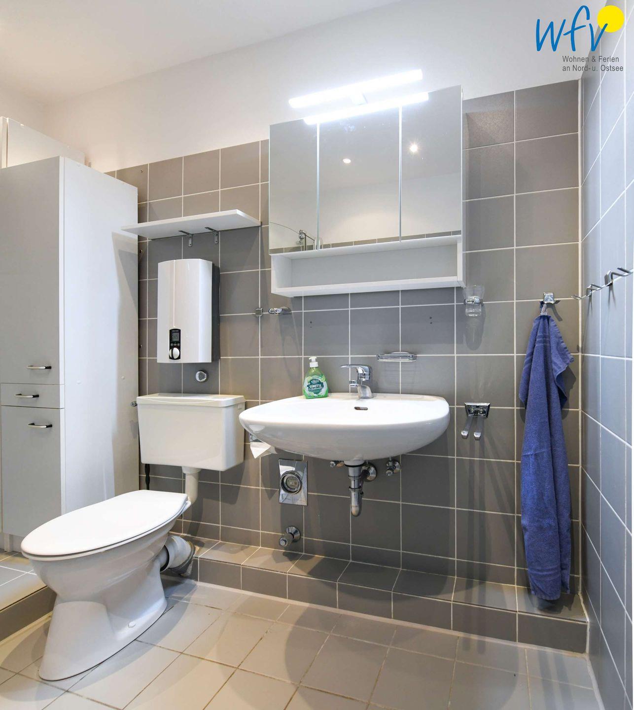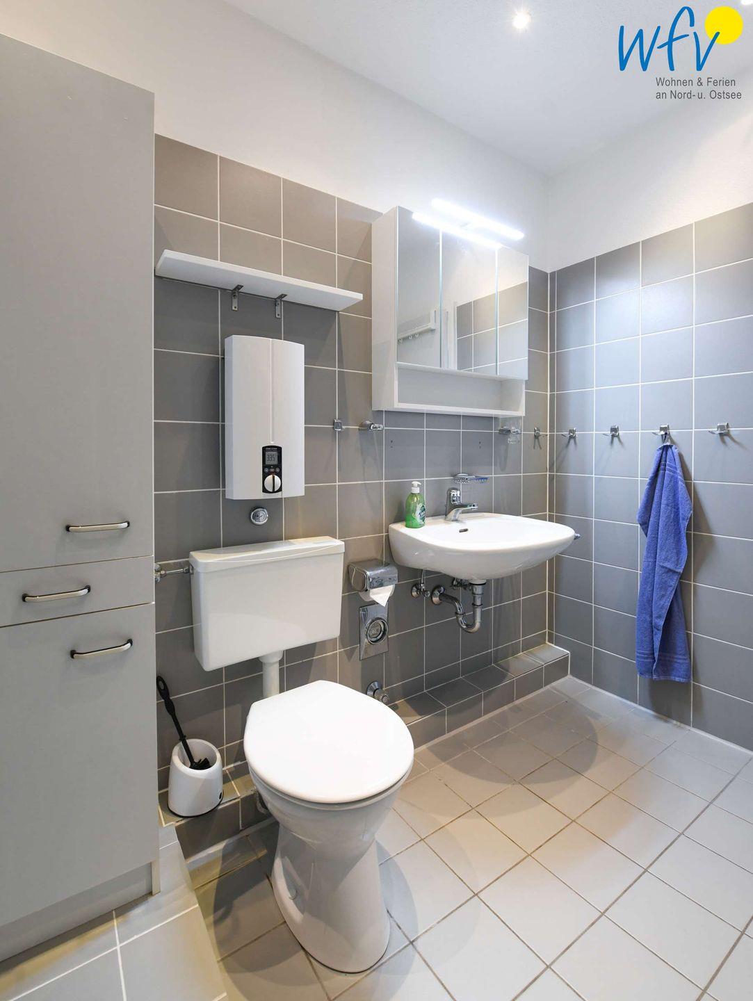 Im Badezimmer erwartet Sie eine bodentiefe Dusche, ein Waschbecken und ein WC.