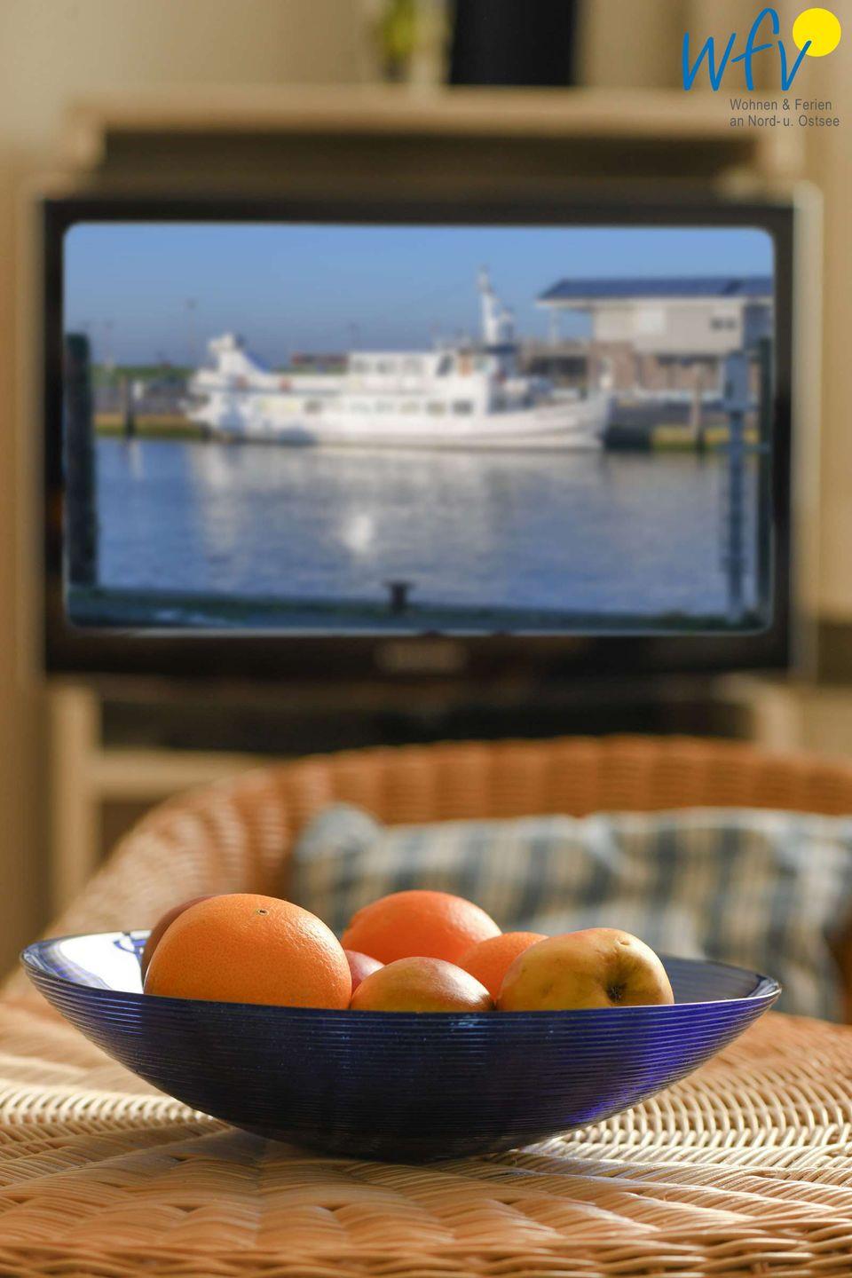 Ob nach dem Strandtag, der Fahrradtour oder der Wattwanderung - im Wohnbereich mit Couchecke und TV können Sie ausgiebig relaxen! Angrenzend befindet sich hier eine offene Küche - u.a. mit Herd, Mikrowelle und Spülmaschine - sowie ein Esstisch für gemeinsame Mahlzeiten. So können Sie sich in Ihrem Urlaub auf Wangerooge angenehm selbst verpflegen.
