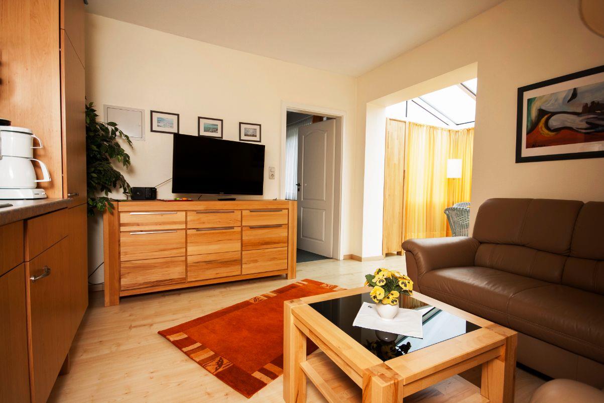 4 Sterne-Wohnung Wohnung, etwa 40 m2 groß, bestehend aus einem Wohnraum, einem Schlafzimmer mit einem Doppelbett sowie einem 3. Bett, einem Wohnraum und einem schönem Wintergarten nebst großer Terrasse mit Gartenmöbeln sowie einem Duschbad. Am Wintergarten angrenzend befindet sich das Wohnzimmer mit großer Ledercouchanlage. Ein großer LED-Farbfernseher sowie ein Radio. Im Wohnraum integriert befindet sich auch die Küchenzeile mit Mikrowelle, Geschirrspüler sowie Kaffeemaschine, Mikrowelle und Wasserkocher. Ein Kinderbett stellen wir bei Bedarf gern kostenlos zur Verfügung. Wlan ist kostenlos vorhanden.