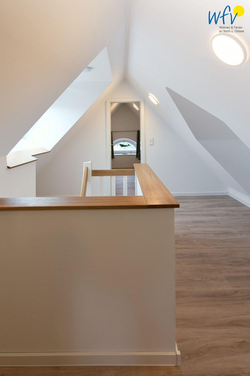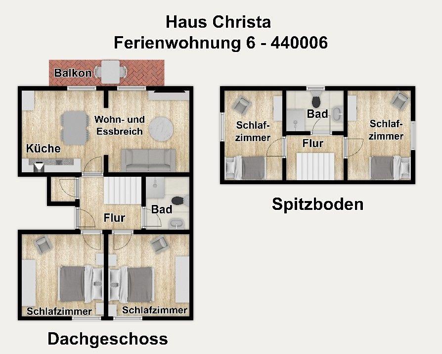 In dieser komfortablen Dachgeschosswohnung haben Sie Platz mit bis zu 8 Personen - perfekt für den Urlaub mit der großen Familie oder mit Freunden! Auf der ersten 1. Etage erwartet Sie ein großzügiger Wohnraum mit Couchecke und Essbereich, eine moderne offene Küche, zwei separate Schlafzimmer, ein Duschbad und ein Abstellraum sowie ein sonniger Balkon mit Südausrichtung. Im Spitzboden befinden sich zwei weitere Schlafzimmer und ein kleines Bad mit niedriger Dusche.