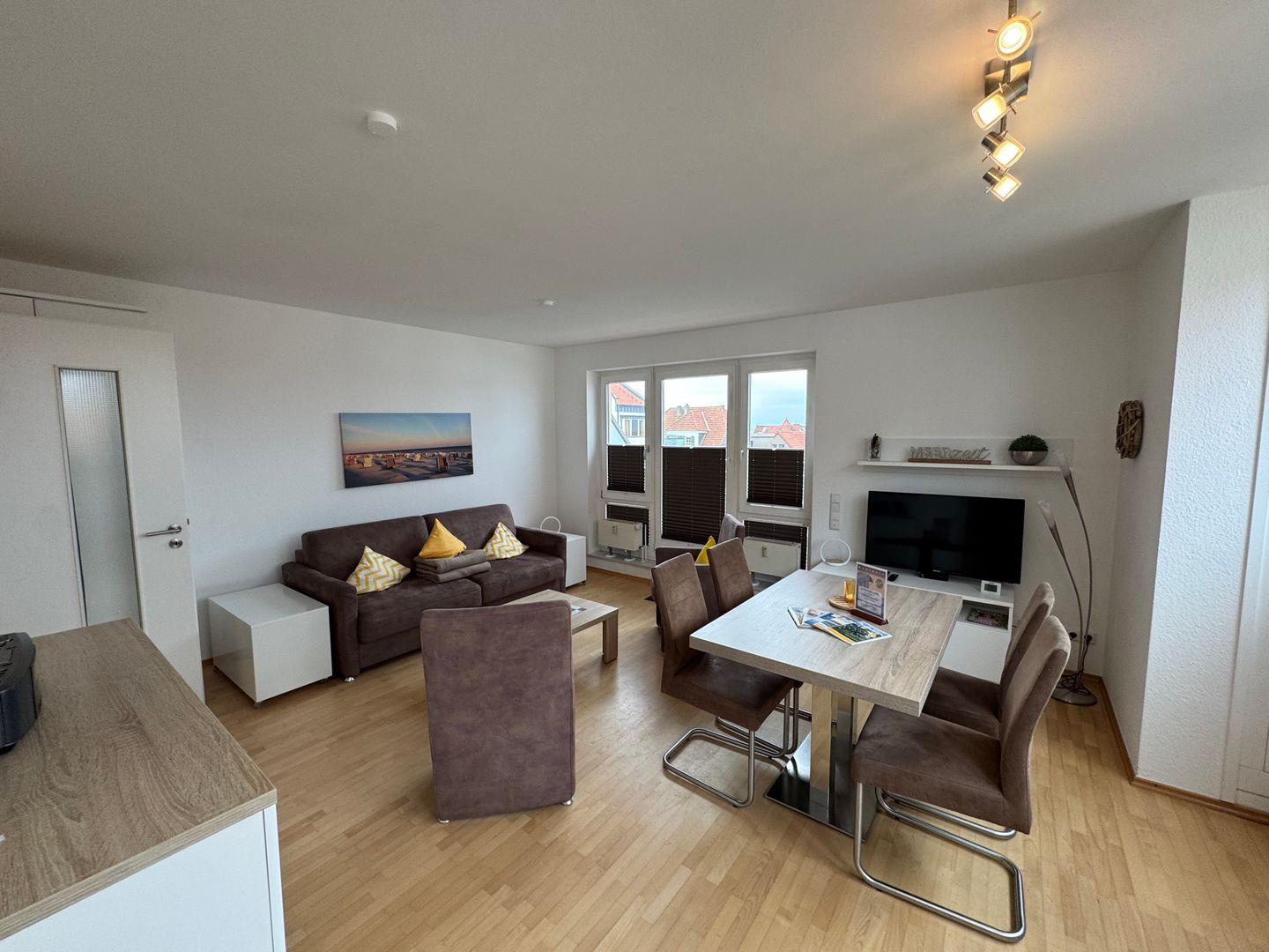 Die Wohnung befindet sich im 3. Stock und ist bequem über einen Aufzug erreichbar. Der offene Wohnbereich lädt zum Entspannen ein und ist sowohl mit einer bequemen Sofaecke als auch mit einem modernen Esstisch ausgestattet. Hier können Sie in geselliger Runde schmackhafte Mahlzeiten aus der voll ausgestatteten Küche genießen. Diese bietet alles, was das Herz begehrt, darunter einen Herd, Kühlschrank mit Gefrierfach, Geschirrspüler, Mikrowelle, Wasserkocher und eine Kaffeemaschine. Die stilvolle Ausstattung im Wohn- und Essbereich überzeugt mit einem Parkettboden, der eine warme Atmosphäre schafft.