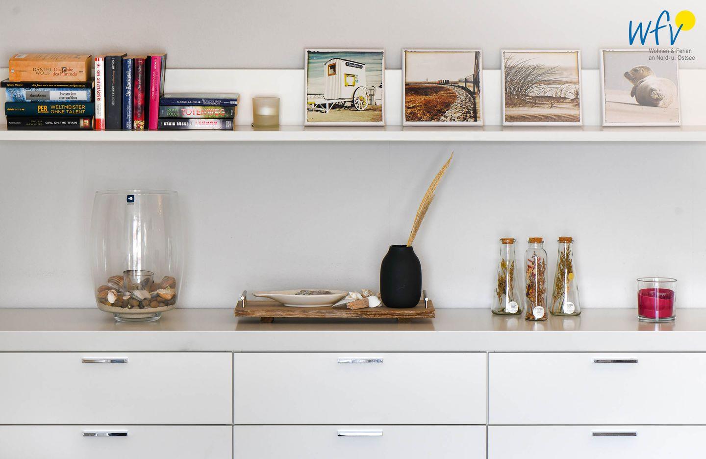Die Ferienwohnung besticht durch ihr modernes und zugleich gemütliches Ambiente. Liebevolle maritime Accessoires sorgen für die persönliche Note. Der helle offene Wohnbereich lädt mit einer Sofaecke und einem Essbereich zum Entspannen nach dem ereignisreichen Urlaubstag ein. Ein modernes TV mit DVD-Player sorgt für Unterhaltung, zudem empfangen Sie kostenlos freies WLAN.