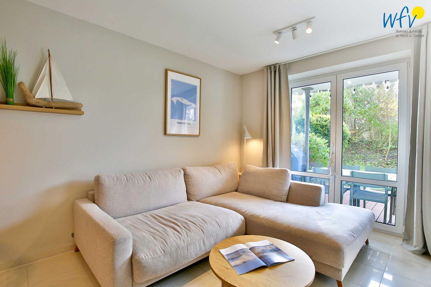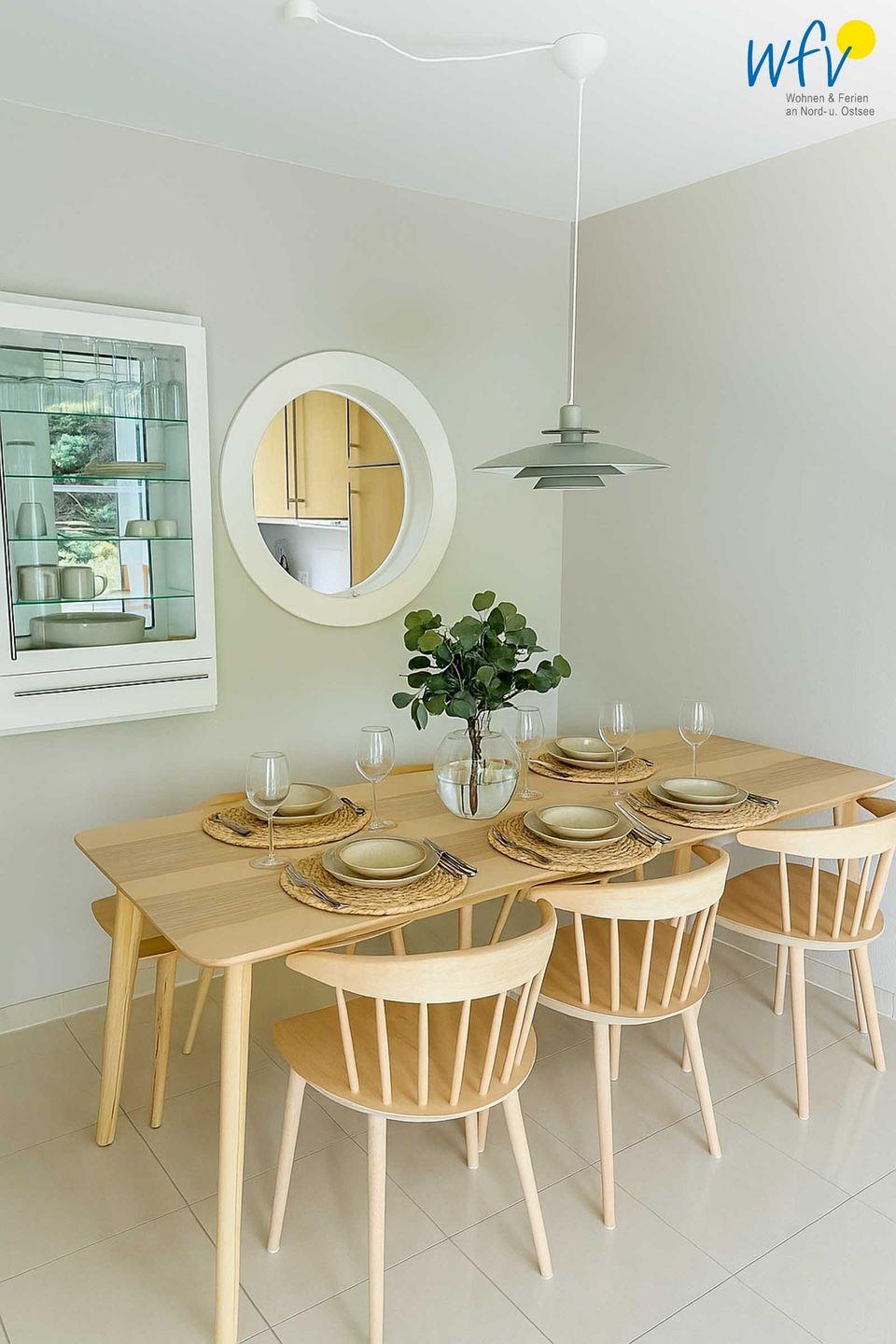 In dem hellen Wohnraum (EG) empfängt Sie ein geschmackvolles Ensemble aus einer Couchecke mit modernem SmartTV und einem langem Esstisch. So können Sie nach der Fahrradtour oder dem Strandtag gemütlich zusammen sitzen, Filme schauen oder Ihre Mahlzeiten genießen und klönen. Leckere Snacks für den Ausflug oder Gerichte am Abend lassen sich schnell und einfach in der separaten voll ausgestatteten Küche zaubern - u.a. mit Herd, Backofen und Mikrowelle. Den Abwasch übernimmt für Sie der Geschirrspüler. Kaffeegourmets genießen hier die Auswahl zwischen einer klassischen Kaffeemaschine, einem MoccaMaster und einer Nespresso.