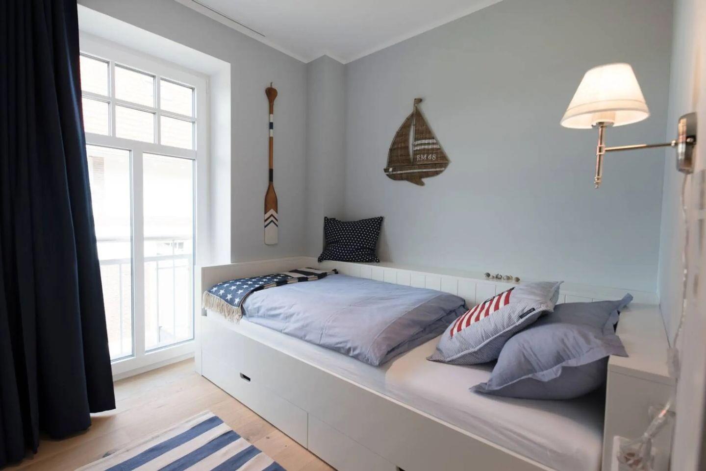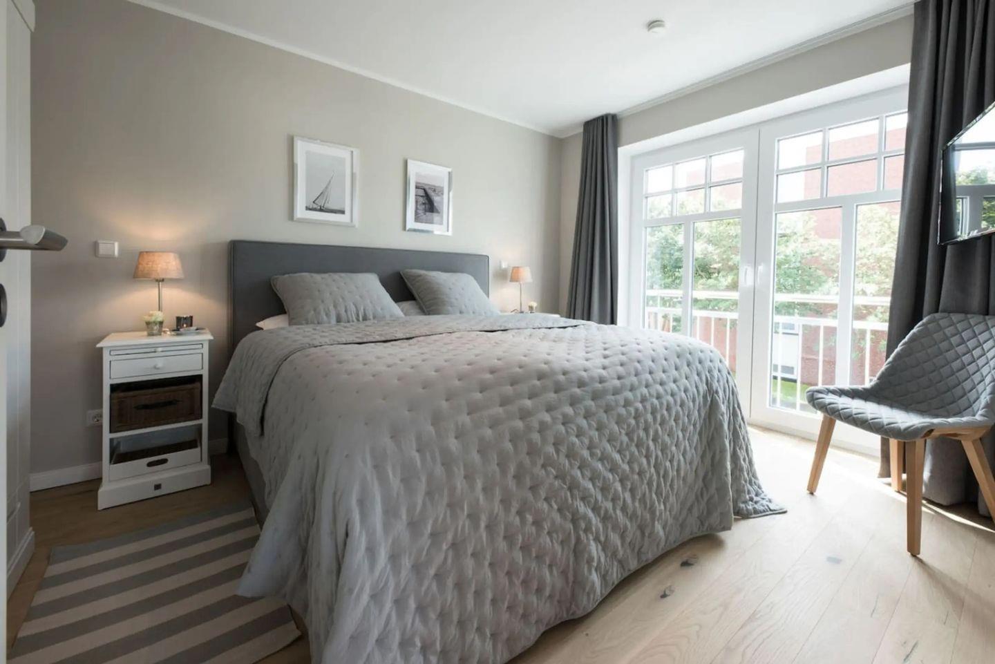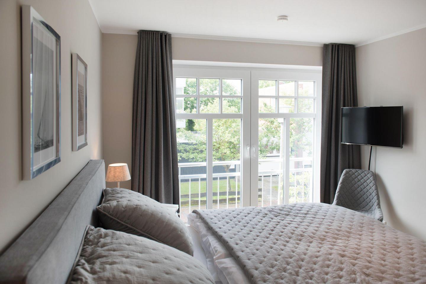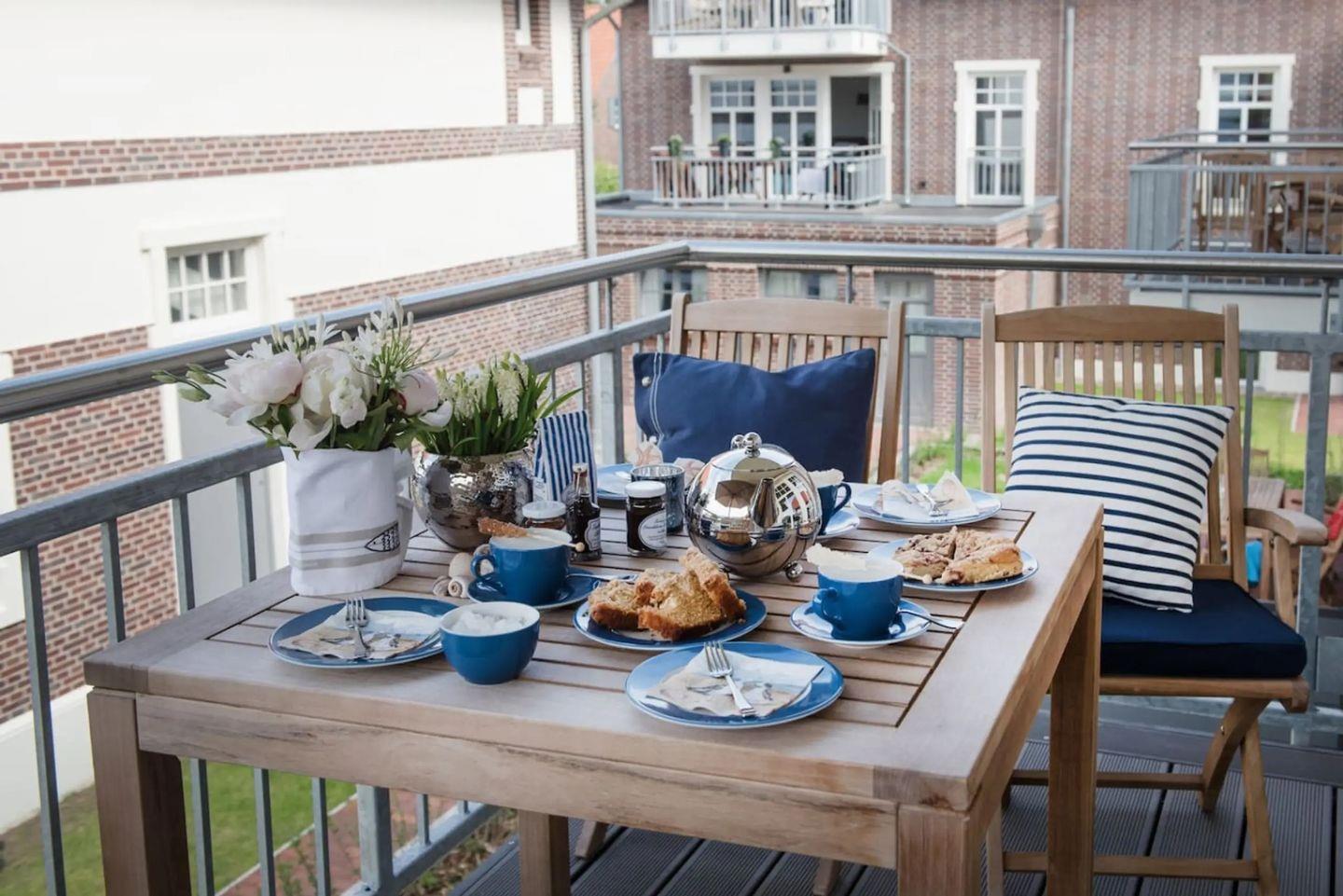 Der private Balkon lädt mit Gartenmöbeln und Sonnenschirm zum Verweilen ein – genießen Sie hier Ihren Morgenkaffee oder entspannen Sie nach einem Inseltag in der frischen Nordseeluft. Sämtliche Fenster sind mit Sichtschutz ausgestattet, was für Privatsphäre und Wohlbehagen sorgt.