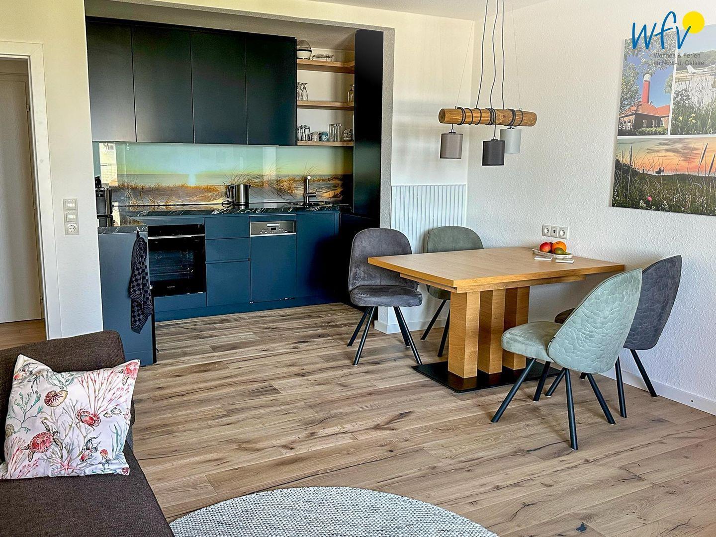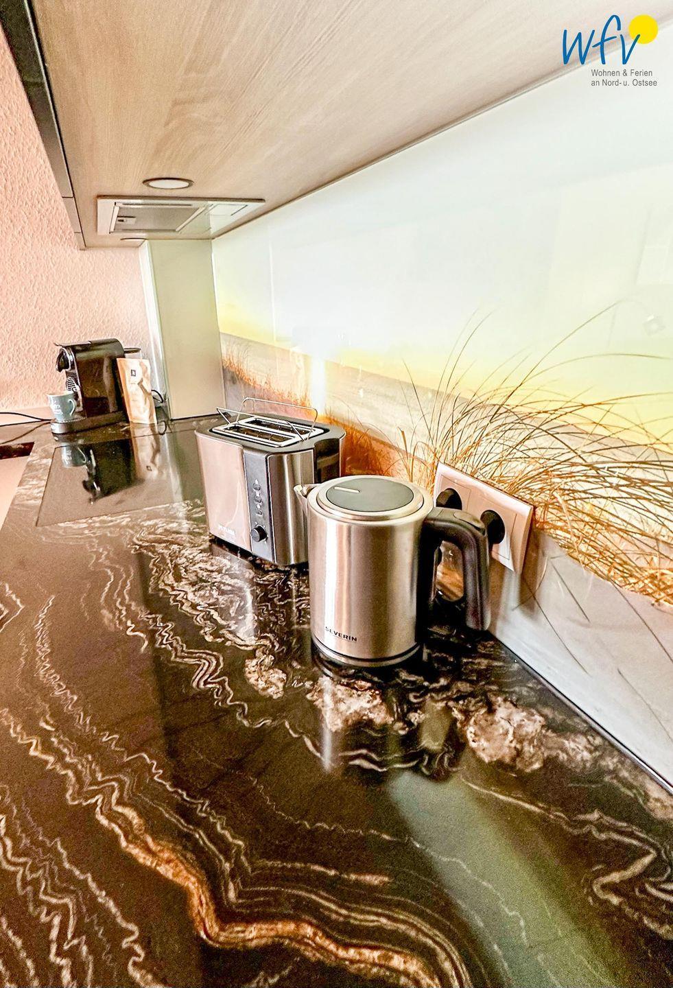 Bereits beim Ferienfrühstück beginnen Sie den Urlaubstag mit einem herrlichen Ausblick aufs Meer. In Gedanken wird schon die Badetasche gepackt oder der Rucksack für den Strandspaziergang. Warme Frühstücksbrötchen, kleine Snacks für den Ausflug und leckere Mahlzeiten lassen sich in der modernen offenen Küchenzeile zubereiten. Hochwertige Geräte wie ein Induktionsherd, ein Backofen, eine Mikrowelle, ein Handmixer, ein Kühlschrank mit Gefrierfach und ein Geschirrspüler ermöglichen Ihnen hier eine bequeme Selbstverpflegung und gemeinsame Kochabende. Als Kaffeeliebhaber können Sie zwischen einer klassischen Kaffeemaschine und einem Kapselautomaten (Nespresso) wählen.