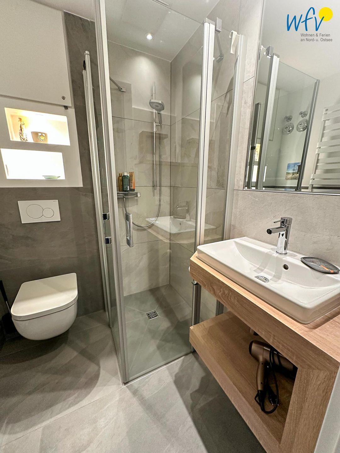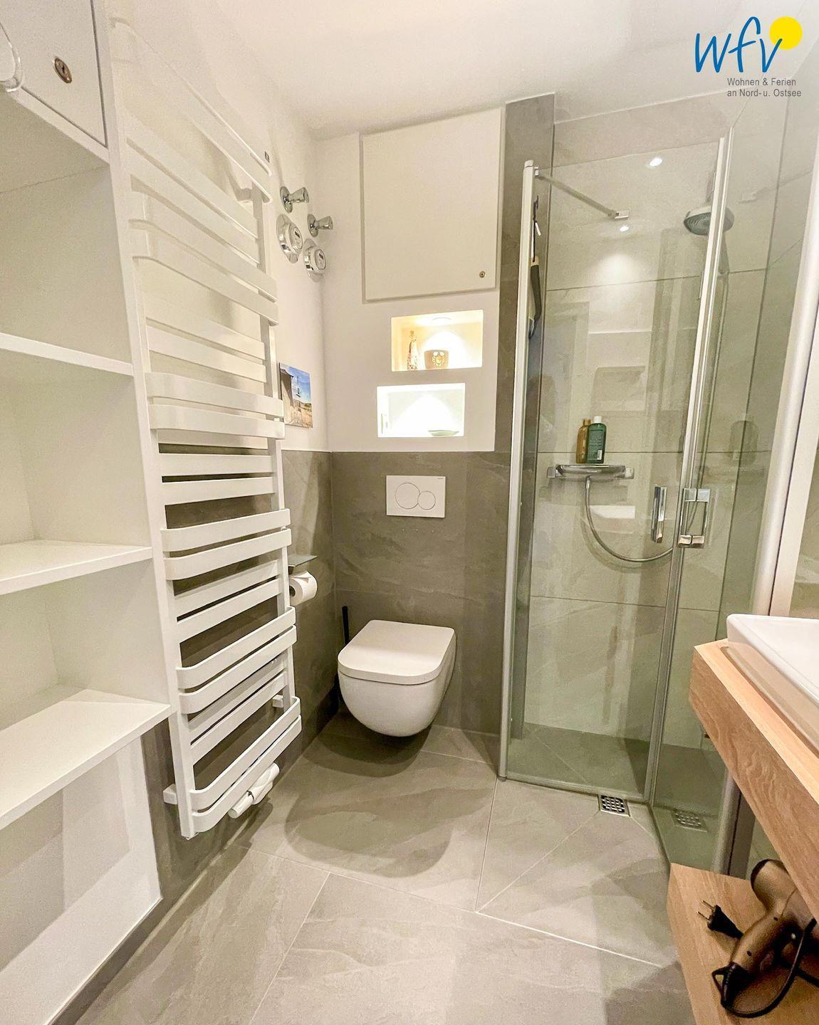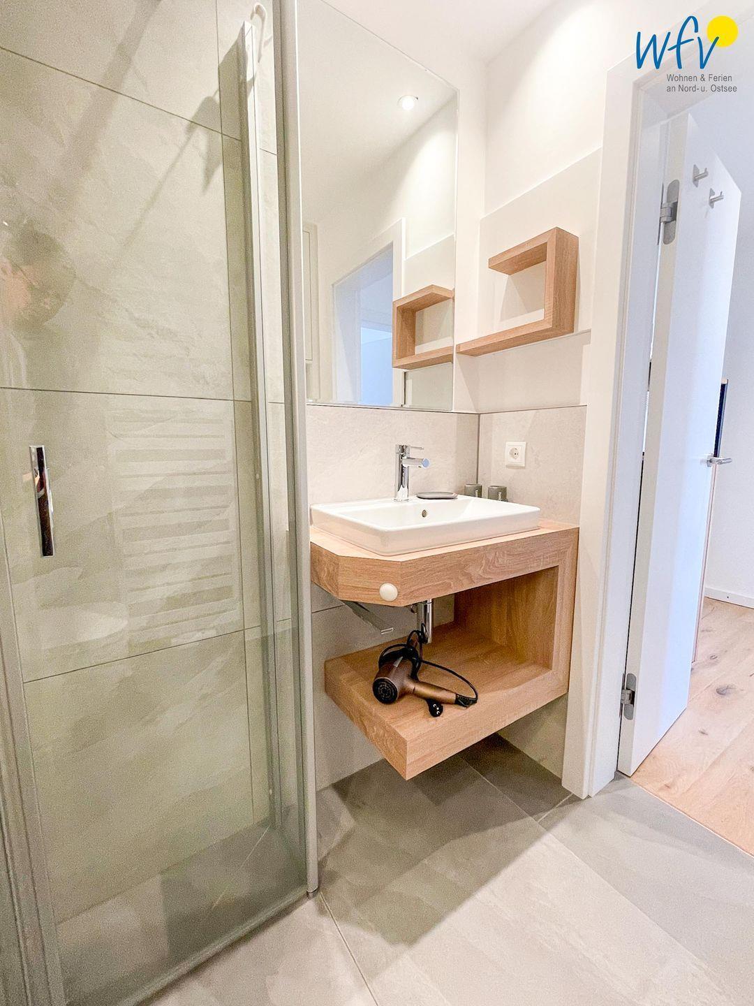 Für zusätzlichen Wohnkomfort sorgt das elegante Badezimmer mit Dusche, Waschtisch, Spiegelschrank, Föhn und Handtuchheizung.