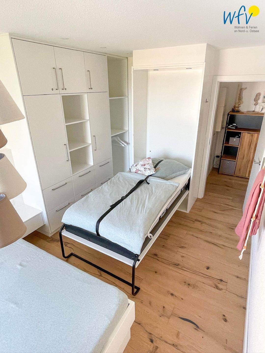 Wenn auf Wangerooge die Sonne untergeht, bieten Ihnen das separate Schlafzimmer einen wohligen Rückzugsort. Ausgestattet ist es mit einem Doppelbett (180 cm x 200 cm) und einem Schrankbett (90 x 200 cm). Für Ihre Urlaubsgarderobe ist ein geräumiger Kleiderschrank vorhanden. Auch von diesem Raum aus haben Sie einen sehr schönen Meerblick. Das Sofa im Wohnraum kann schnell und bequem zu einem Bett umfunktioniert werden (ohne Matratze) und dient ebenfalls als Schlafmöglichkeit (160 x 200 cm).
