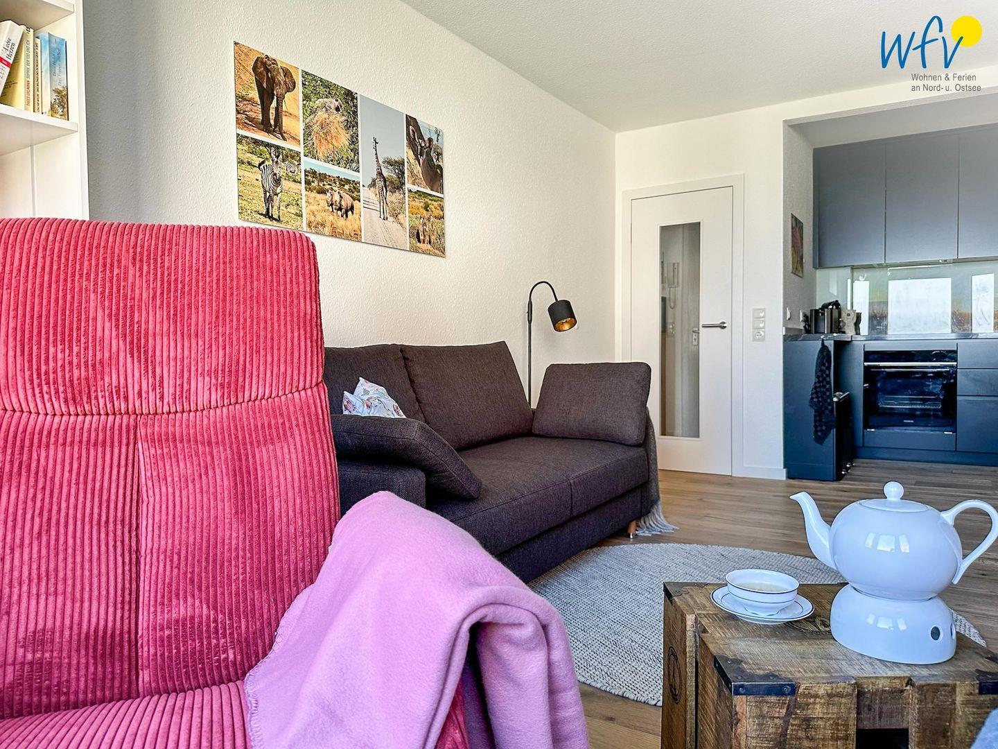 Zur Entspannung nach dem Strandtag oder der Wattwanderung lädt der helle Wohnraum mit Sofaecke und TV ein (Magenta TV und RTL plus frei nutzbar). Oder Sie genießen in den beiden Relaxsesseln am Fenster den einzigartigen Meerblick auf die Wellen der Nordsee und auf die Schifffahrtswege - ein wunderbares Urlaubsgefühl!