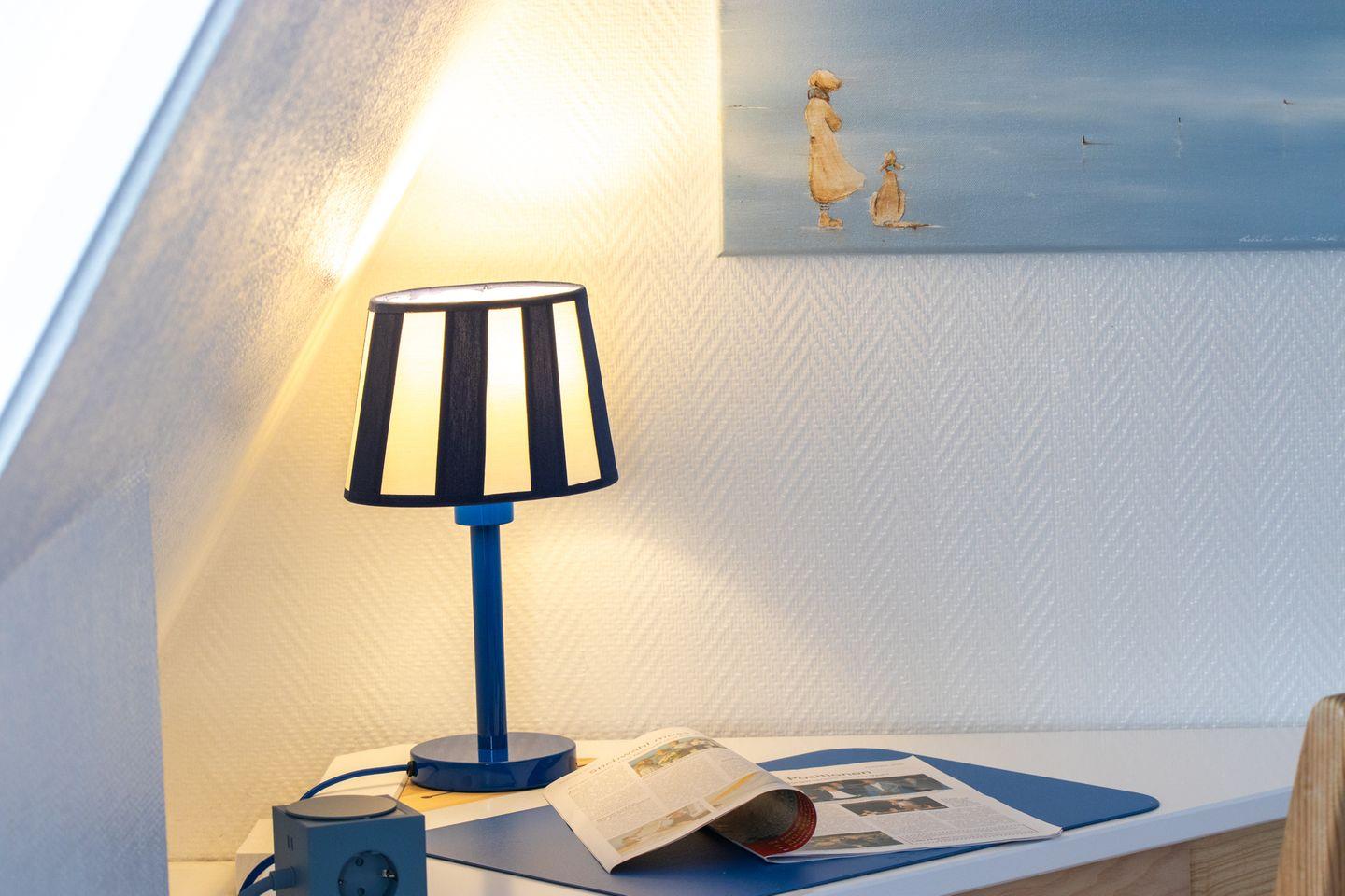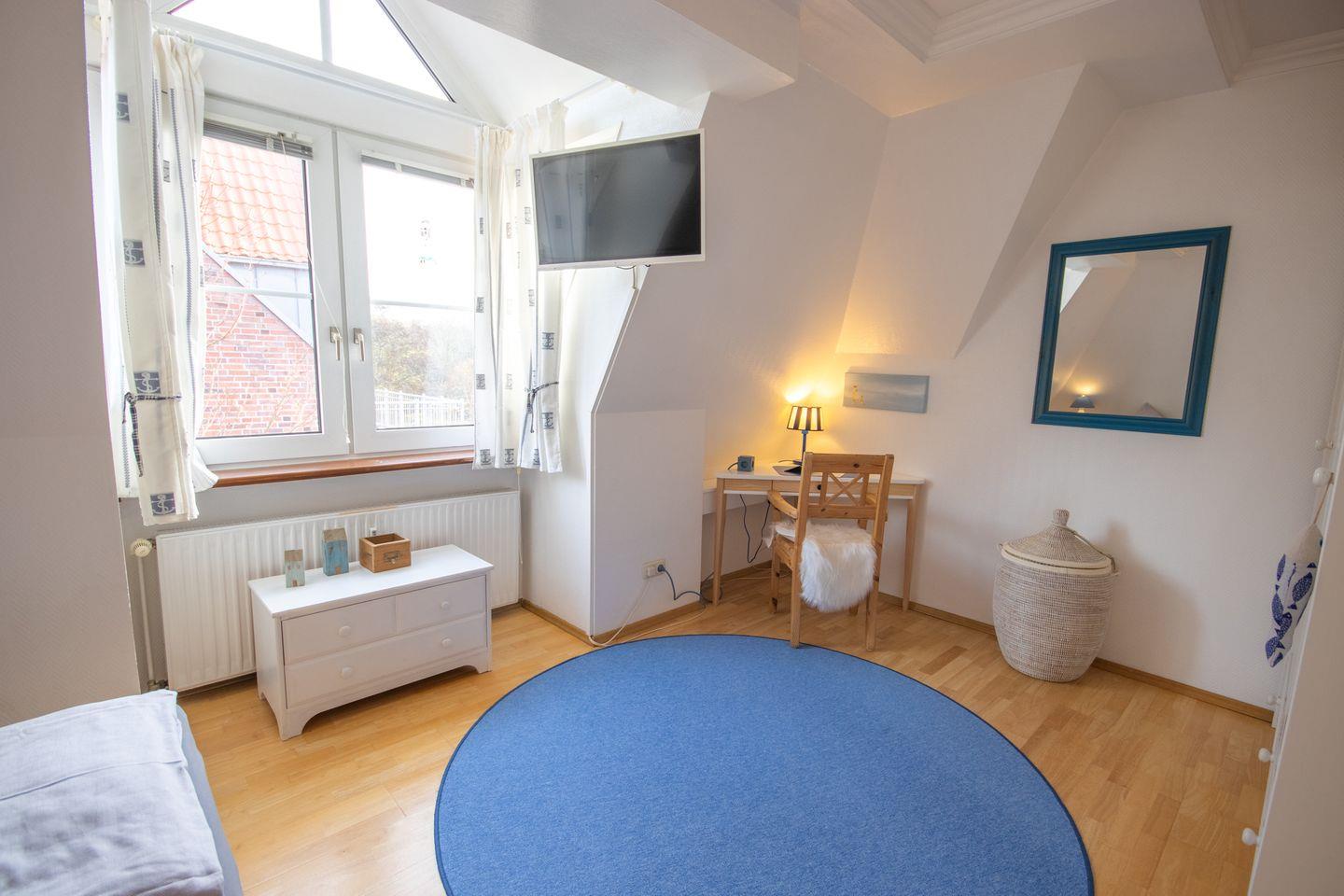 Schlafzimmer mit Extra: Ein gemütliches Bett für erholsame Nächte und ein Schreibtisch, falls der Laptop doch mal mit in den Koffer musste.