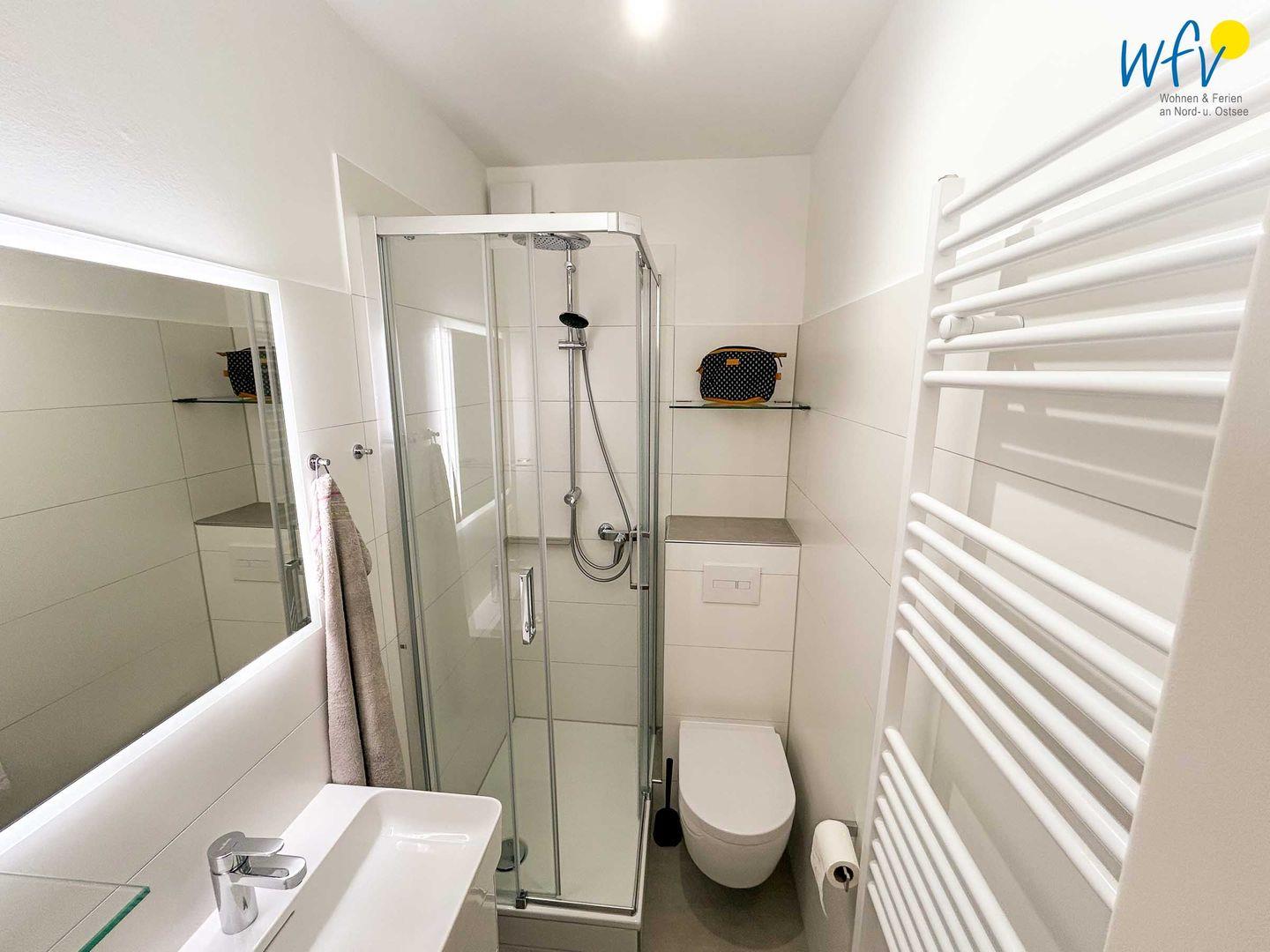 Nach einem Tag an der frischen Nordseeluft können Sie im eleganten Badezimmer in Ruhe abschalten und eine erfrischende Dusche genießen. Es verfügt zudem über Waschbecken, WC, einem beleuchteten und beheizbaren Spiegel und bietet Ihnen ausreichend Ablage- und Verstaumöglichkeiten für Ihre Bad- und Kosmetikutensilien.