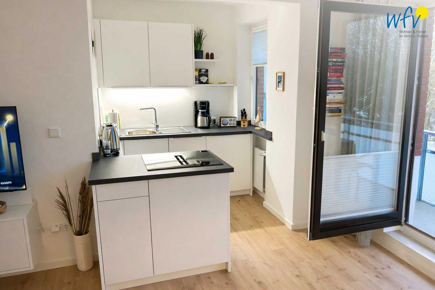 In der modernen offenen Küche lassen sich bequem kleine Snacks für den Ausflug oder leckere Mahlzeiten zubereiten. Ausgestattet ist die Küche u.a. mit einem 4-Zonen-Induktionskochfeld mit integriertem Dunstabzug, einem Geschirrspüler und einem Kühlschrank sowie mit diversen Kleingeräten (Kaffeemaschine, Wasserkocher, Toaster etc.).