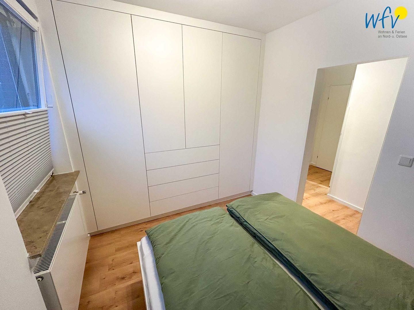 Das separate Schlafzimmer mit bequemem Doppelbett (160 x 200 cm) verspricht eine angenehme Nachtruhe. Ein geräumiger Kleiderschrank bietet Ihnen viel Platz. Im Flur befindet sich zudem eine funktionale Garderobe.