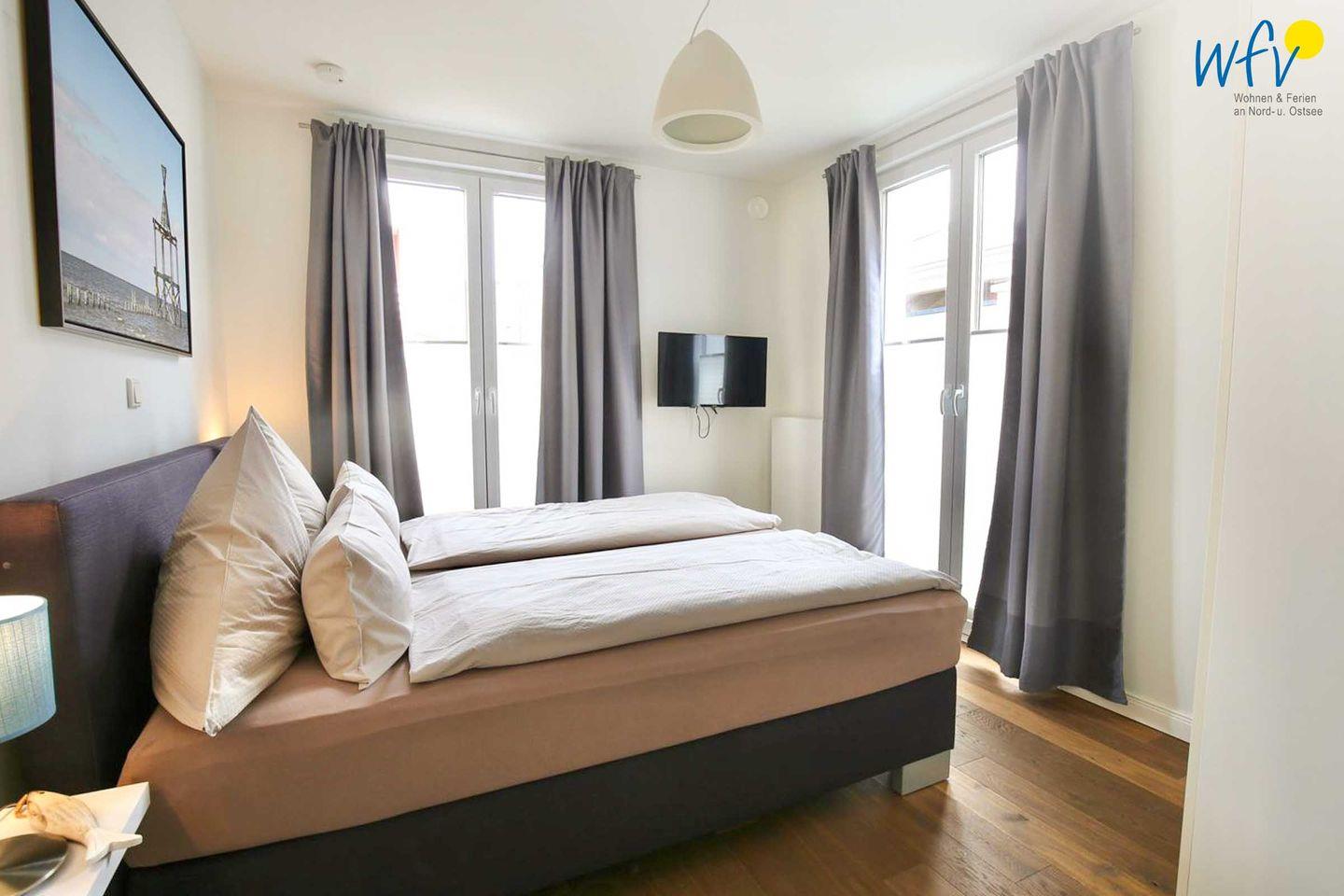 Für eine angenehme Nachtruhe sind die zwei separaten Schlafzimmer mit einem komfortablen Doppelbett eingerichtet (jeweils 180 x 200 cm). Auch hier wurden Flatscreens installiert, sodass Sie gemütlich fernsehen können. Kleiderschränke bieten Platz für Ihre Urlaubsgarderobe.