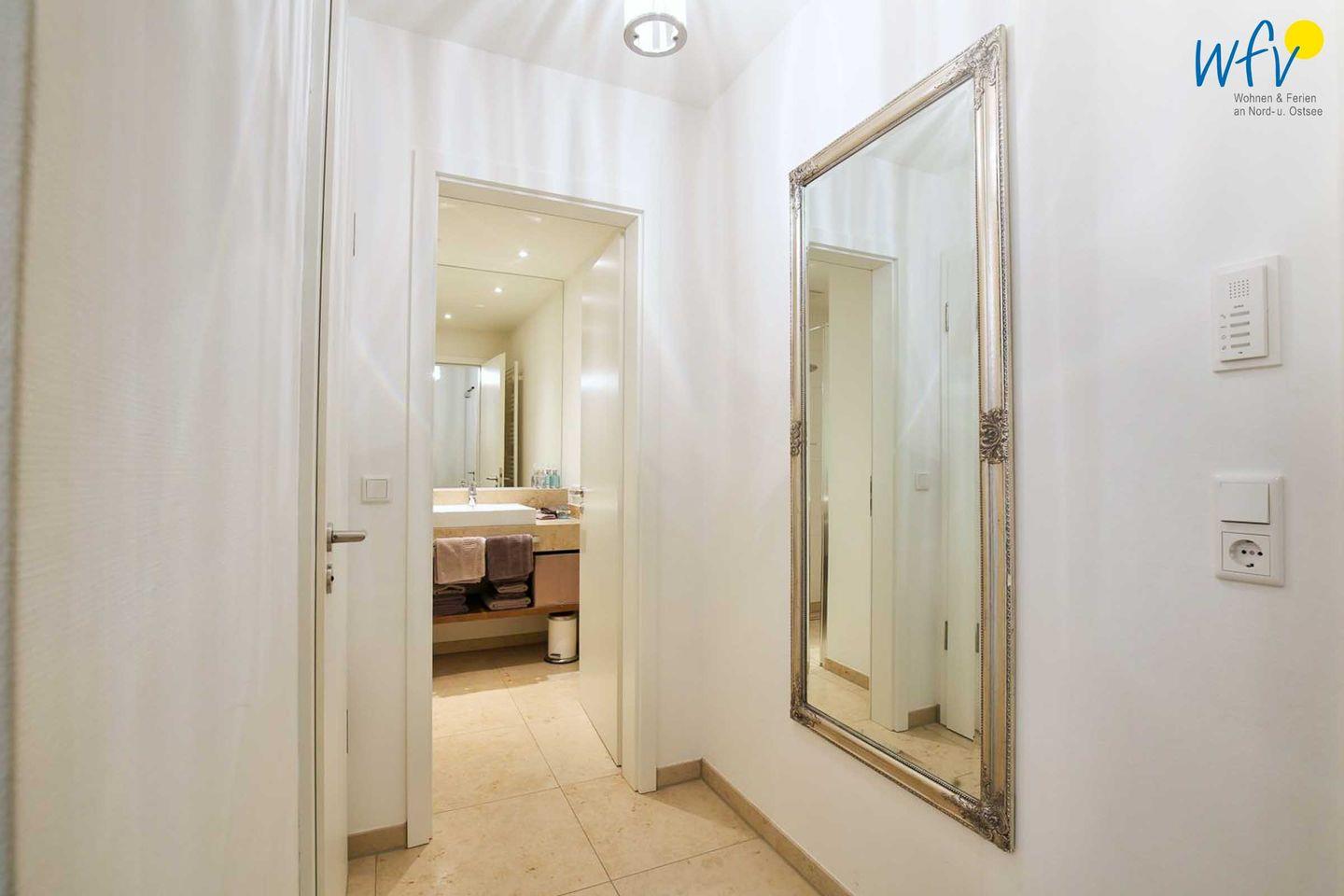 Das elegante Bad mit geräumiger ebenerdiger Dusche, breitem Waschtisch, Handtuchheizung und großem Spiegel sorgt für zusätzlichen Wohnkomfort. Das separate WC entspannt die Badezimmerroutinen.