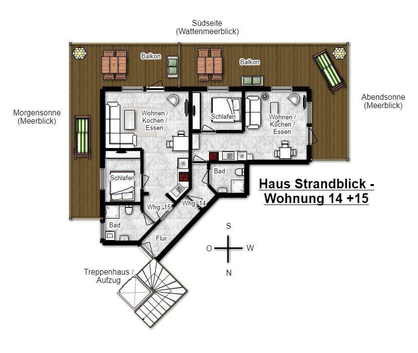 Tipp: Das Besondere für zwei Paare: Die identischen Wohnungen (14+15) sind durch einen Flur erreichbar und bieten somit hohen Komfort für 4 Personen (s. Grundriss)! Noch Fragen? Dann melden Sie sich bei unserer Buchungshotline unter der 0202 - 280 305!