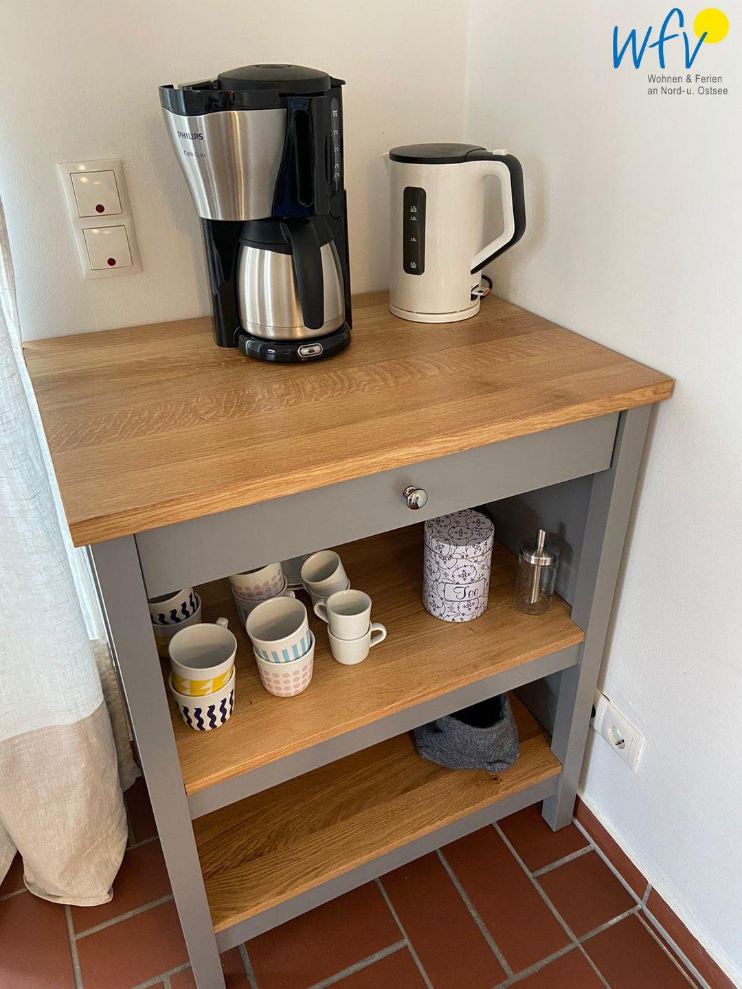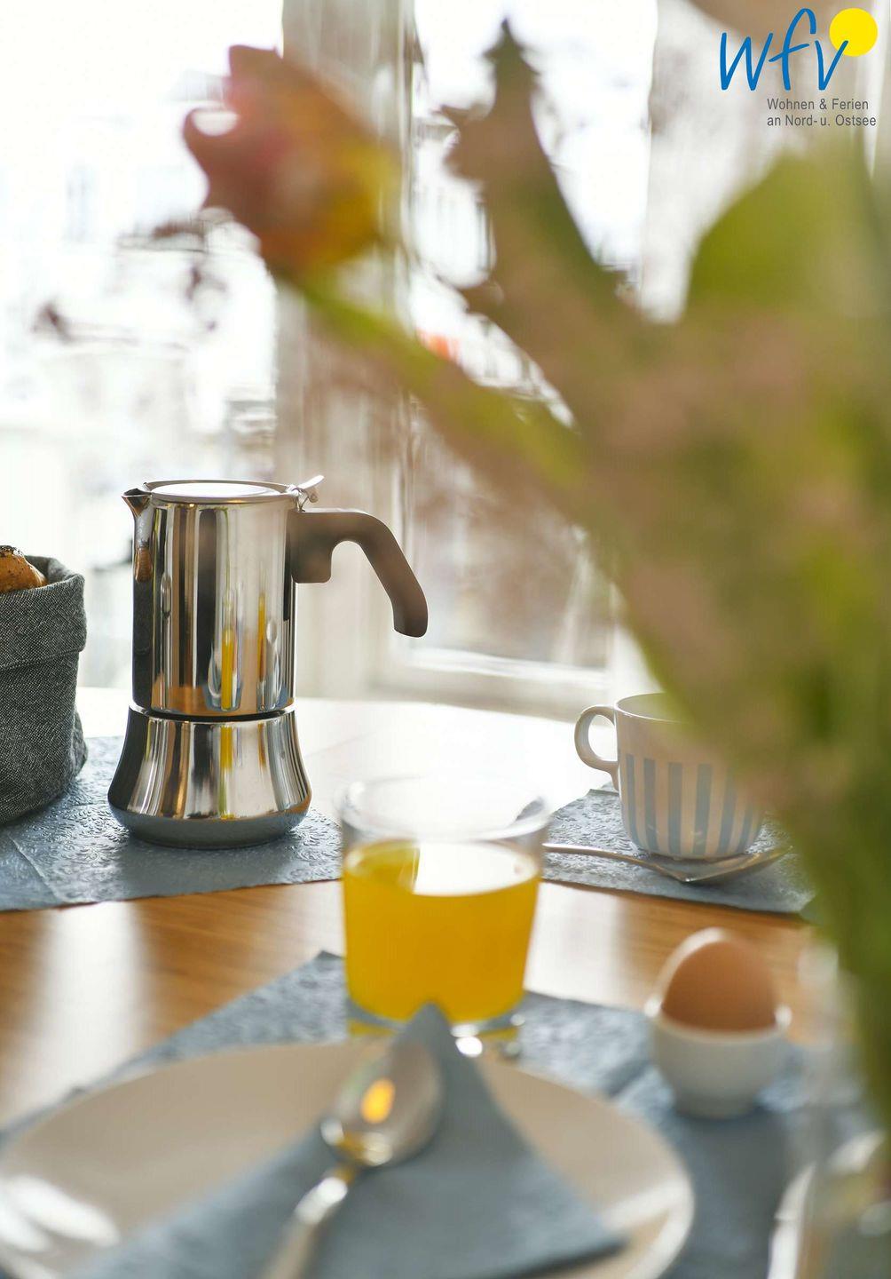 Der Urlaubstag startet bereits entspannt, wenn Sie an dem hübschen kleinen Esstisch die ersten Urlaubspläne schmieden. Die warmen Frühstücksbrötchen wurden in der integrierten Küche mit Backofen zubereitet. Den Abwasch übernimmt die Spülmaschine, während Sie schon die Badesachen für den Strandtag packen oder die Fahrräder für die Tour über die Insel holen.