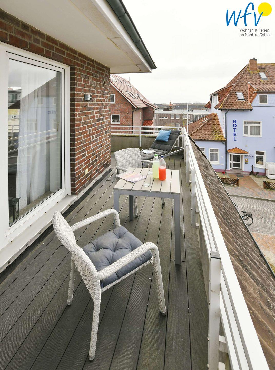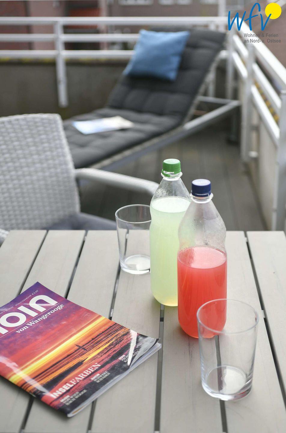 Highlight unserer Ferienwohnung auf Wangerooge ist der herrliche Süd-West-Balkon! Auf Gartenmöbeln und Sonnenliegen können Sie es sich rundum gemütlich machen. Die Nordsee und das Wattenmeer sind bereits zu sehen (seitl.) und nur wenige Meter entfernt.