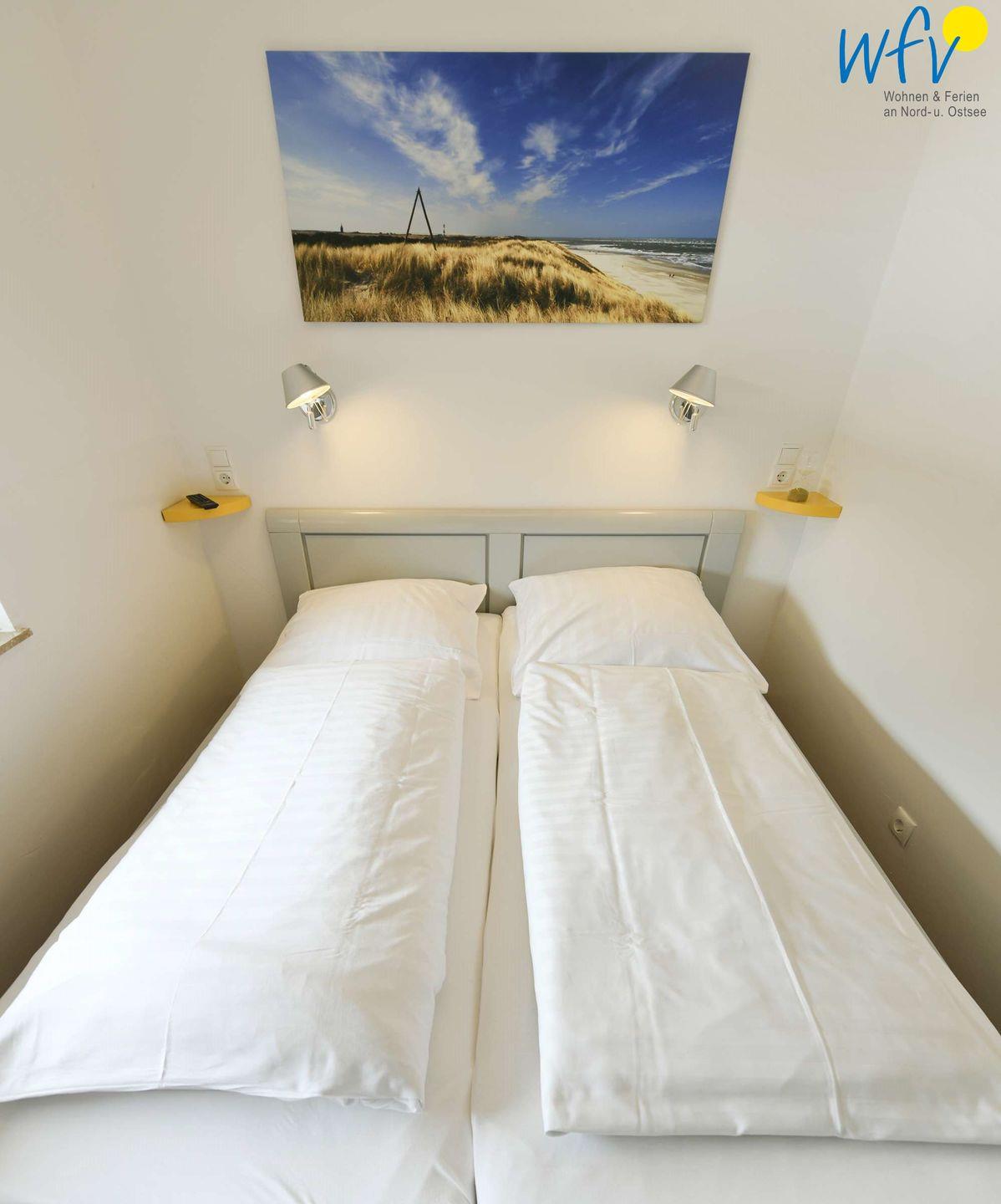 Wenn auf Wangerooge die Sonne untergeht, wartet auf Sie ein bequemes Doppelbett ( 1,70m ) im separaten Schlafzimmer. Auch vom Bett aus können Sie gemütlich TV schauen. Ihre Urlaubsgarderobe findet Platz im Kleiderschrank.