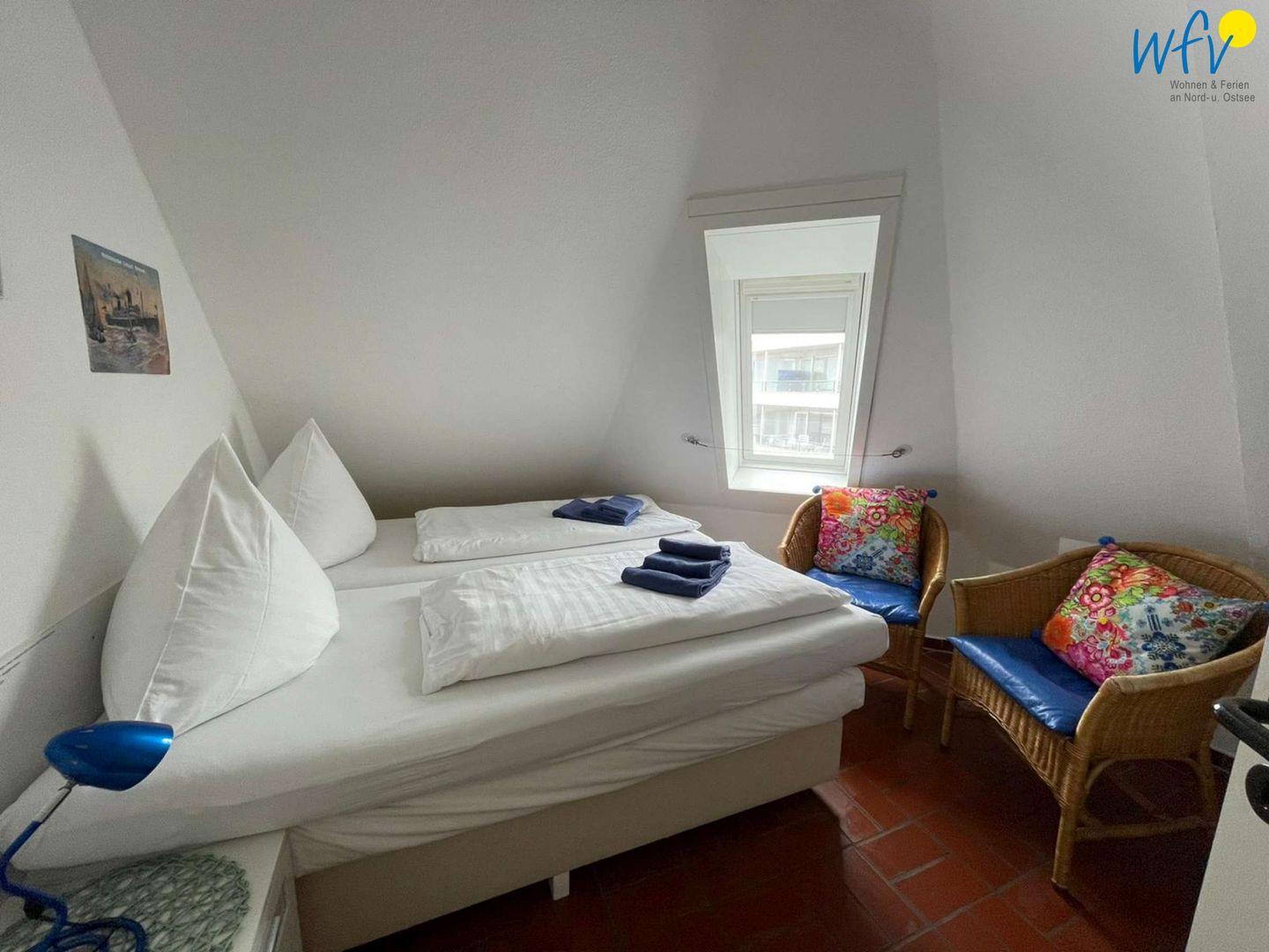 Das separate Schlafzimmer der "Ferienwohnung Meerblick 18" besteht aus 2 zu einem Doppelbett zusammengestellten Betten und bietet auf einer Breite von 180 cm Platz für 2 Personen. Eine Ausweichschlafmöglichkeit für eine Person bietet die Bettcouch im Wohnbereich. 2 Personen, in Ausnahmefällen auch drei, können so in der Wohnung einen erholsamen Urlaub verbringen.