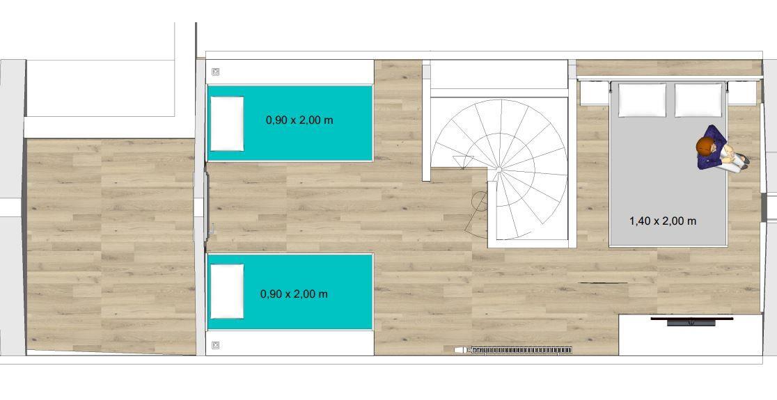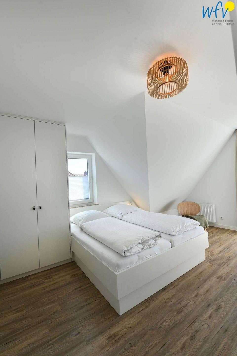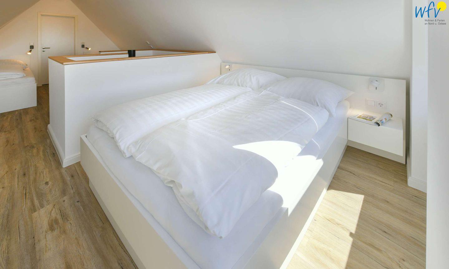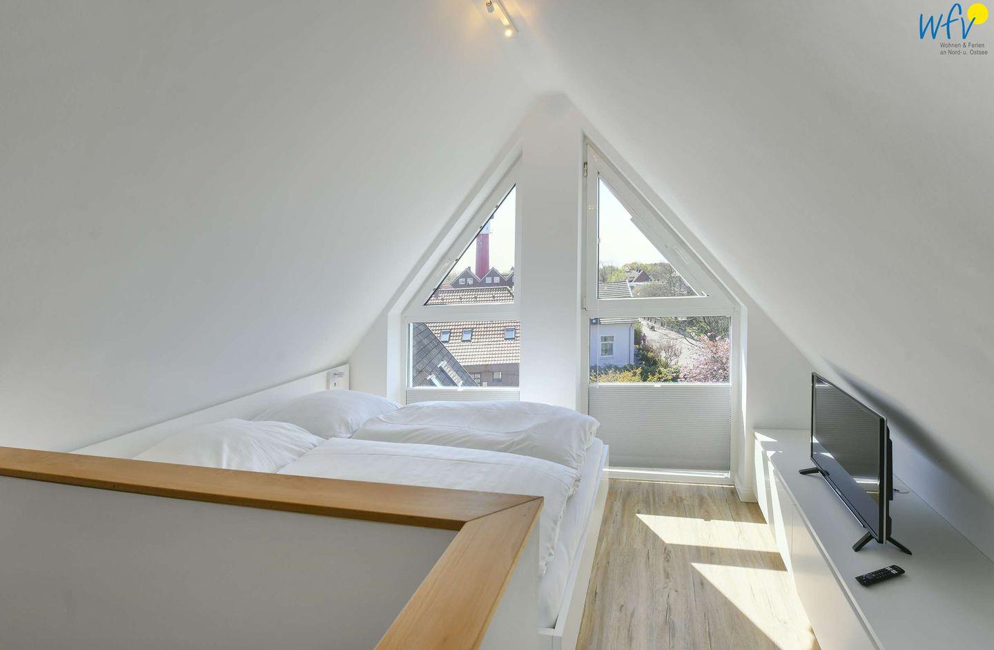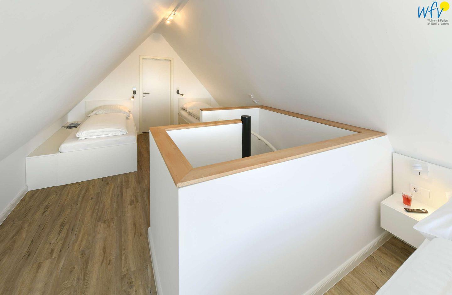 Über eine Wendeltreppe im Flur gelangen Sie auf die Galerie im Dachgeschoss. Hier befindet sich das zweite separate Schlafzimmer der Ferienwohnung auf Wangerooge. Dieses ist mit einem Doppelbett (1,40 m) und zwei Einzelbetten sowie einem weiteren SmartTV ausgestattet.