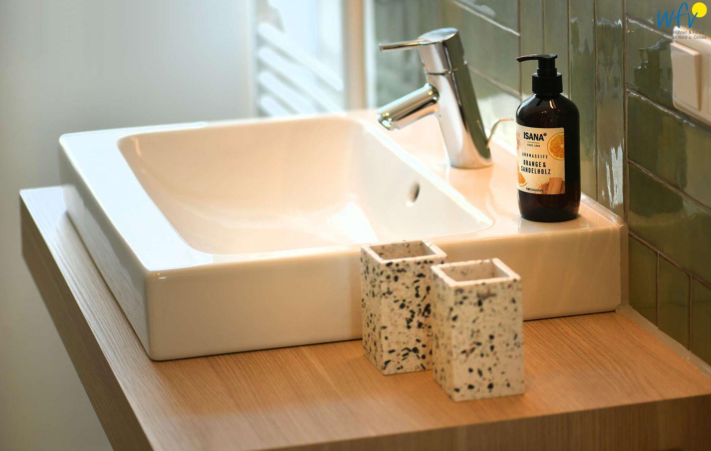 Weiteren Wohnkomfort bietet Ihnen das gepflegte Duschbad in exquisitem Design: Metrofliesen an der Wand, Bodenfliesen in Betonoptik, ein passgenauer Unterschrank vom Tischler und ein hinterleuchteter Spiegel machen auch diesen Raum zu einem Wohlfühlort. Eine Waschmaschine steht zur Verfügung.