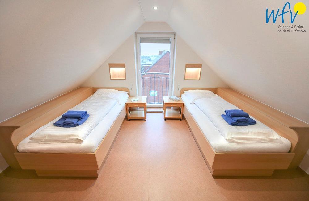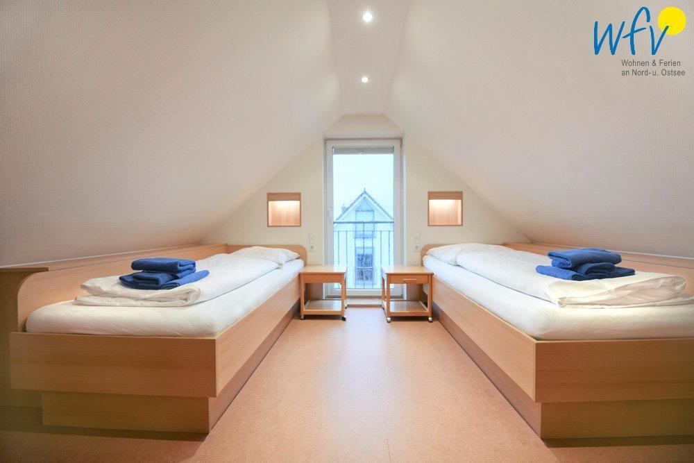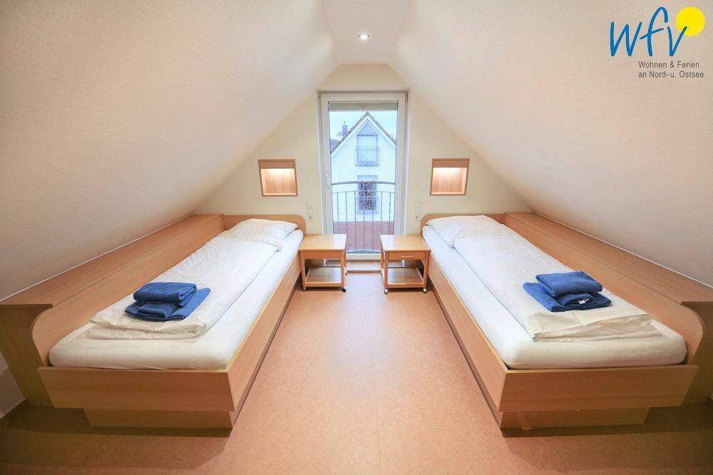 Optimale Rückzugsmöglichkeiten bieten Ihnen die vier separaten Schlafzimmer der Wangerooger Ferienwohnung. Zwei der Zimmer sind mit einem Doppelbett eingerichtet, die anderen beiden mit jeweils zwei Einzelbetten.