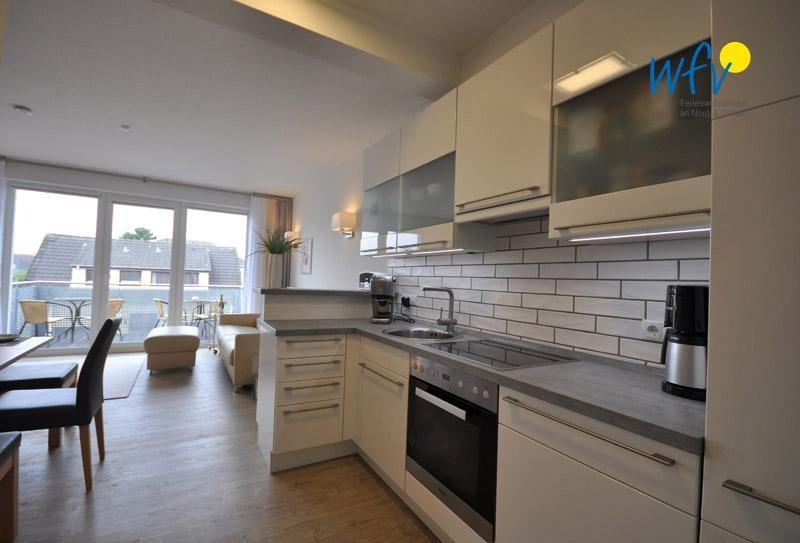 Für eine bequeme Selbstverpflegung und gemeinsame Kochabende verfügt die moderne offene Wohnküche u.a. über einen 4-Plattenherd und eine Geschirrspülmaschine aus dem Hause "Miele", einen Kühlschrank mit kleinem Gefrierfach sowie über diverse Kleingeräte.