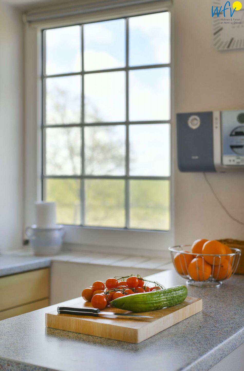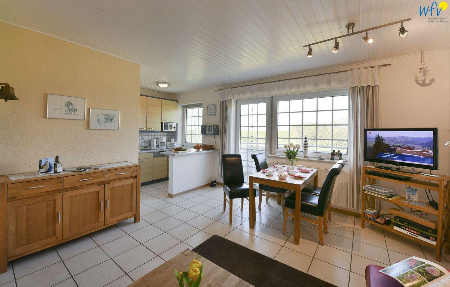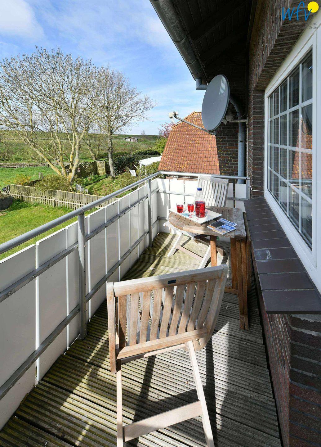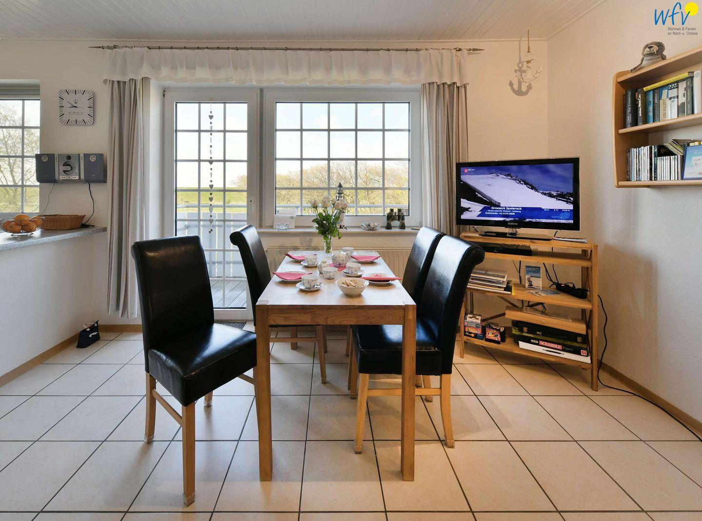 Die bequeme Couchecke mit Satellit-TV (Flachbildschirm), DVD-Player und Stereoanlage lädt zum ausgiebigen Entspannen ein. Vom Esstisch aus genießen Sie einen schönen Blick auf den Deich. Und auch auf dem sonnigen Südbalkon mit herrlichem Ausblick ins Grüne werden Sie sich rundum wohlfühlen - der perfekte Ort für Erholung an der frischen Nordseeluft!