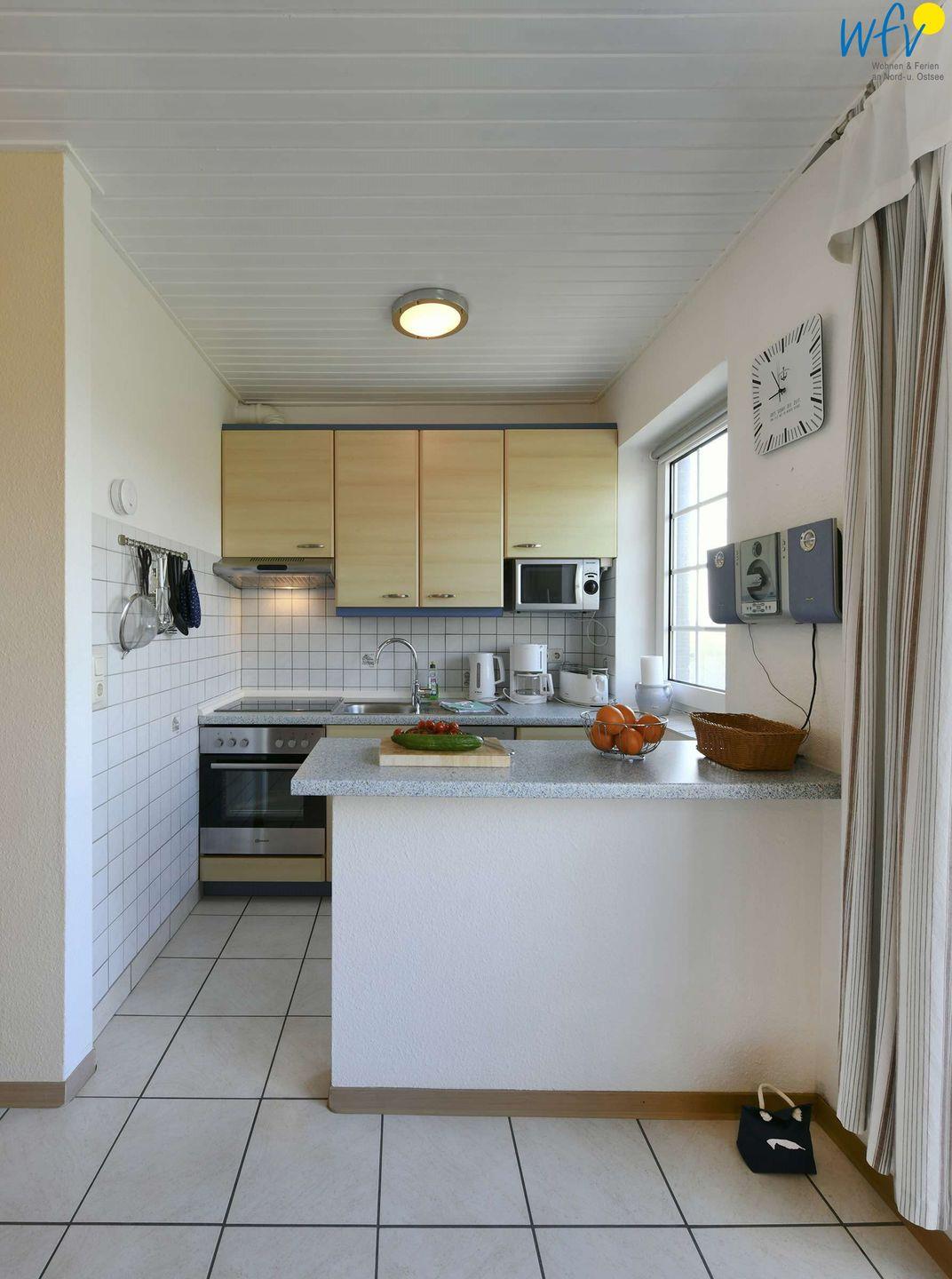 Die Kochnische im Wohnzimmer ermöglicht Ihnen eine angenehme Selbstverpflegung; sie ist u.a. mit Spülmaschine, Ceranfeld, Backofen und Mikrowelle ausgestattet. Die Küche und das Wohnzimmer sind durch eine praktische Sidebar voneinander getrennt.