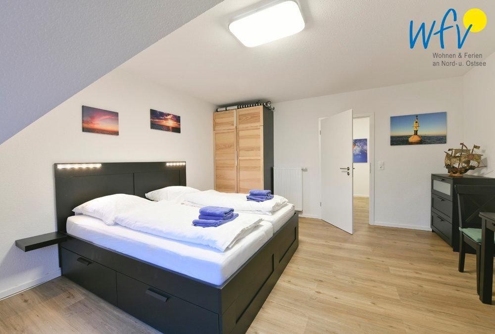 Die beiden separaten Schlafzimmer sind jeweils mit einem Doppelbett sowie einem TV eingerichtet; gemütliches Flair sorgt hier für Entspannung. Außerdem befindet sich im Flur des Dachgeschosses ein komfortables Schrankbett (für eine Person).