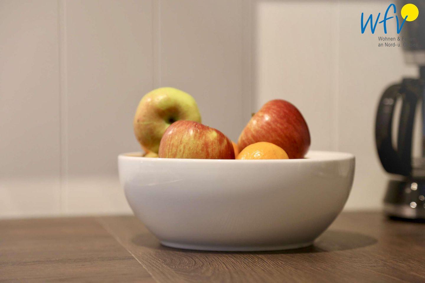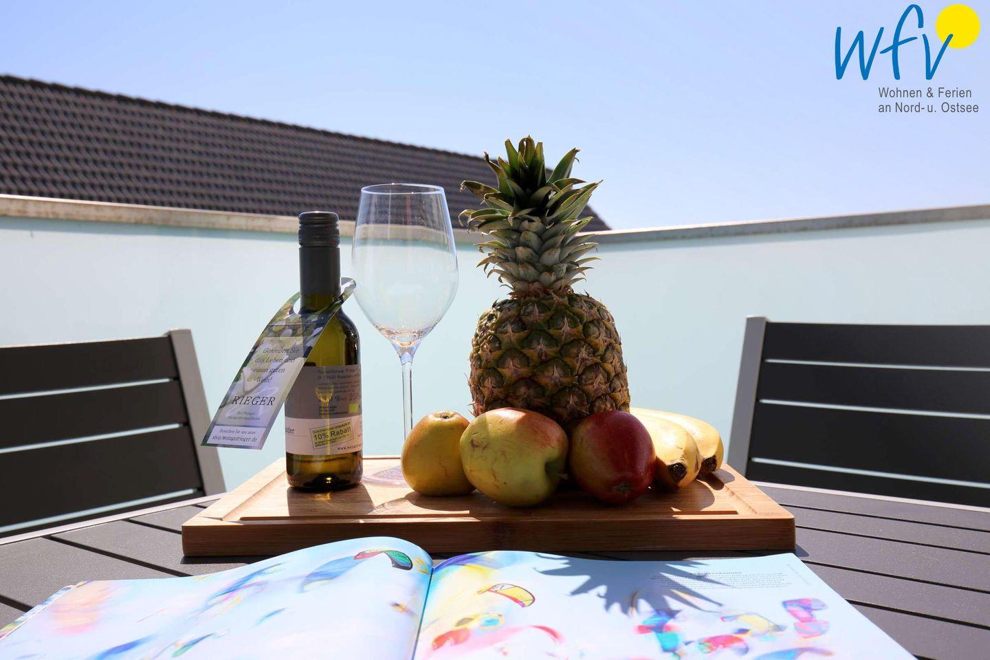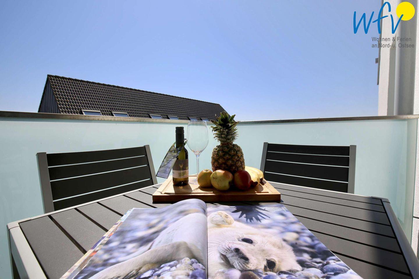 Bei gutem Wetter können Sie das gemütliche Essen auch nach draußen verlagern: Auf dem sonnigen Balkon befinden sich Sitzmöbel für vier Personen sowie ein Strandkorb. Nehmen Sie sich Ihr Lieblingsbuch zur Hand, trinken Sie eine Tasse Kaffee und schalten Sie einfach mal ab. Abends eignet sich der Balkon perfekt für einen gemeinsamen Sundowner. Frische Nordseeluft, sonnige Stunden und ein schöner Ausblick garantieren absolute Erholung...