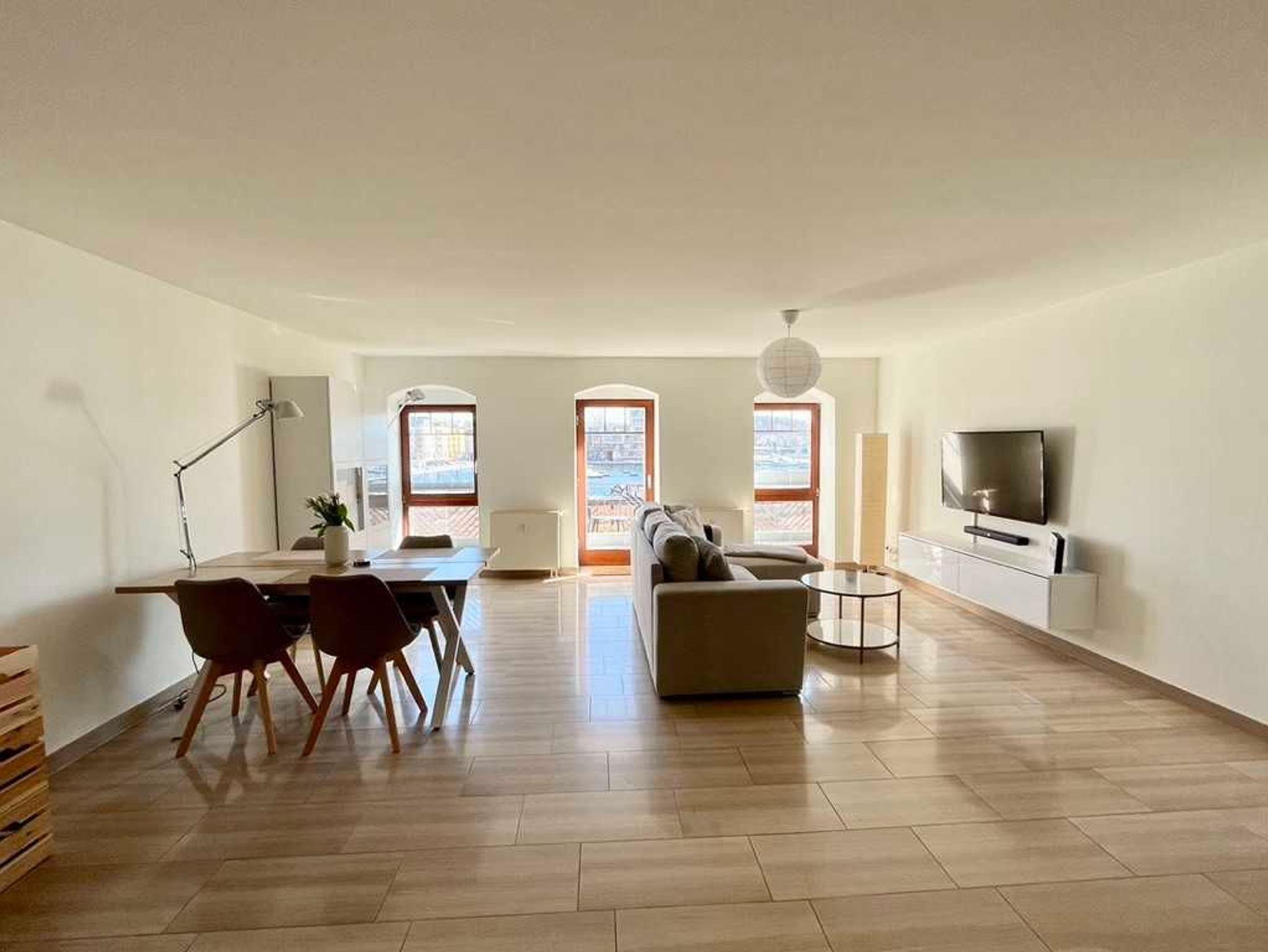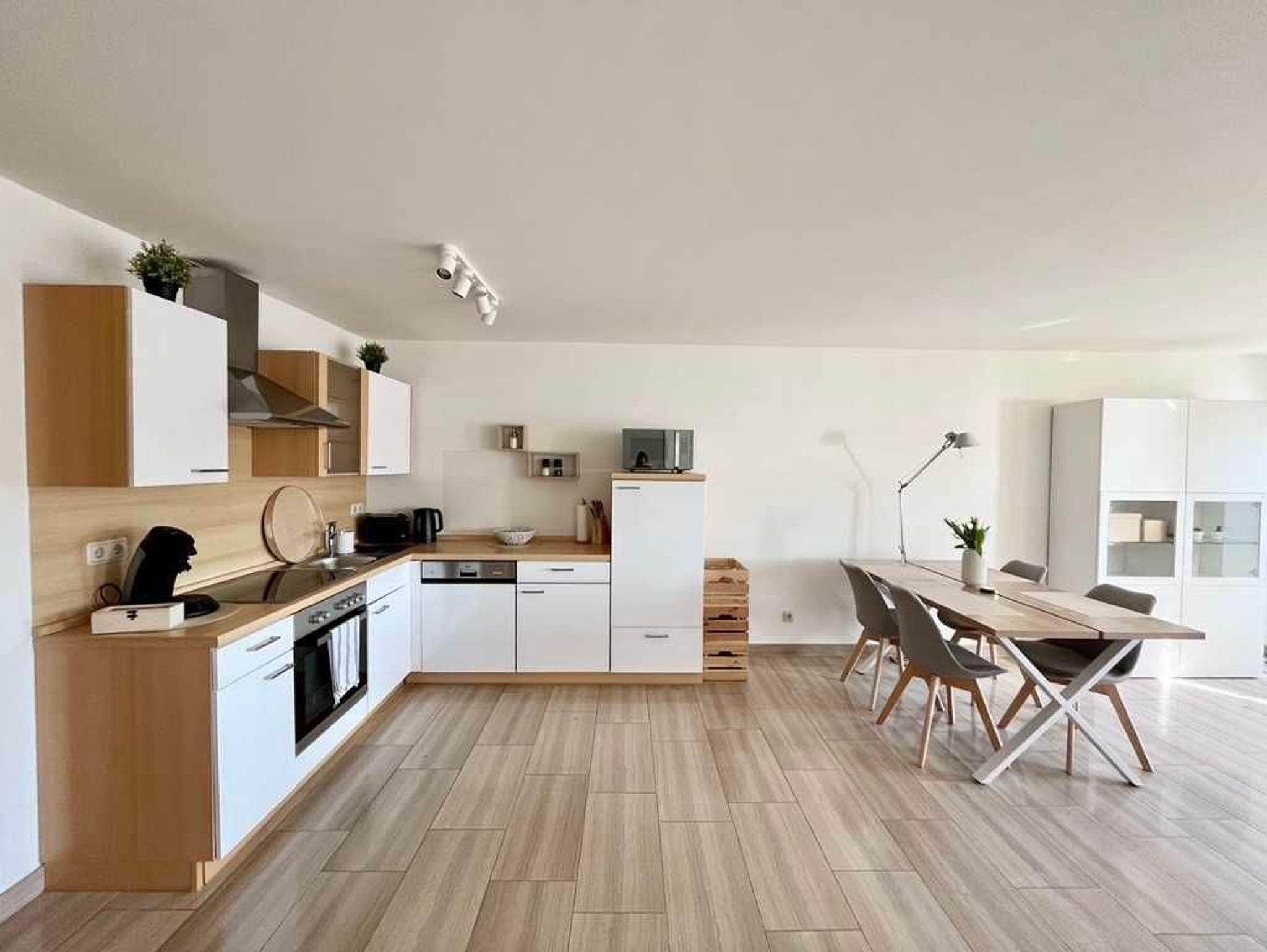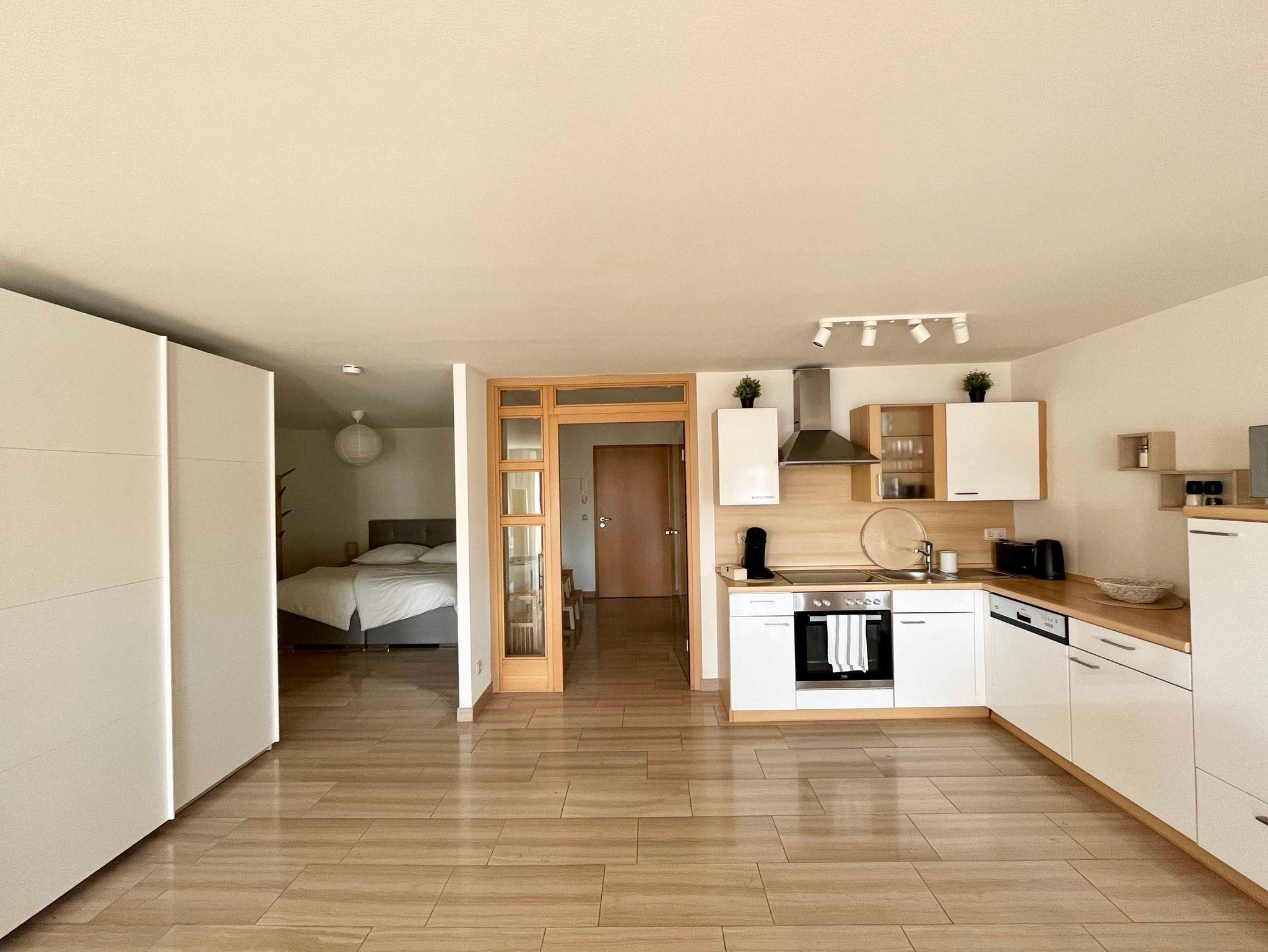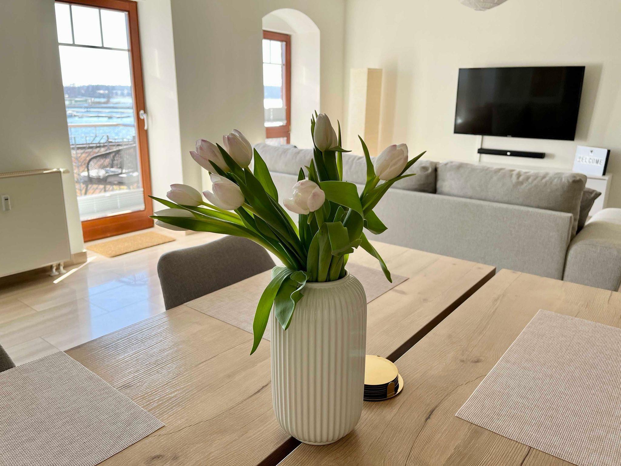 Über den Flur gelangen Sie durch eine große Glastür zum hellen und modern eingerichteten Wohn- und Essbereich. Sogar aus dem offenen Schlafbereich bietet sich ein traumhafter Blick über den Stadthafen. Ein sehr hochwertiges 1,80 x 2,00 m Boxspringbett sowie gemütliche Bettdecken, Kissen und Bettwäsche in Bioqualität sorgen für einen gesunden und erholsamen Schlaf.