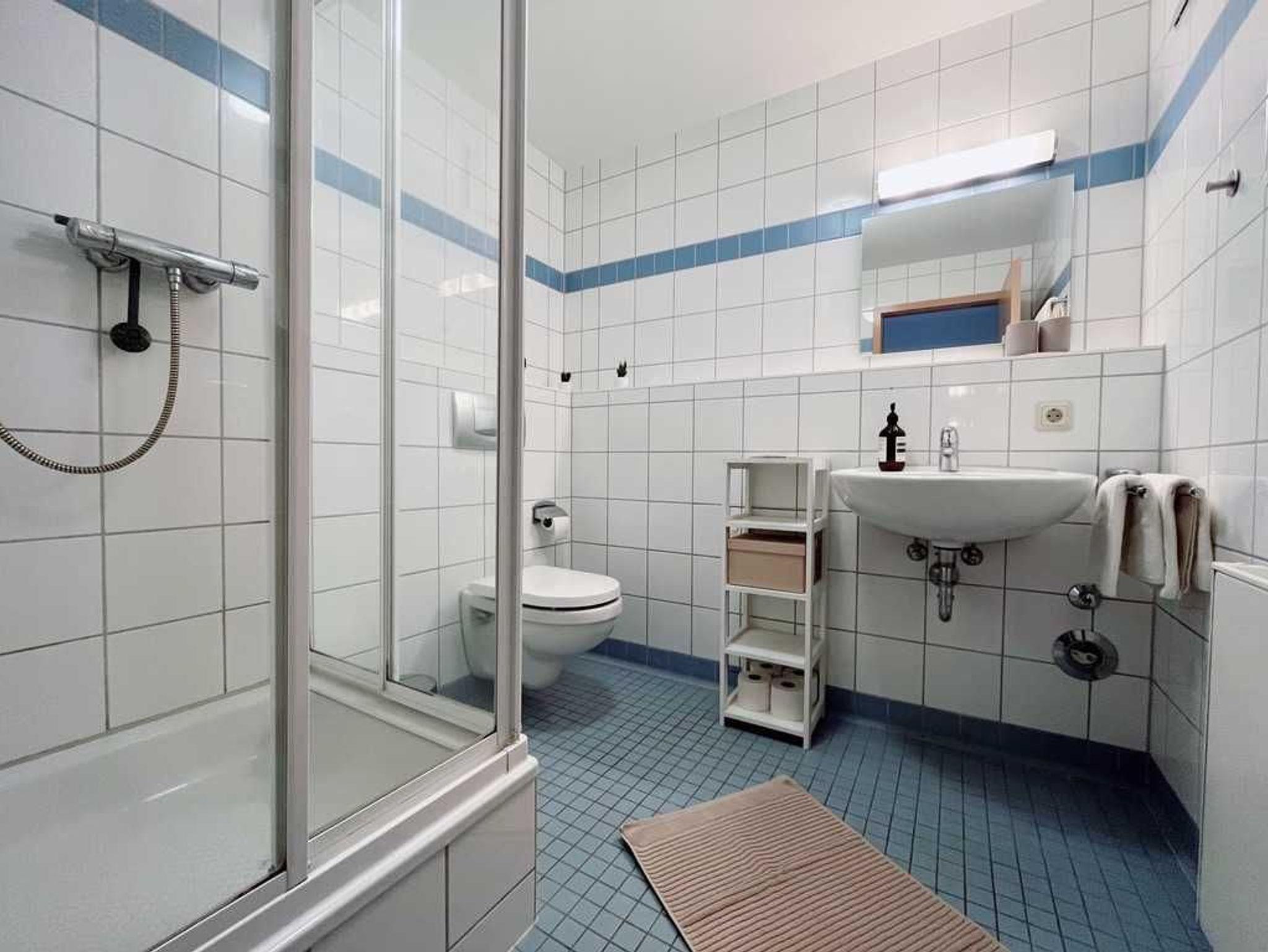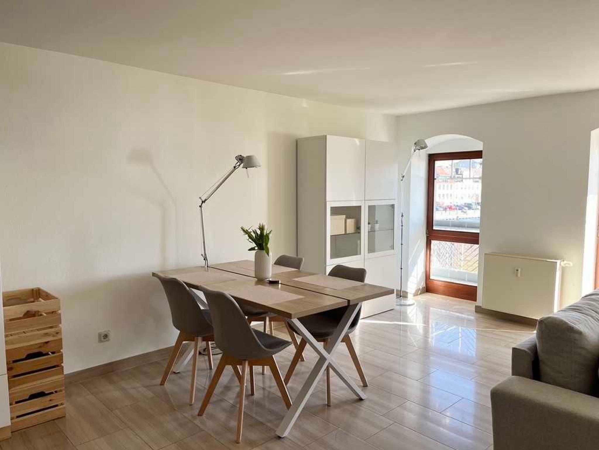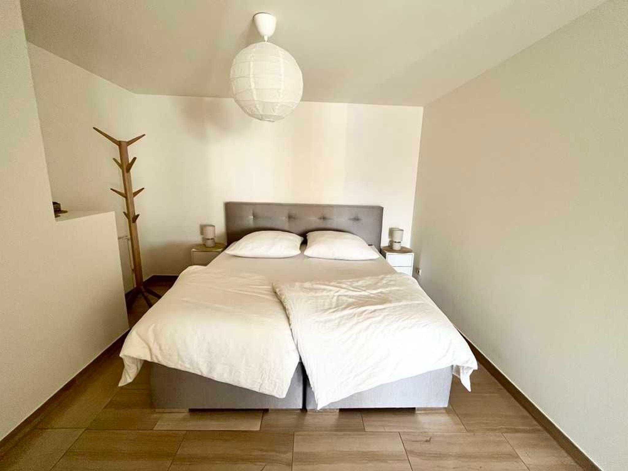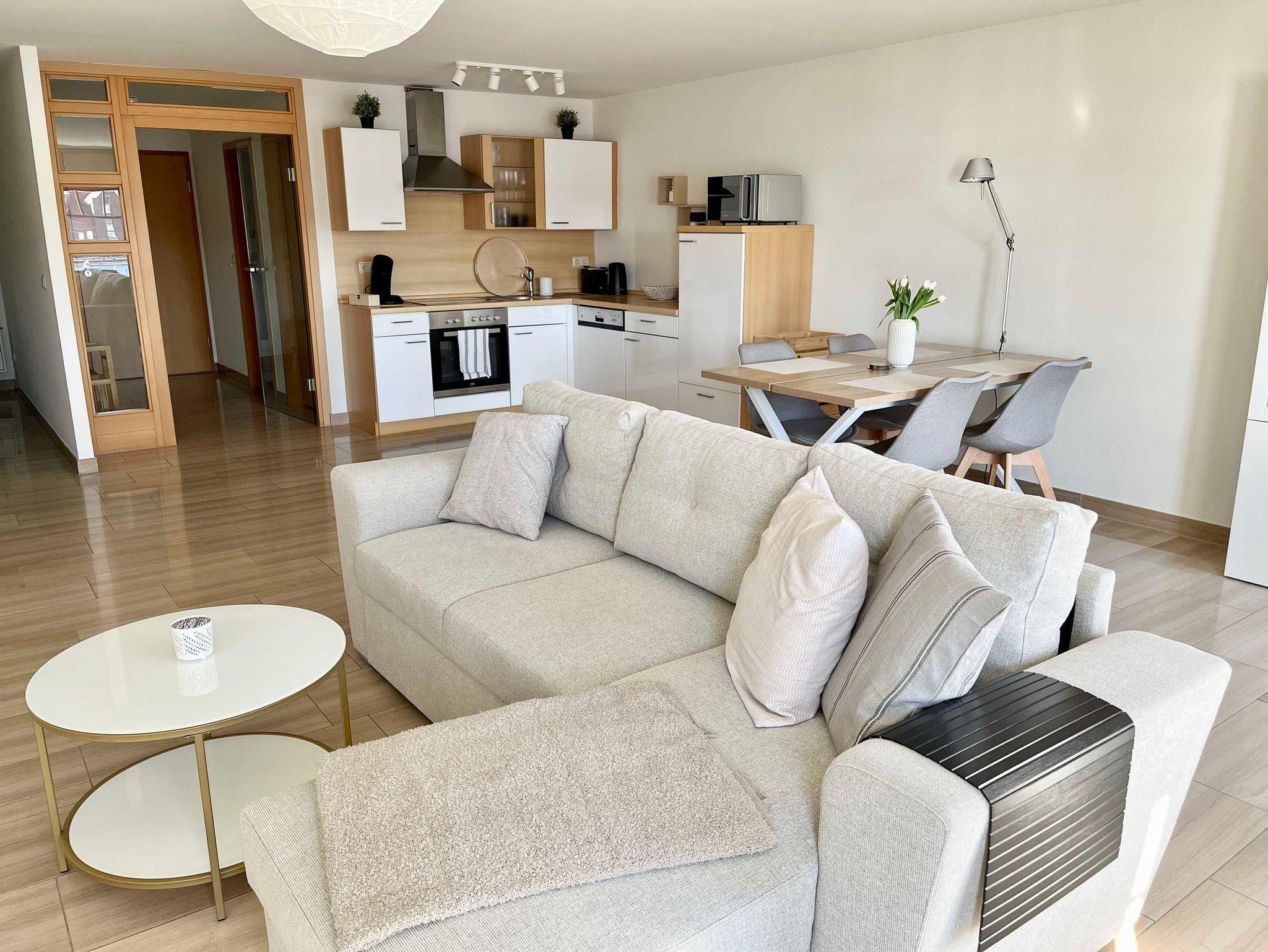 Über den Flur gelangen Sie durch eine große Glastür zum hellen und modern eingerichteten Wohn- und Essbereich. Sogar aus dem offenen Schlafbereich bietet sich ein traumhafter Blick über den Stadthafen. Ein sehr hochwertiges 1,80 x 2,00 m Boxspringbett sowie gemütliche Bettdecken, Kissen und Bettwäsche in Bioqualität sorgen für einen gesunden und erholsamen Schlaf.