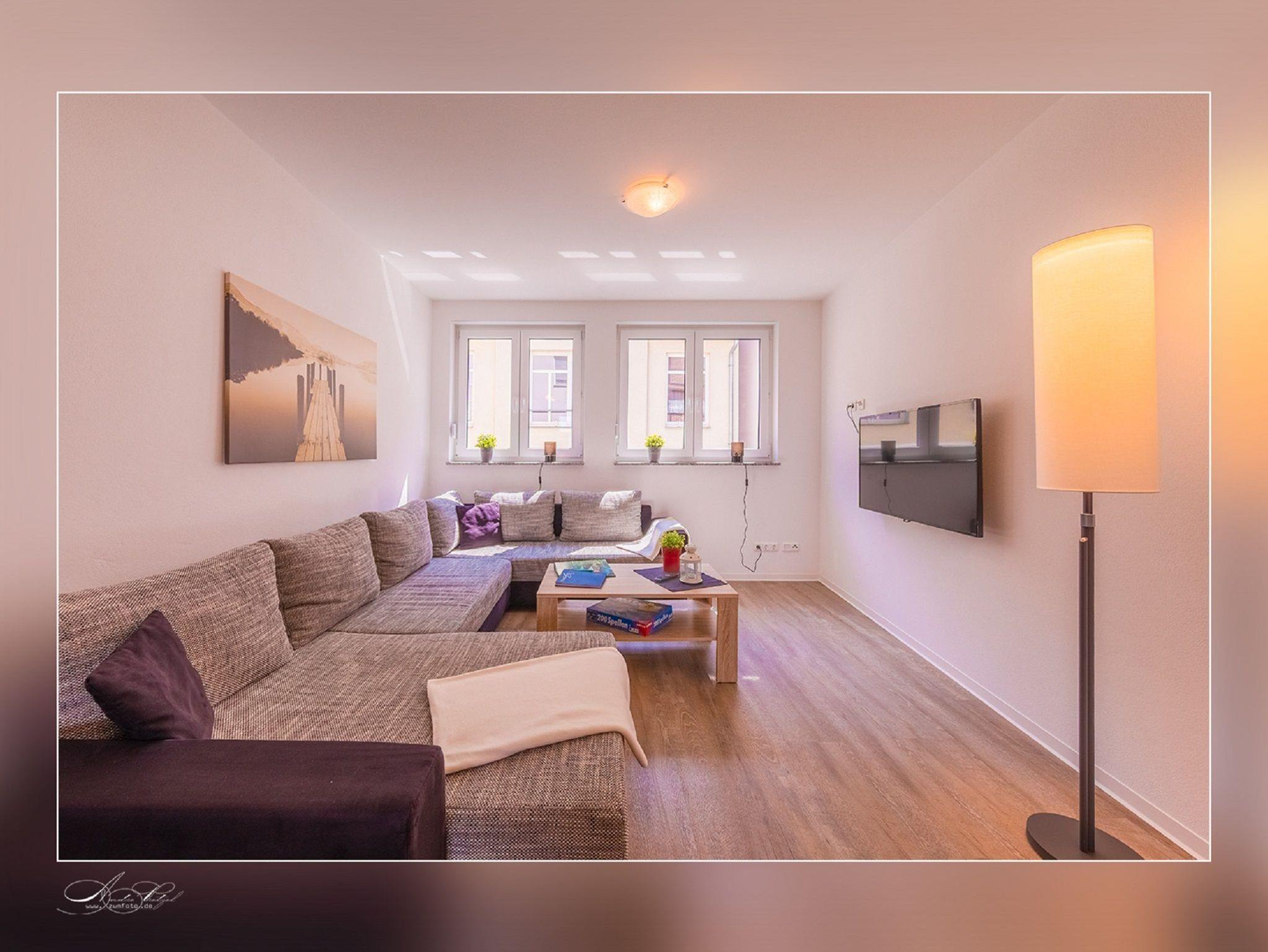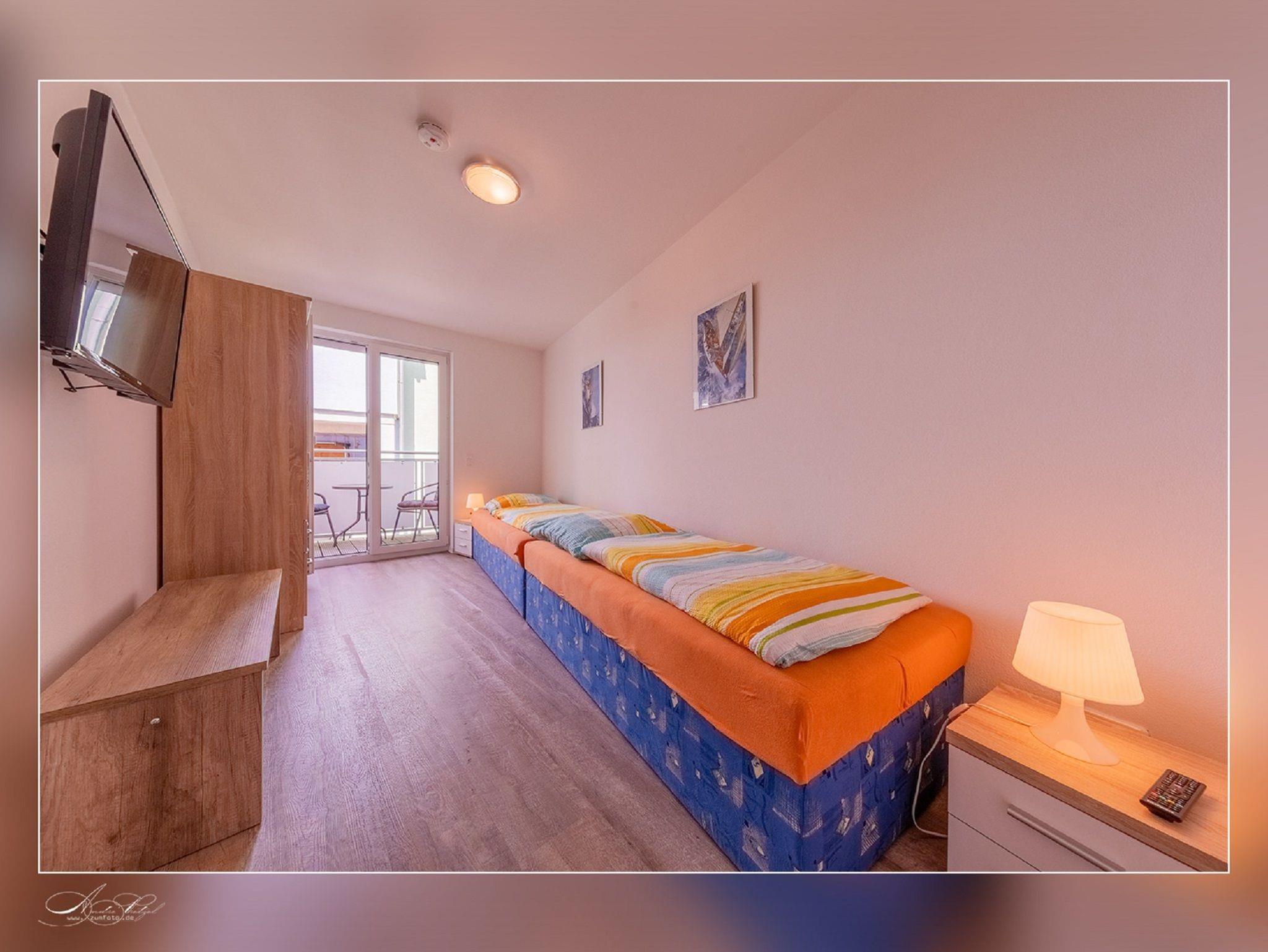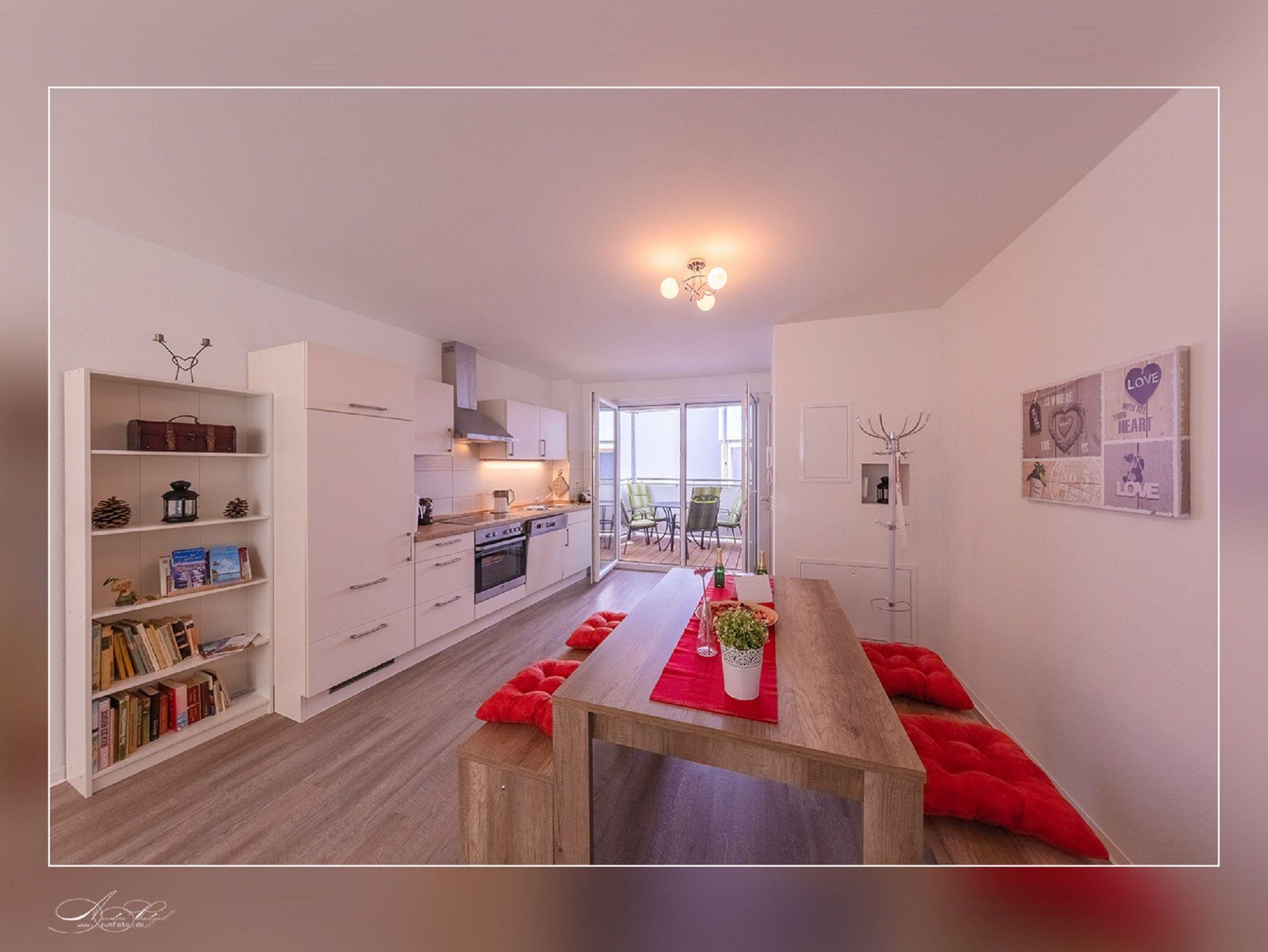 Die Ferienwohnung im 1. Obergeschoß ist 75 Quadratmeter groß und verfügt über W-Lan , 2 Balkone , 2 Schlafzimmer, einen gemütlichen Wohn- Essbereich mit Flachbildfernseher und einer voll ausgestatteten Einbauküche.