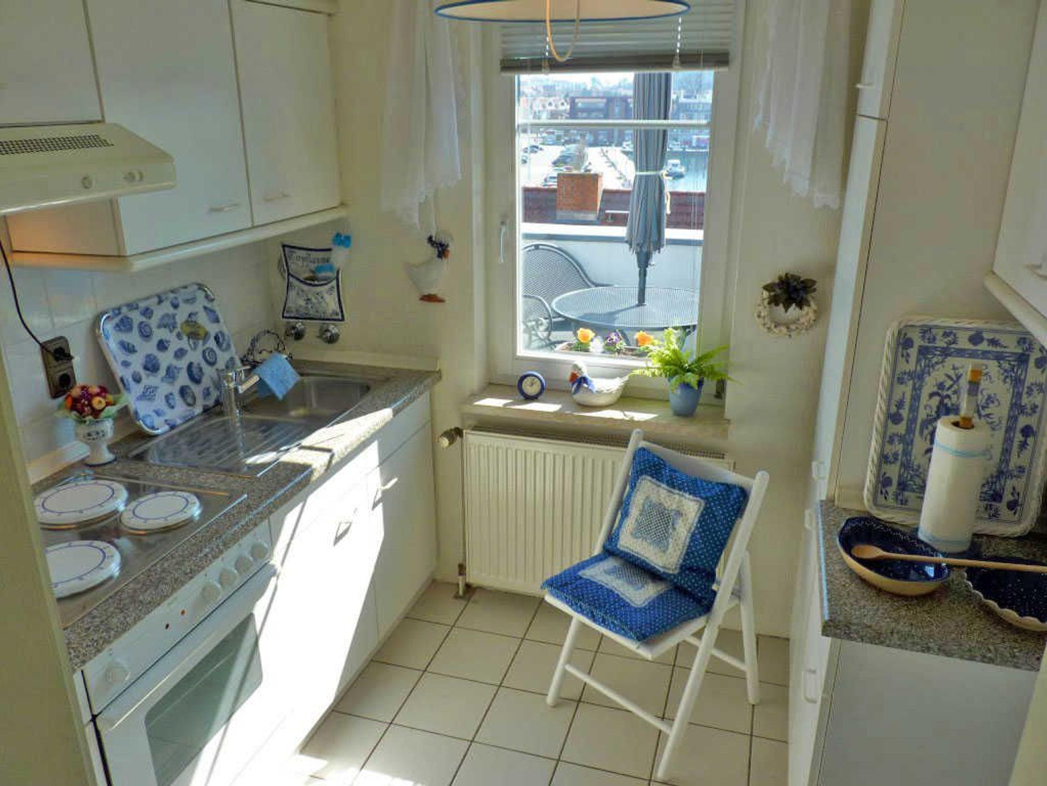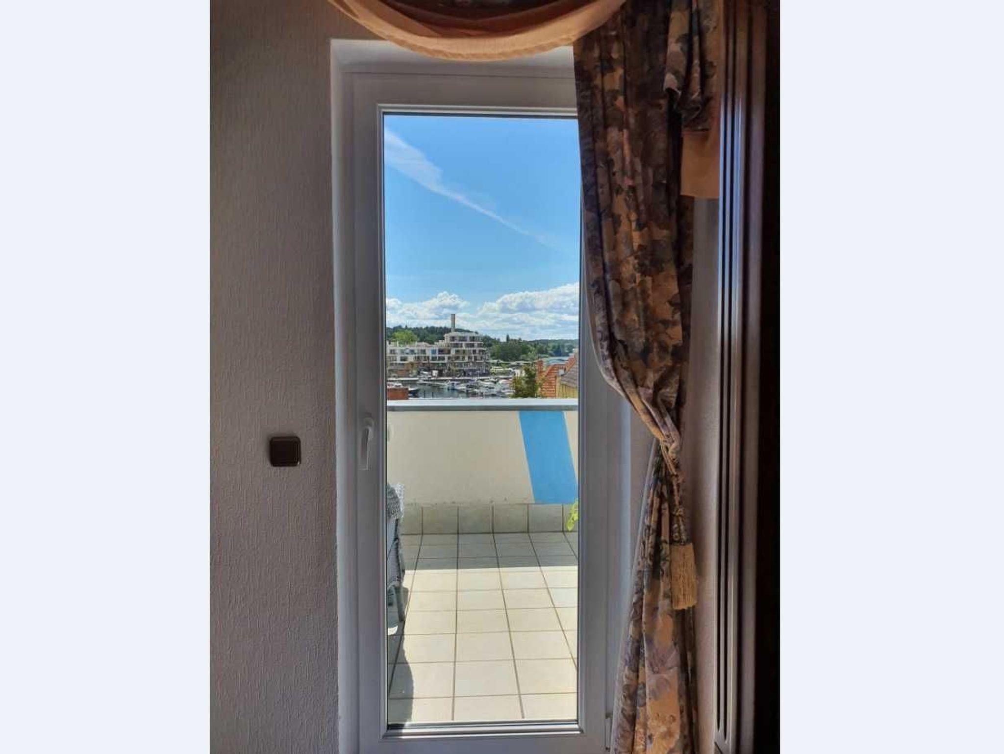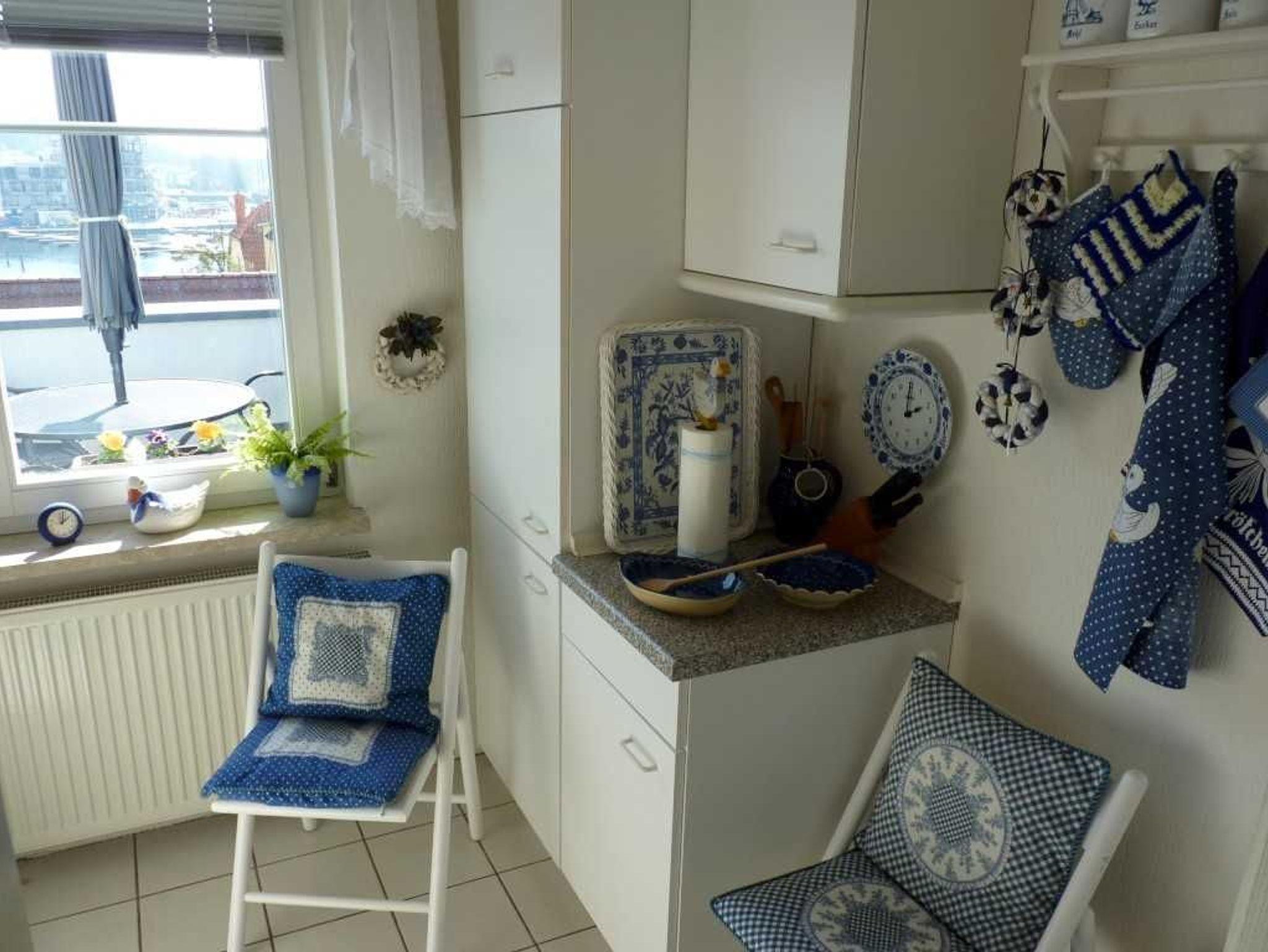 Die großzügige Ferienwohnung bietet Ihnen ein Wohnzimmer mit Couchlandschaft, Esstisch und FlachTV mit Zugang zum Balkon mit fantaschtischem Blick über die Dächer der Stadt und den Yachthafen. Das Schlafzimmer mit Doppelbett und Kleiderschrank bietet die Möglichkeit ein Gästeklappbett mit Matratze für eine 3. Person aufzustellen. Das Tageslichtbad ist ausgestattet mit Walkin-Dusche, sowie Waschtisch und WC. Die kleine Küche bietet einen kleinen Essplatz. Die Ausstattung ist gemütlich, sehr gepflegt und mit viel Liebe zum Detail arrangiert. Die Ferienwohnung ist mit Laminat oder Fliesen ausgestattet. Lediglich im Sitzbereich liegen kleine Teppiche.