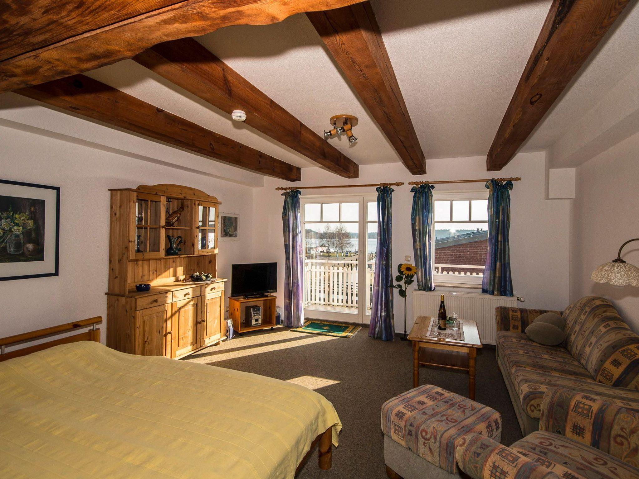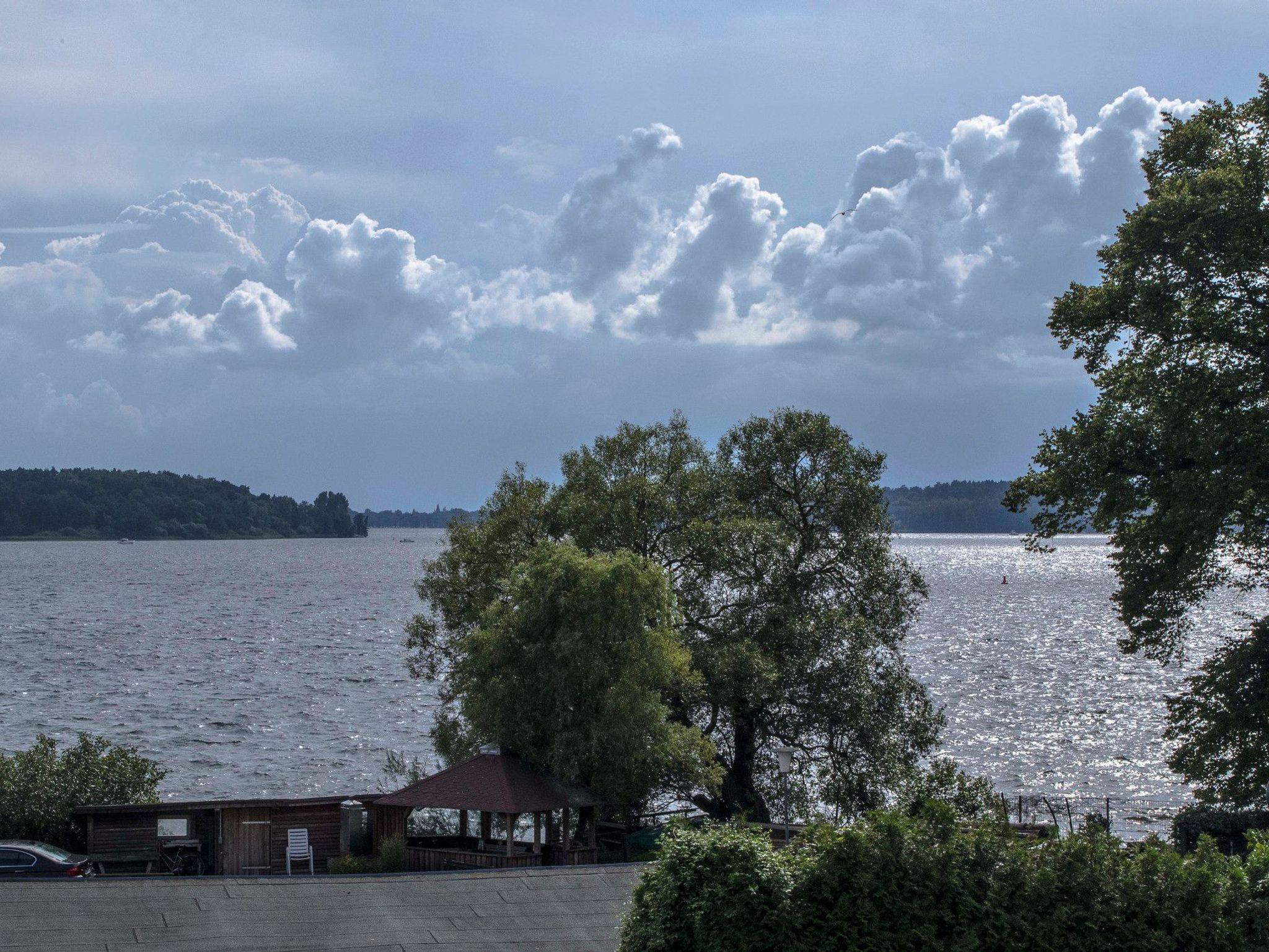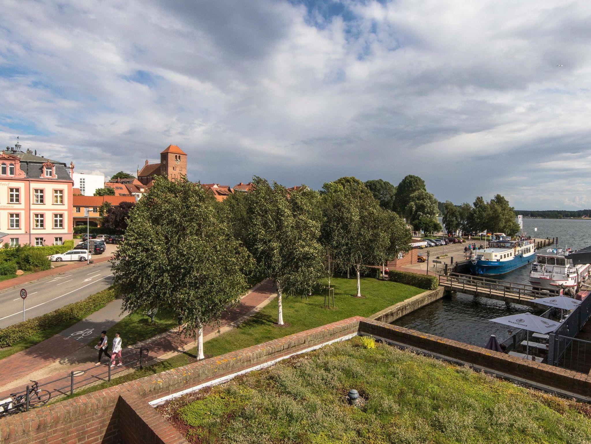 Die schöne Balkon ist mit einem Sonnenschirm und Balkonmöbeln ausgestattet und bietet einen schönen Blick auf die Müritz, den Schiffsanleger und in die Altstadt