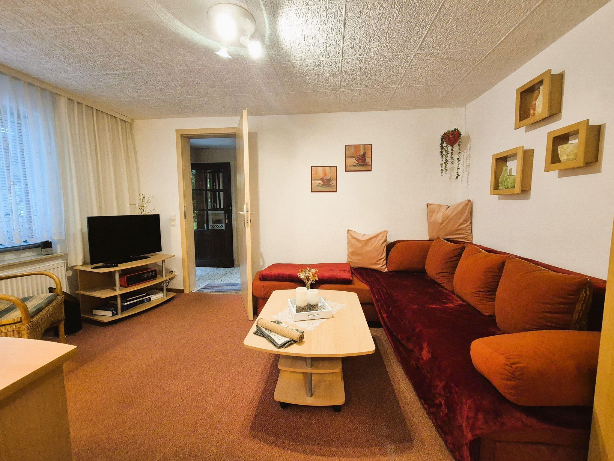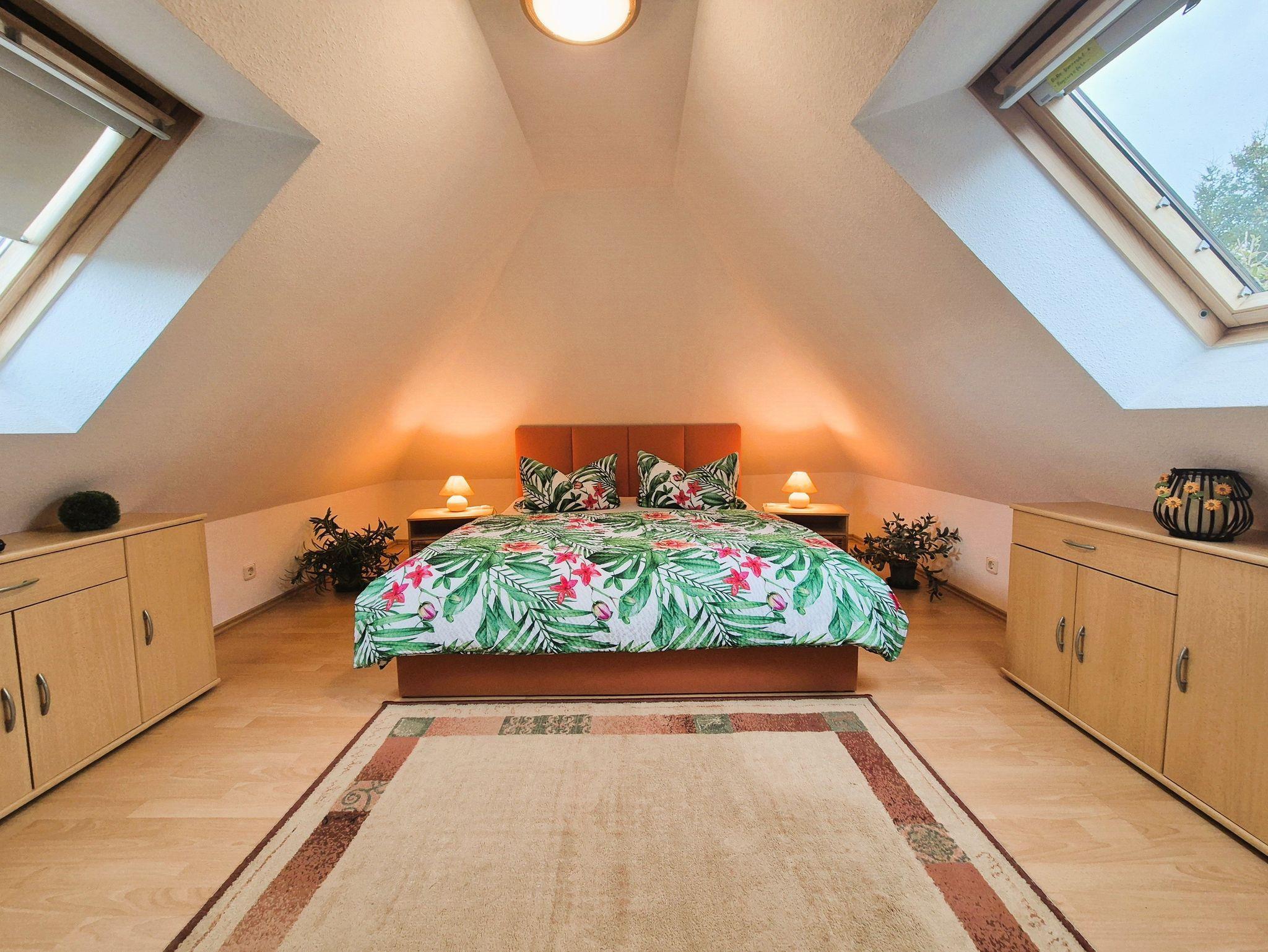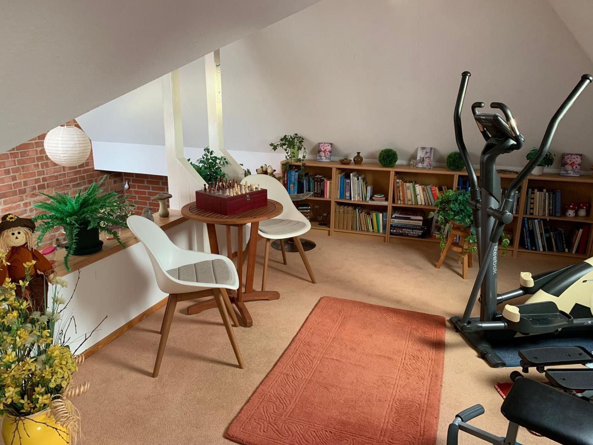 Unsere Ferienwohnung über 2 Ebenen bietet Ihnen schon fast Hauscharakter. Über den großzügigen Wintergarten gelangen Sie in die Wohnung. Im Erdgeschoss befindet sich das Wohnzimmer mit Eckcouch und TV, das Badezimmer mit Dusche, Waschtisch und WC und die Küche (Neu 2021) mit kleiner Sitzmöglichkeit. Das Schlafzimmer mit Doppelbett, die Galerie mit Fitnessgeräten, Leseplatz mit einer Auswahl an Bücher und mit Blick in den Wintergarten hinunter befindet sich im 1. Obergeschoss (=Dachgeschoss).