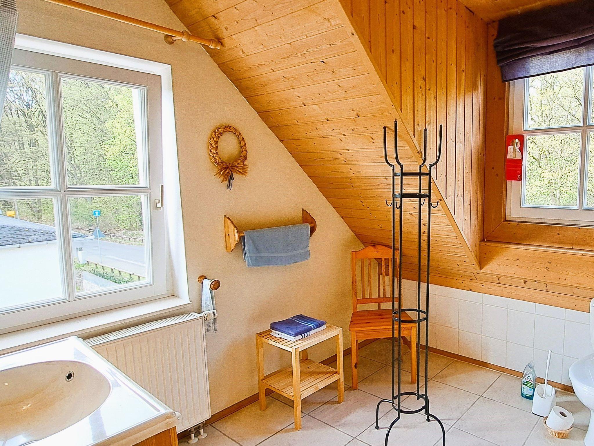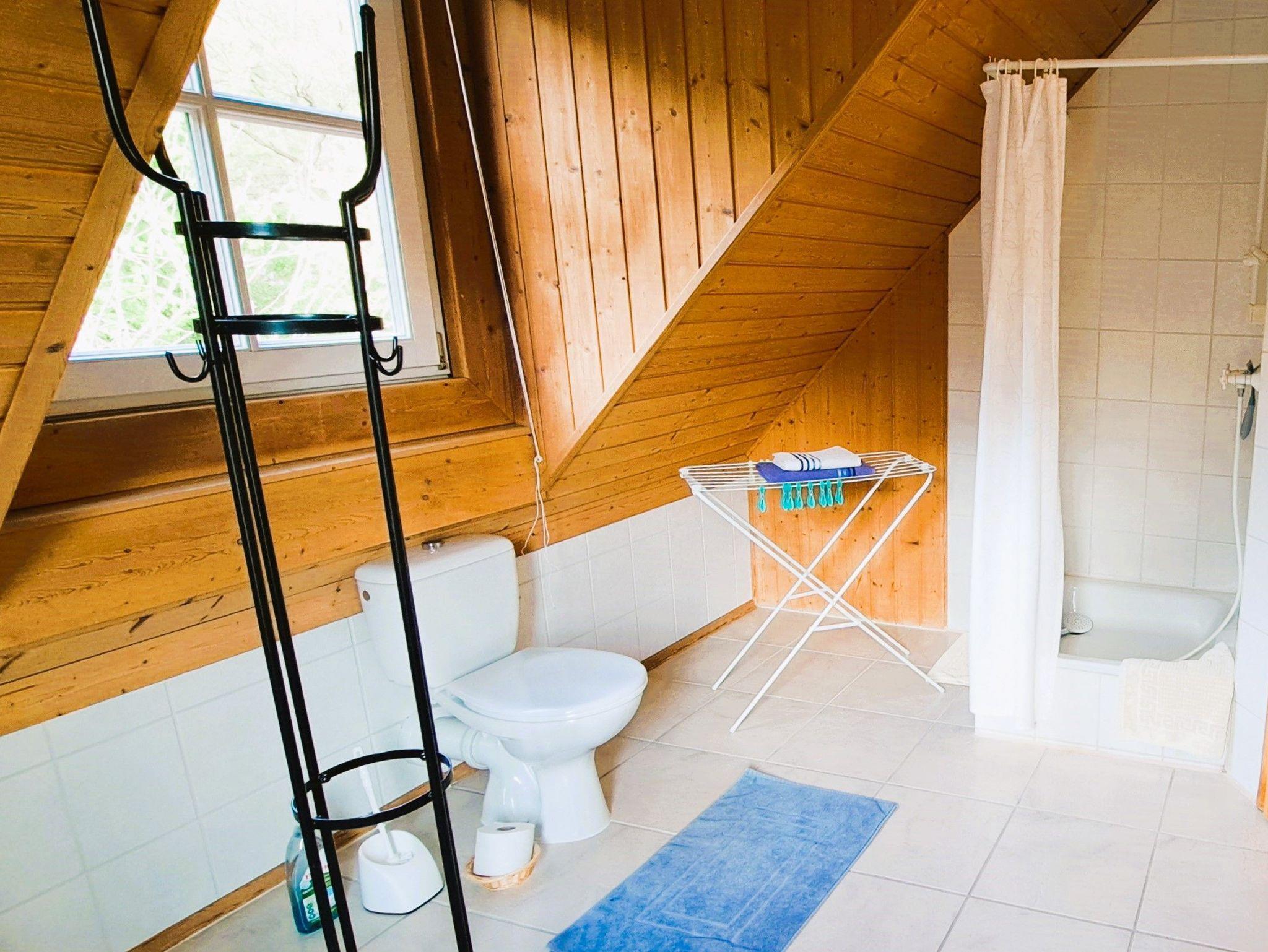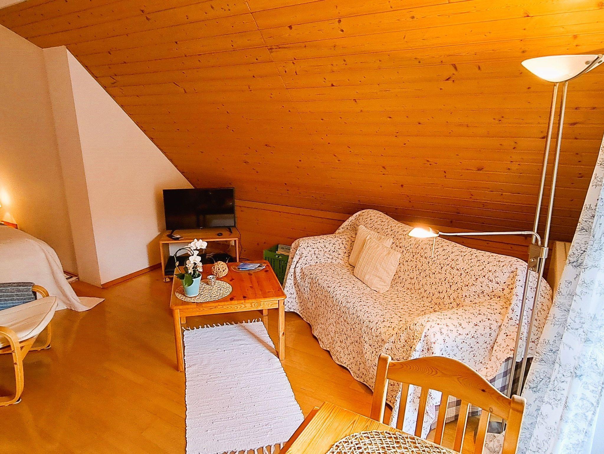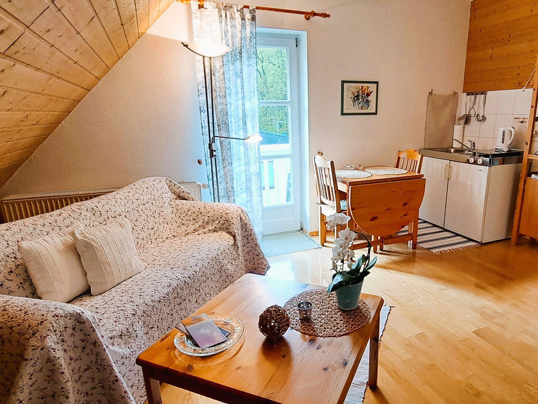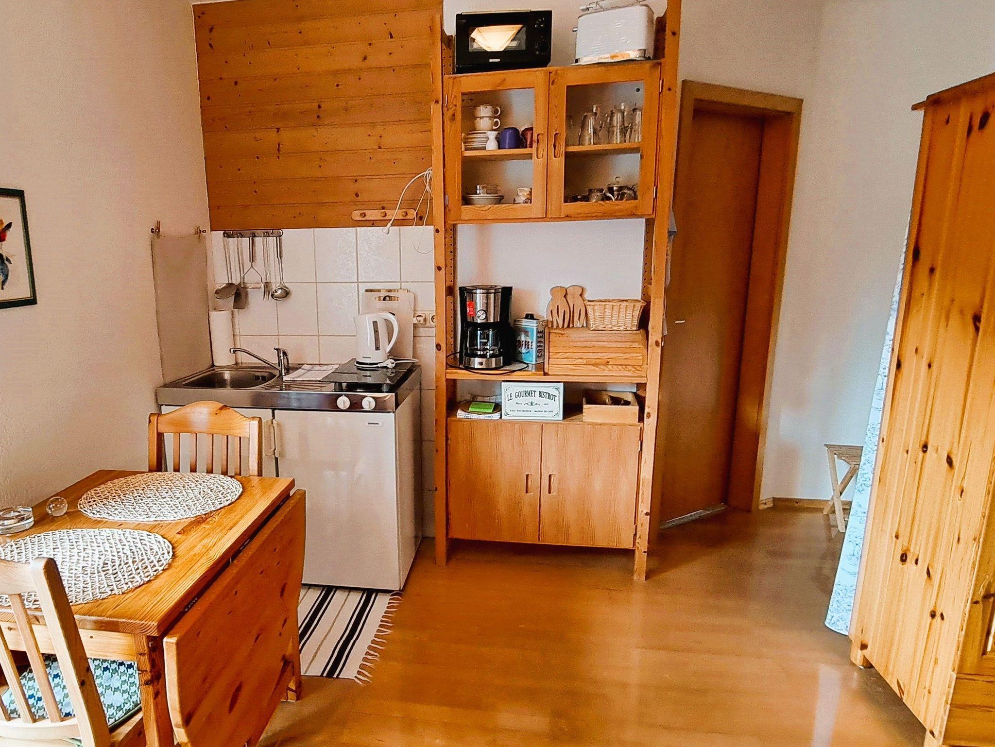 Die Ferienwohnung im 1. Obergeschoss ist klein und gemütlich und bietet Ihnen einen kombinierten Wohn- /Schlafraum mit Zweisitzer-Couch, FlachTV, Kleiderschrank und Doppelbett, sowie einer kleinen Pantrykochgelegenheit und Zugang zum Balkon. Das Tageslichtbad ist mit Dusche und WC ausgestattet. Die Einrichtung ist gemütlich, hell und freundlich.