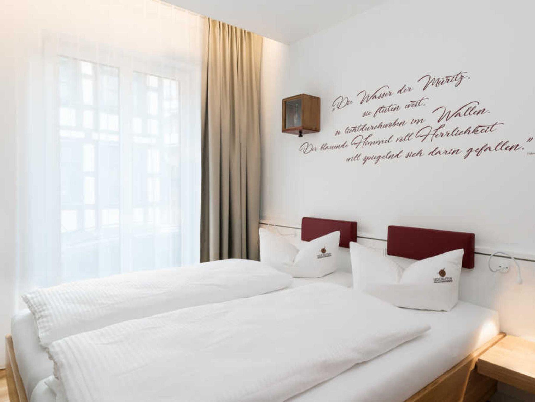 Wir begrüßen Sie in den HOF-SUITEN ? einem Haus mit Moderne und Geschichte, perfektem Service sowie exklusivem Ambiente für Ihren nächsten Aufenthalt im Heilbad Waren (Müritz). Verbringen Sie Tage der Entspannung bei uns. Wellness, Radfahren, Wandern, Baden, Wohlfühlen, Abschalten und Erholen. Zur Ruhe kommen. In wundervoller Umgebung, mit Freundlichkeit, Authentizität und Wärme. Jeder Aufenthalt bei uns wird Urlaub für die Seele sein. Alle HOF-SUITEN sind komplett ebenerdig, behindertengerecht und zeichnen sich durch eine moderne Innenausstattung, Holzboden und stilvolle Bäder aus. Sie verfügen über einen Balkon oder eine Terrasse und bieten teilweise einen Müritz- oder Altstadtblick. Bei Anreise sind Bettwäsche und Handtücher sowie eine Flasche Wasser zur Begrüßung vorhanden. Kontaktieren Sie uns gern, falls Sie die Privat-Sauna oder Wellnessbehandlungen reservieren möchten. Wir freuen uns, wenn Sie Ihre Zeit bei uns genießen und schenken Ihnen Momente der Erholung. Herzlichst Jan Granzow und das Team der HOF-SUITEN