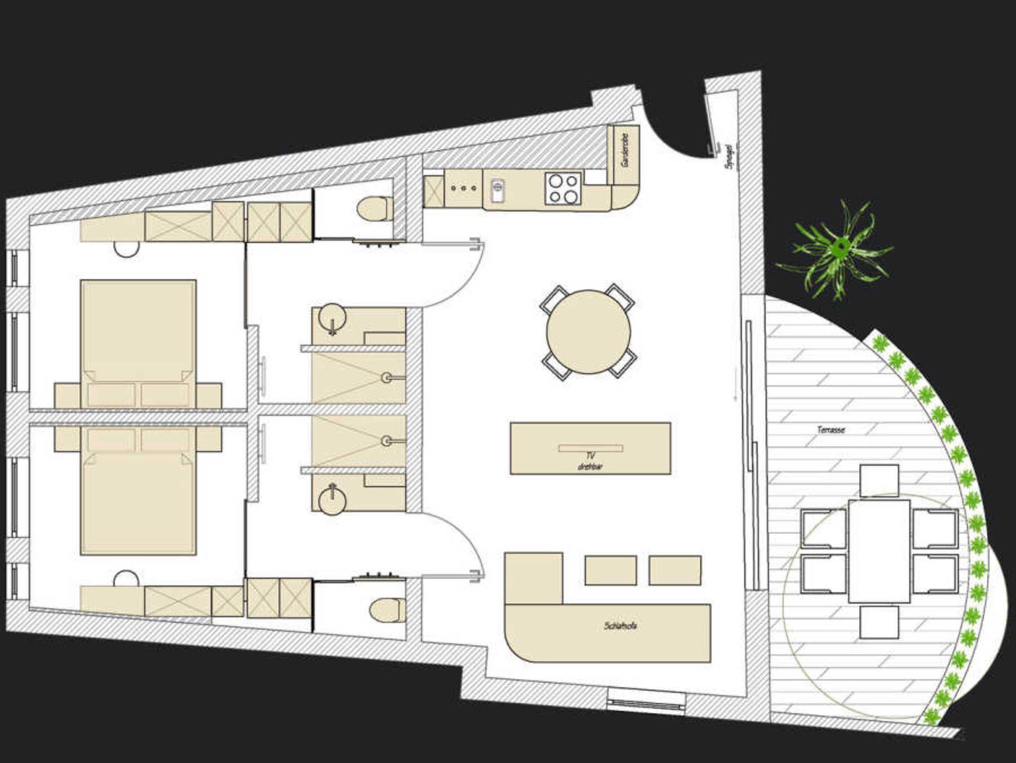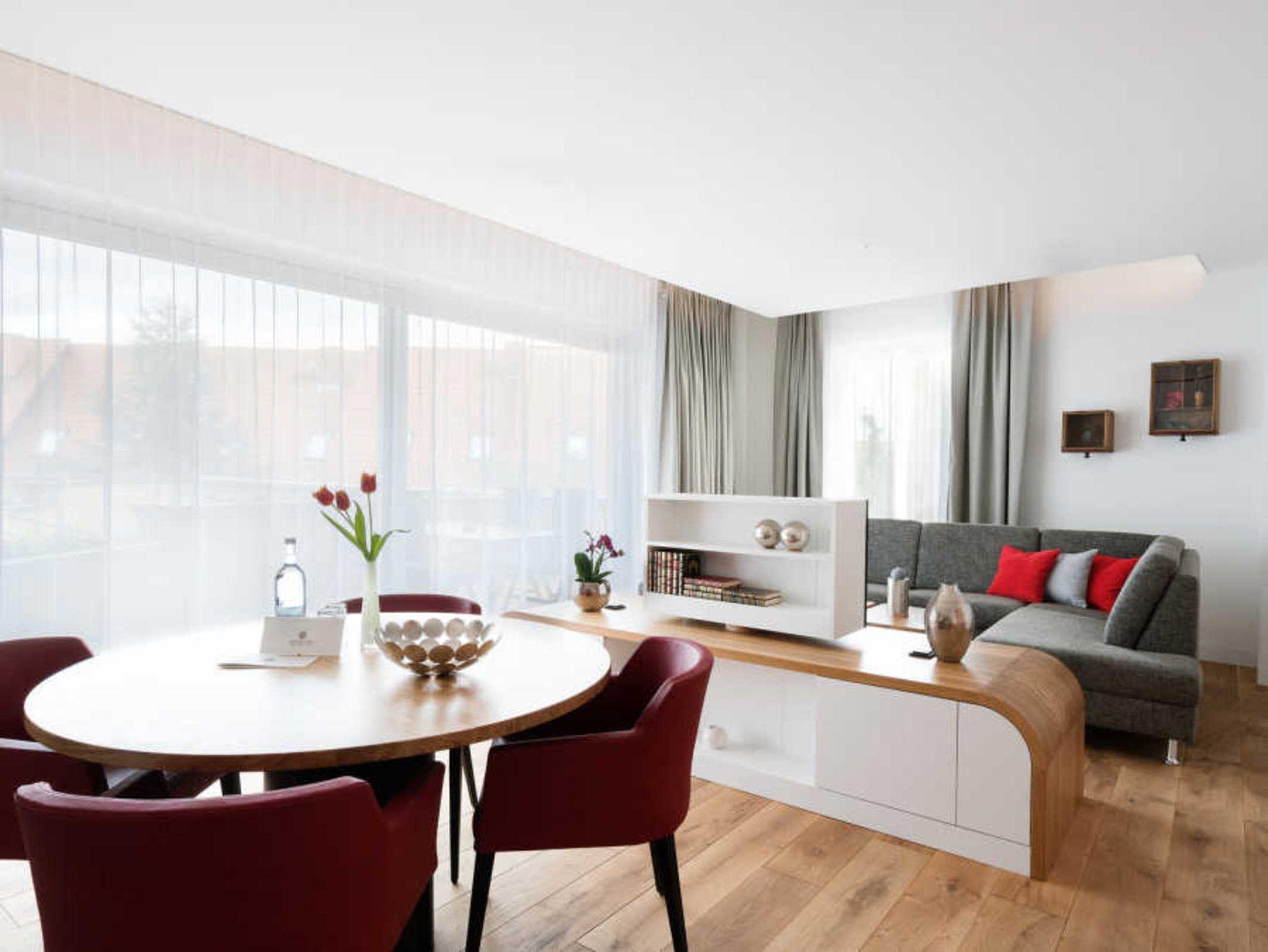 Die Suite Burmeister befindet sich im Erdgeschoss des Hauses und verfügt über zwei Schlafbereiche mit jeweils einem Bad en suite sowie einen kombinierten Wohn-/Essbereich mit offener Küche. Eine Aufbettung für die 5. Person erfolgt im Wohnbereich auf der Couch. Bei Anreise sind Bettwäsche und Handtücher sowie eine Flasche Wasser zur Begrüßung vorhanden. Weitere Ausstattungen: Nichtraucher, Fußbodenheizung, Sat-TV und Radio, W-LAN, Schreibtisch, komfortables Sofa, modernes Sideboard und gemütlichen Esstisch, Terrasse mit Blick auf den Innenhof, vollausgestattete moderne Küchenzeile mit Backofen, Mikrowelle, Kaffeemaschine, Wasserkocher, Toaster, Kühlschrank mit Eisfach, Cerankochfeld, Geschirrspüler sowie ausreichend Geschirr