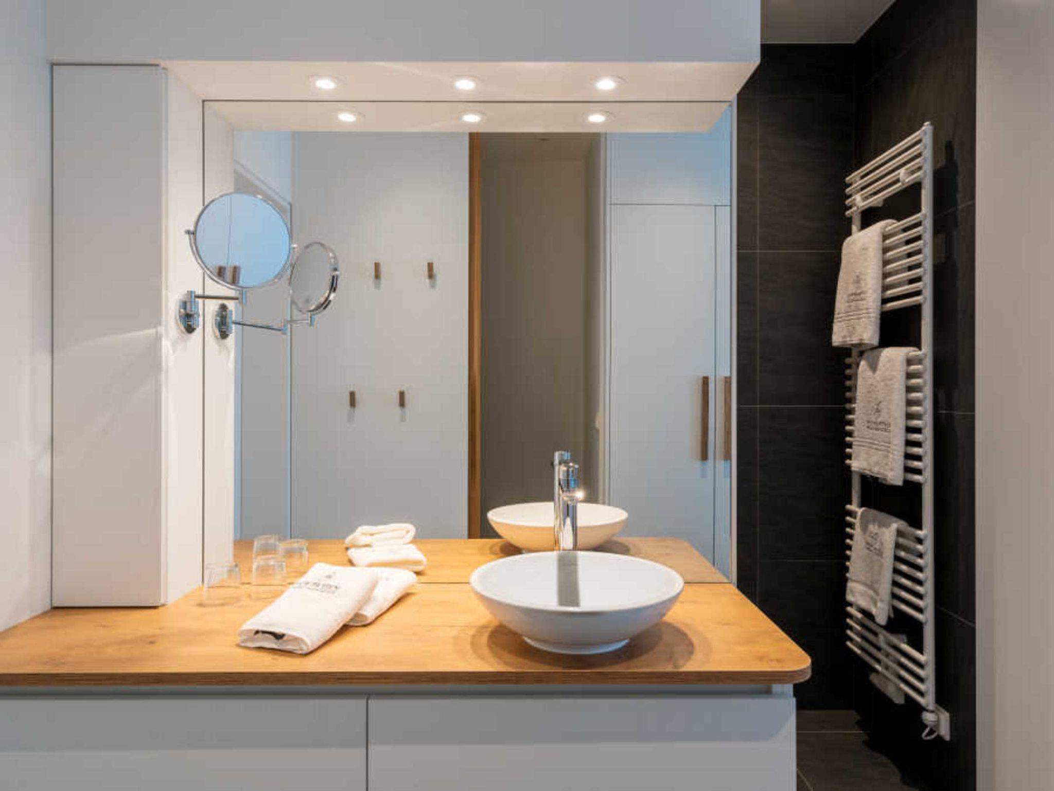 Schlafzimmer mit großen Betten und komfortablen Matratzen, ein Tresor für Wertsachen, großzügig geschnittene Bäder mit ebenerdiger Dusche, Haartrockner, Saunatücher und Bademäntel stehen für Hausgäste zur Verfügung.