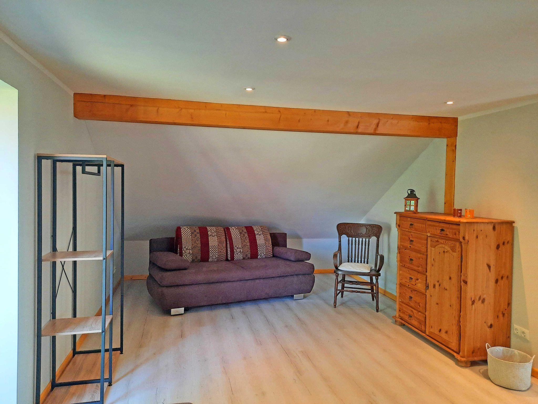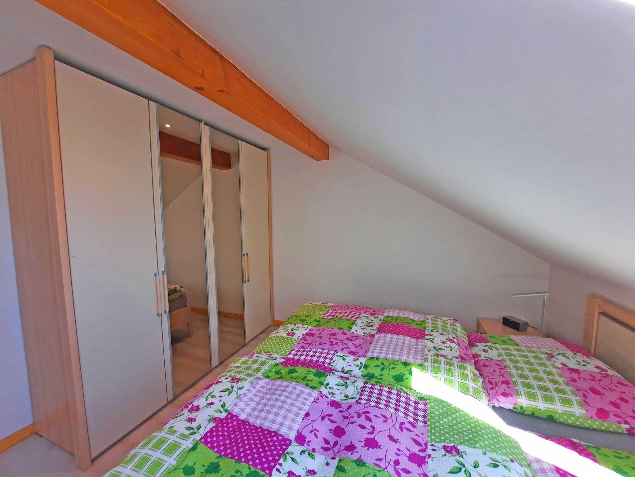 Die Ferienwohnung liegt idyllisch ruhig mit Blick ins Grüne. Ideal für eine Auszeit. Im 1.Obergeschoss (=Dachgeschoss) eines neu erbauten modernen Eigenheimes wurde die Wohnung liebevoll und modern eingerichtet. Der Eingang zur Wohnung ist separat über eine Aussentreppe. Das Auto kann direkt am Haus geparkt werden. Die Fahrräder können in einem separaten Gartenhäusschen eingeschlossen werden. Auf dem riesigen Aussenbereich mit Blick in die Ferne steht Ihnen eine Aussensitzmöglichkeit mit Grill und Feuerschale zur Verfügung.