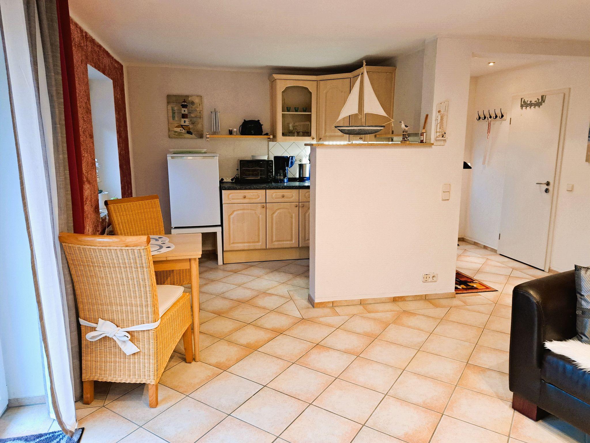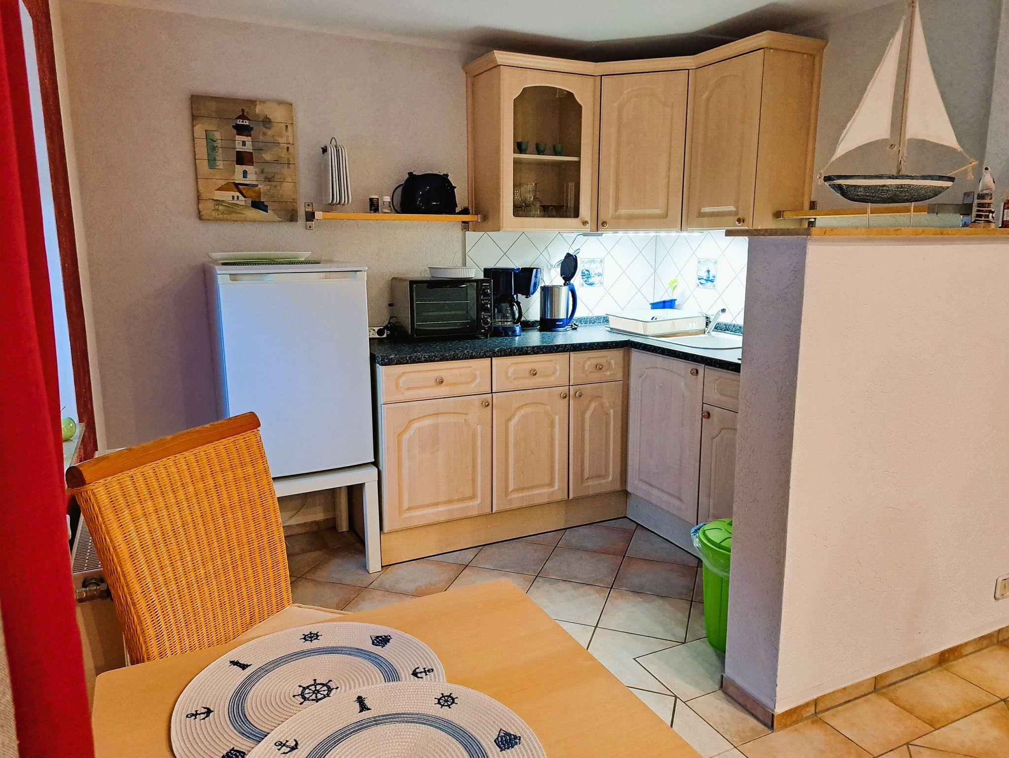 Die offene Küchenzeile fügt sich harmonisch in den Wohnbereich ein. Sie verfügt über einen Kühlschrank, einen 2-Platten-Herd, einen Minibackofen, eine Kaffeemaschine, einen Toaster und einen Wasserkocher. Eine Tiefkühlmöglichkeit ist nicht vorhanden, auf Wunsch können kleinere Mengen bei den Gastgebern gelagert werden.