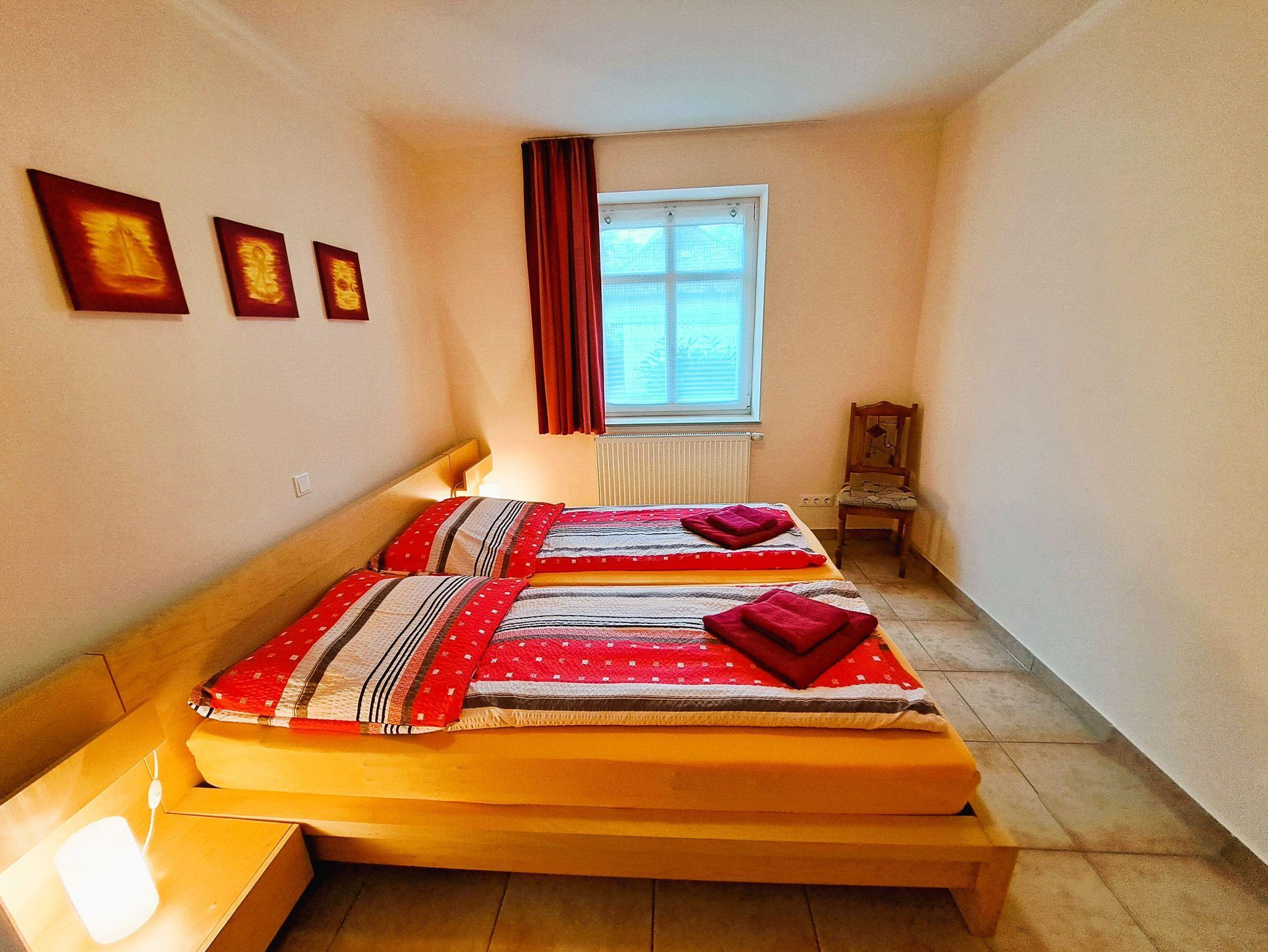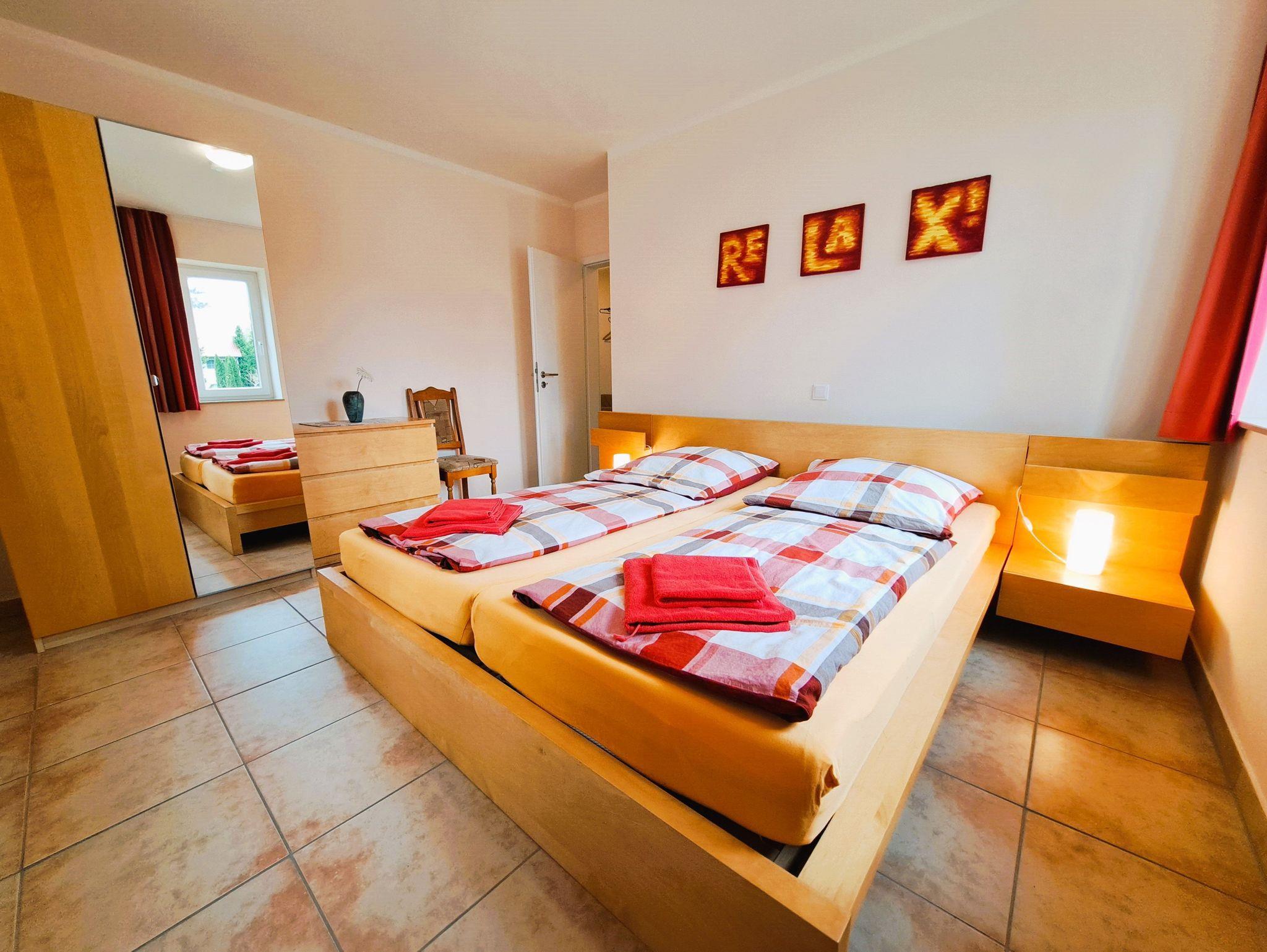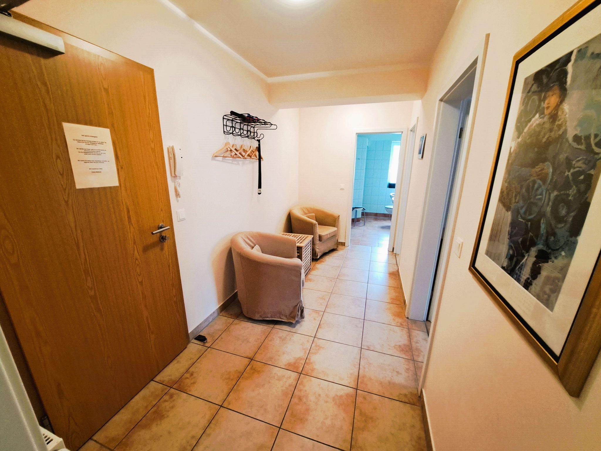 Unsere Ferienwohnung 2 (Ostseite) befindet sich im Erdgeschoss und bietet eine gemütliche Terrasse, ideal für entspannte Stunden im Freien. Schon beim Betreten empfängt Sie ein einladender Flur mit Sessel, Garderobe und Schuhablage. Die beiden Schlafzimmer sind jeweils mit einem komfortablen Doppelbett, Nachttischen, Lampen, Wechselschaltern und doppeltürigen Kleiderschränken ausgestattet perfekt für eine erholsame Nachtruhe.