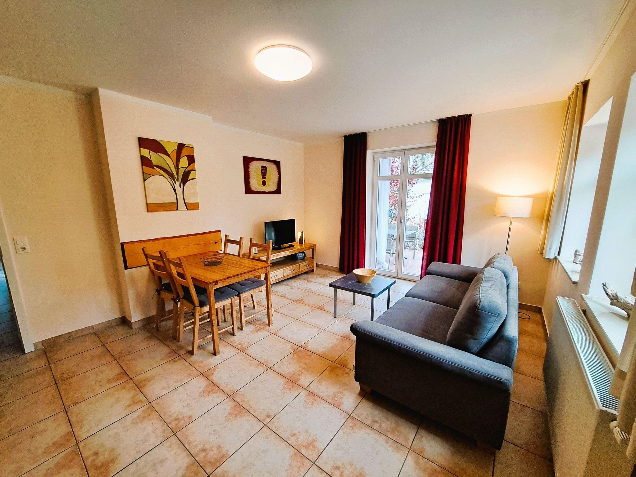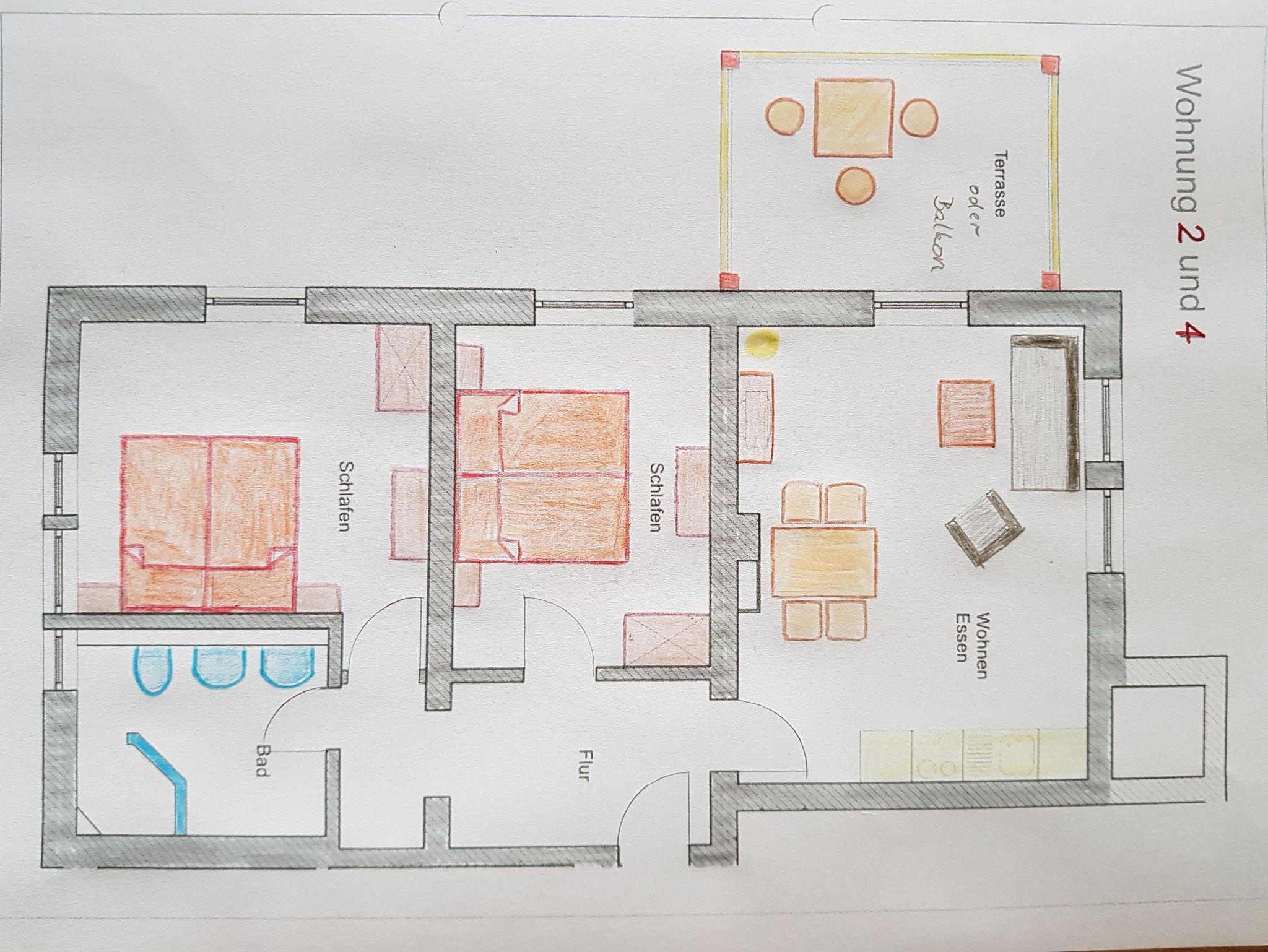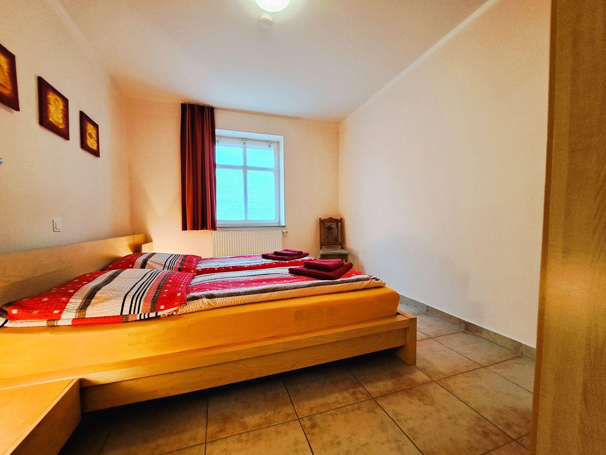 Unsere Ferienwohnung 2 (Ostseite) befindet sich im Erdgeschoss und bietet eine gemütliche Terrasse, ideal für entspannte Stunden im Freien. Schon beim Betreten empfängt Sie ein einladender Flur mit Sessel, Garderobe und Schuhablage. Die beiden Schlafzimmer sind jeweils mit einem komfortablen Doppelbett, Nachttischen, Lampen, Wechselschaltern und doppeltürigen Kleiderschränken ausgestattet perfekt für eine erholsame Nachtruhe.