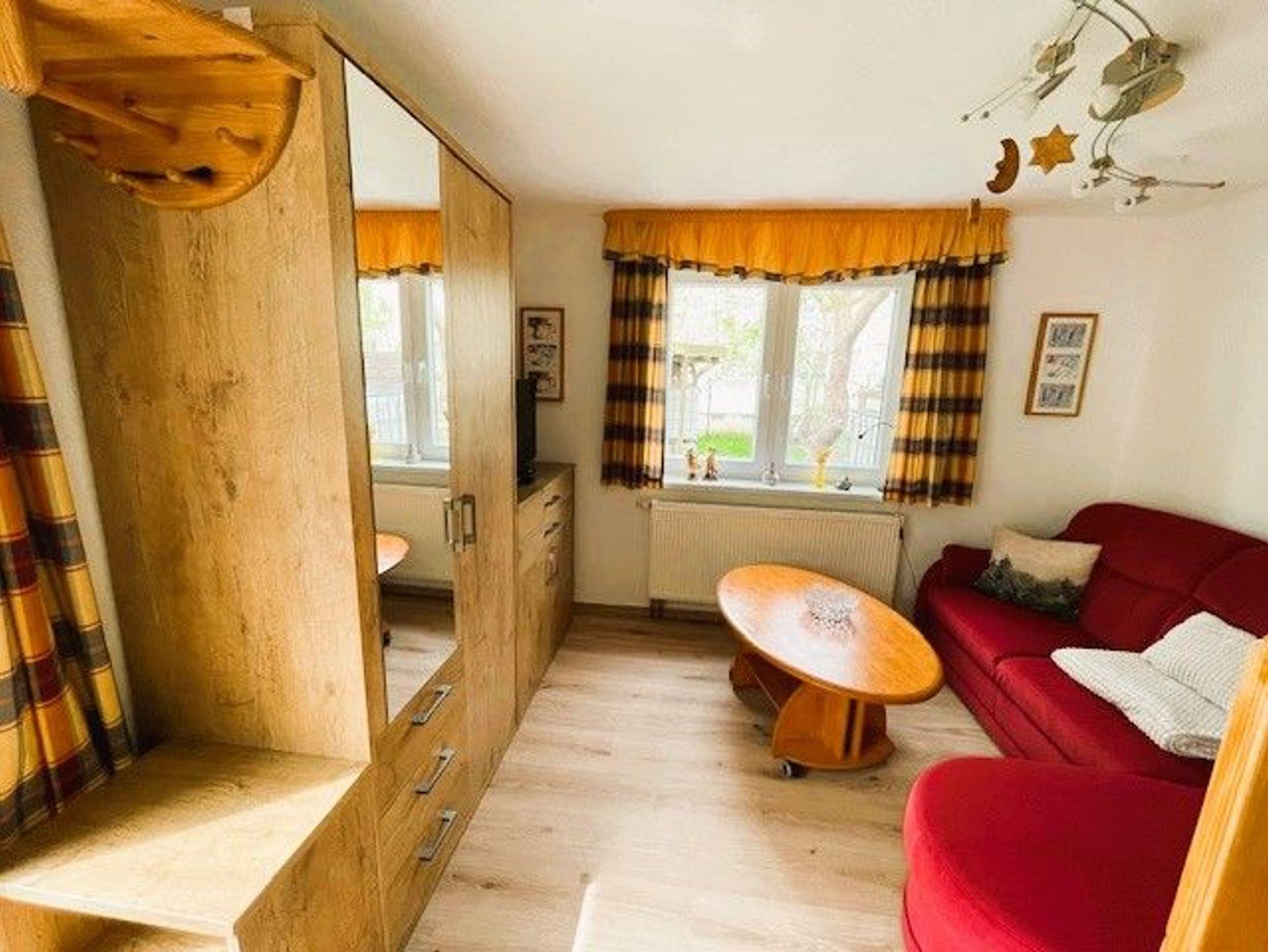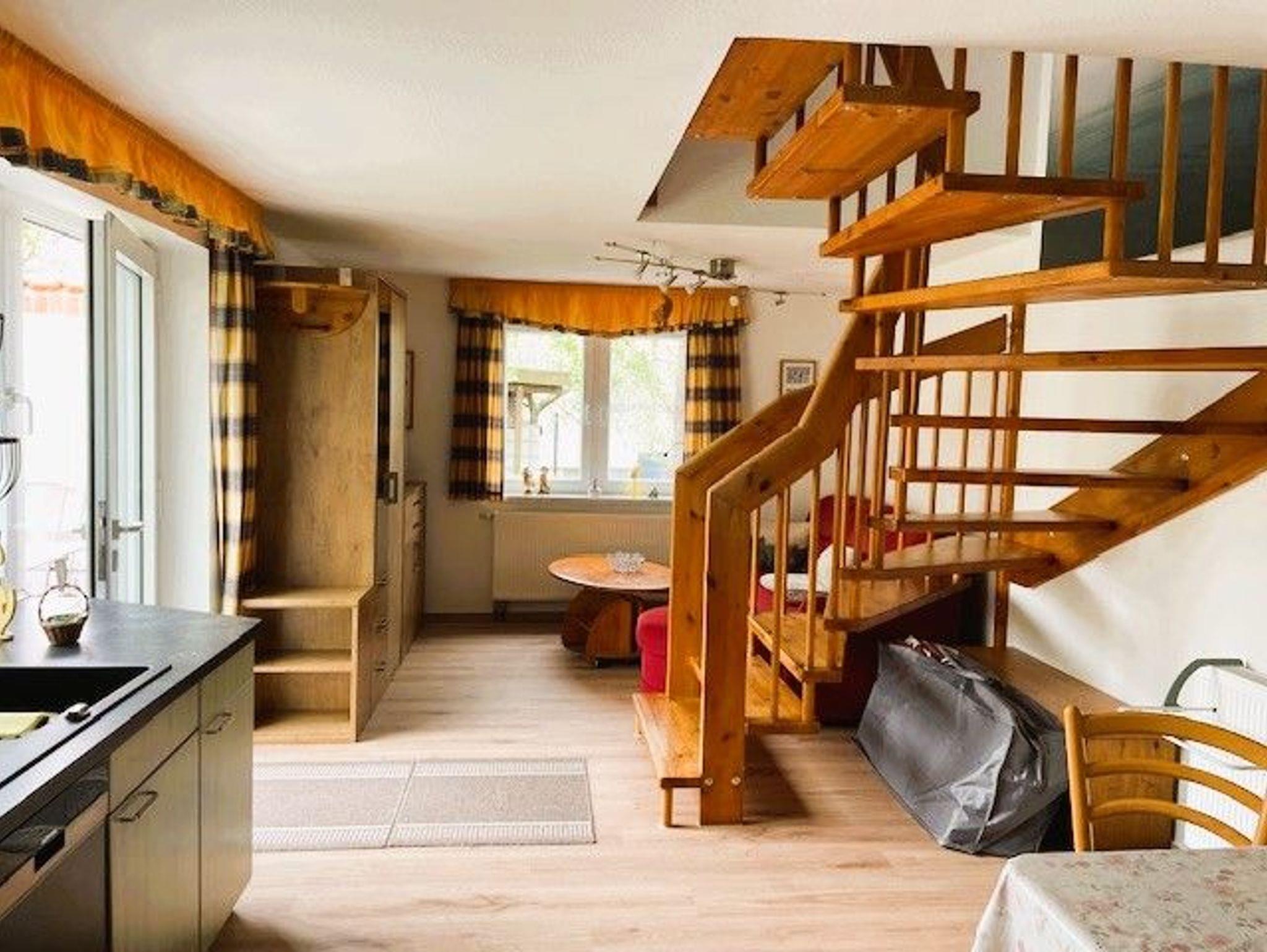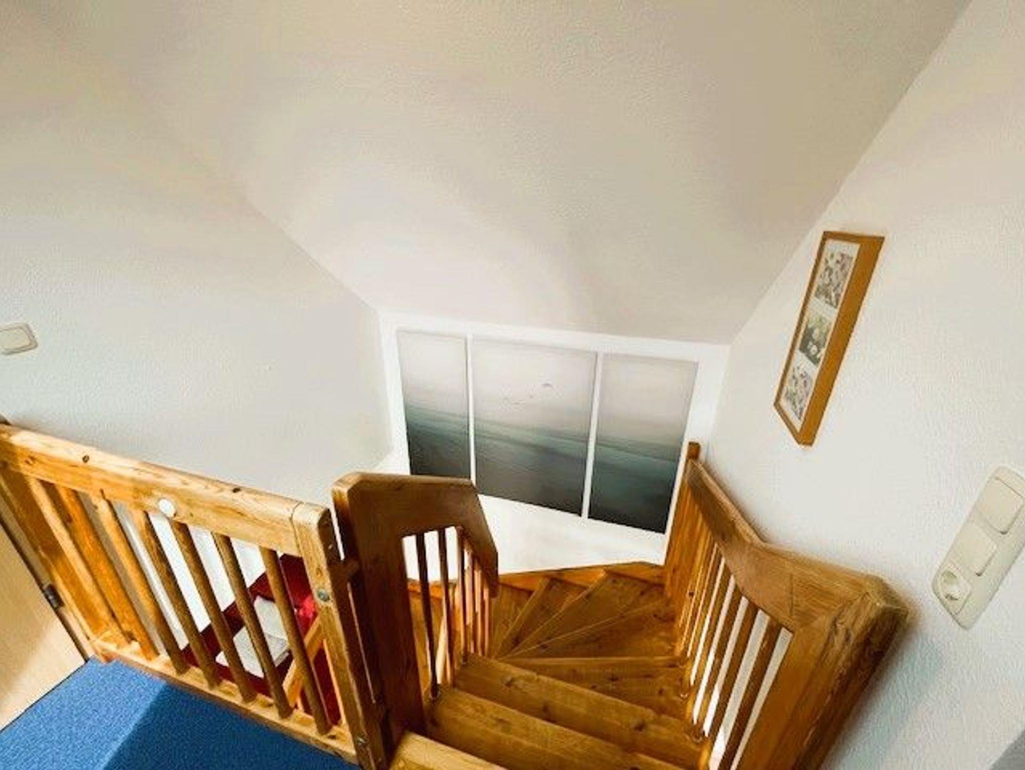 Im Erdgeschoss haben Sie ein Wohn- und Esszimmer mit moderner Küchenzeile, sowie ein Badezimmer mit Dusche und WC. Im Wohnbereich steht ein Sofa und eine Wohnwand mit Fernseher. Über die großzügige Wendeltreppe aus Holz in der Mitte des Ferienhauses gelangen Sie zum Obergeschoss mit einem Doppelzimmer ohne eigene Tür auf der einen Seite und einem abgeschlossenen Zweibettzimmer gegenüber. Das Ferienhaus ist gemütlich und praktisch eingerichtet. Rauchen und Tiere sind in der Wohnung nicht erlaubt. Für Eltern mit Kleinkind steht nach Absprache ein Hochstuhl und ein Reisebett zur Verfügung. Der Wohn- Essbereich ist mit Vinyl und der Schlafbereich ist mit Teppichboden ausgelegt. Im Bad befinden sich Fliesen. Die obere Etage verfügt über Dachschrägen. Das Doppelbett ist bequeme 1,60 m breit, die zwei Einzelbetten jeweils 0,90 m. Das gesamte Innere des Ferienhauses wurde 2025 renoviert.