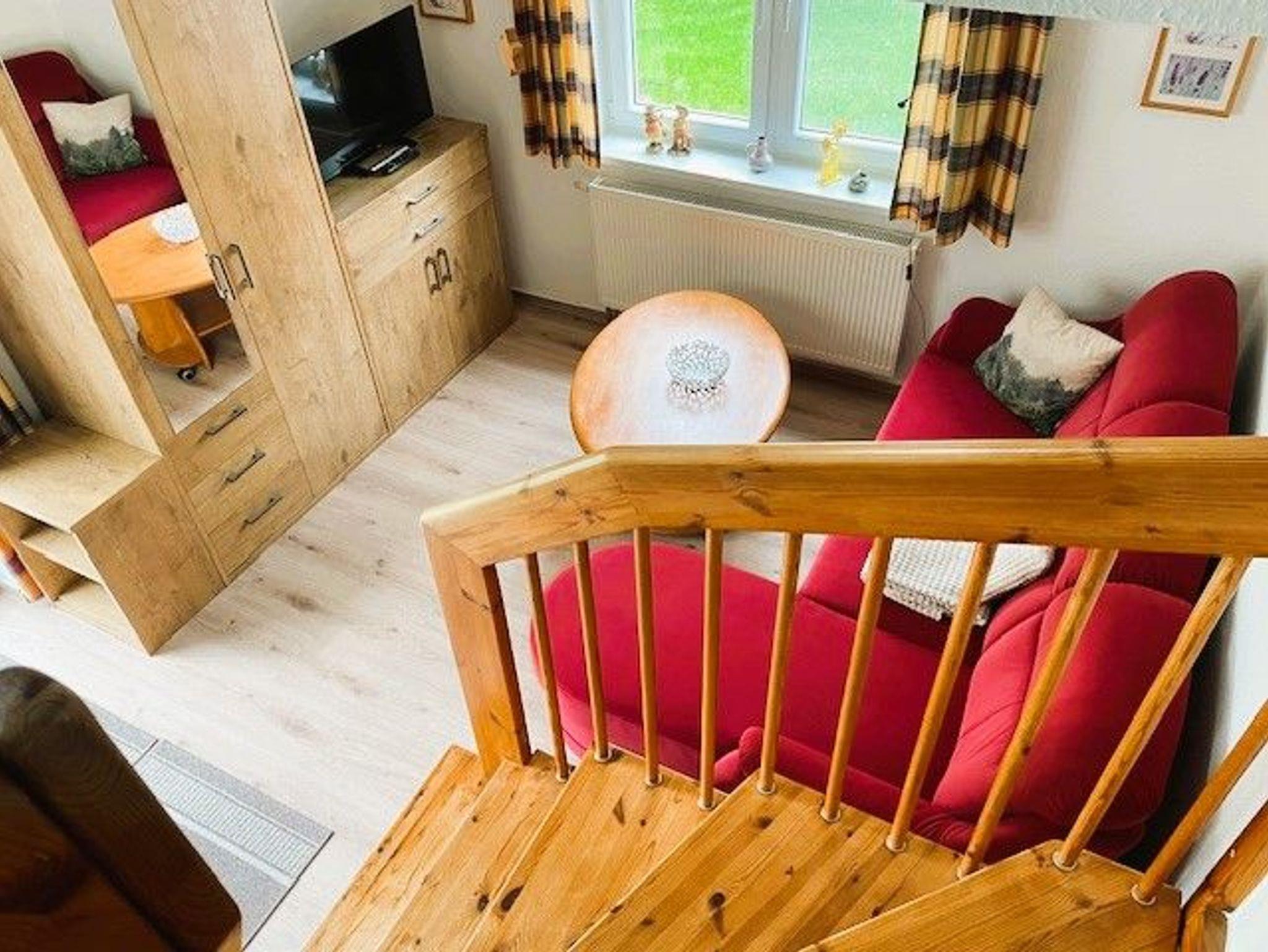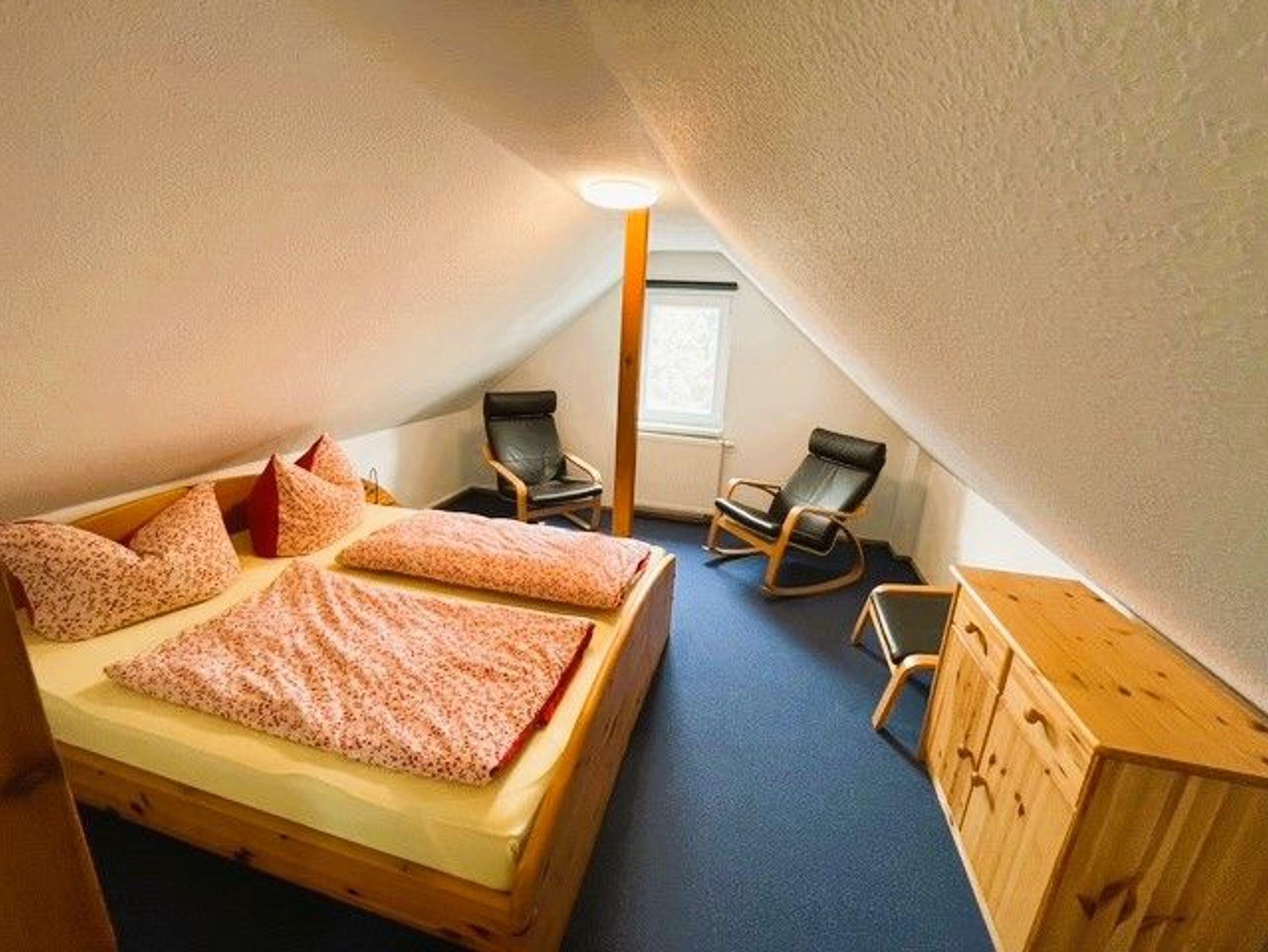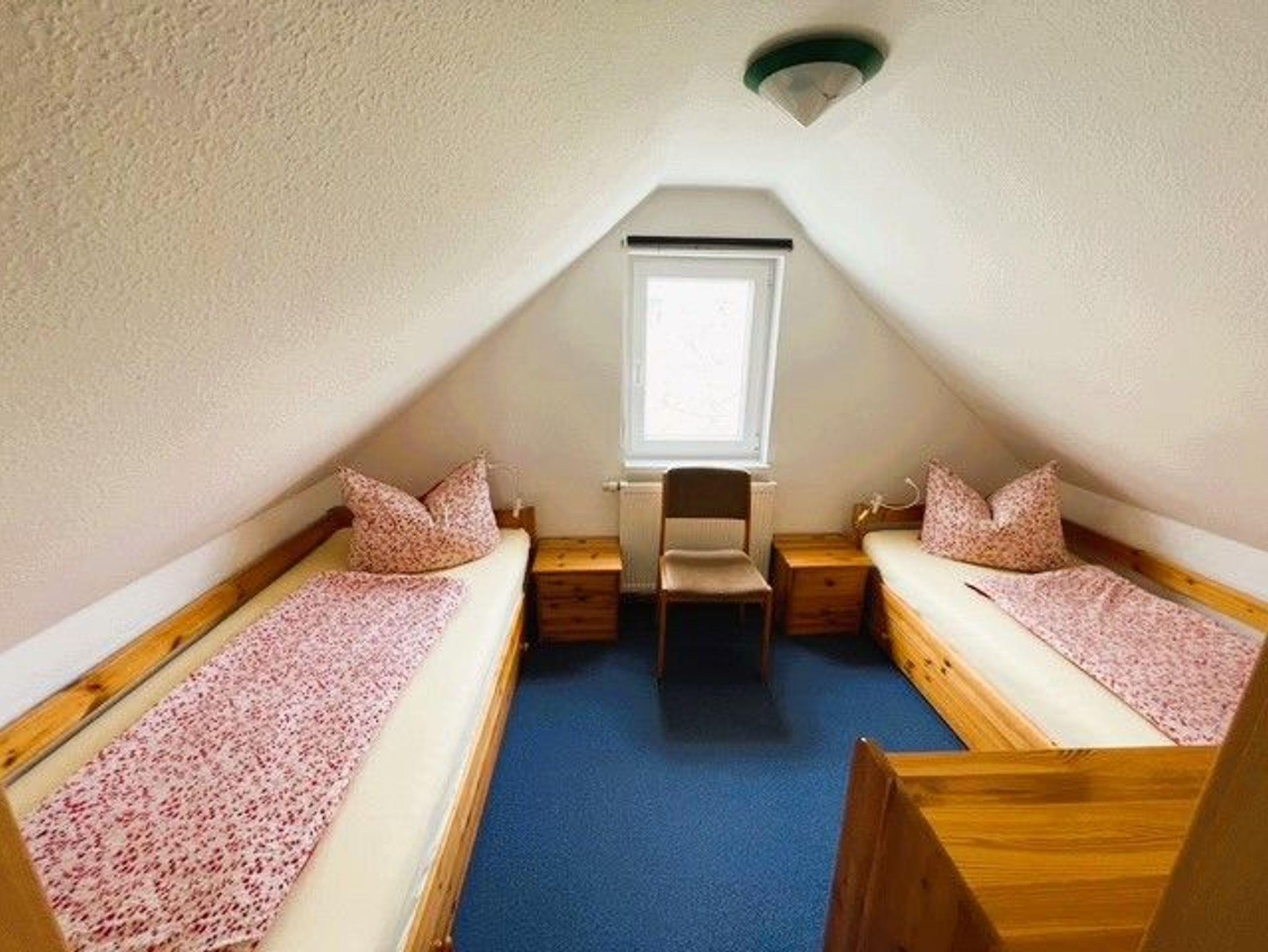 Im Erdgeschoss haben Sie ein Wohn- und Esszimmer mit moderner Küchenzeile, sowie ein Badezimmer mit Dusche und WC. Im Wohnbereich steht ein Sofa und eine Wohnwand mit Fernseher. Über die großzügige Wendeltreppe aus Holz in der Mitte des Ferienhauses gelangen Sie zum Obergeschoss mit einem Doppelzimmer ohne eigene Tür auf der einen Seite und einem abgeschlossenen Zweibettzimmer gegenüber. Das Ferienhaus ist gemütlich und praktisch eingerichtet. Rauchen und Tiere sind in der Wohnung nicht erlaubt. Für Eltern mit Kleinkind steht nach Absprache ein Hochstuhl und ein Reisebett zur Verfügung. Der Wohn- Essbereich ist mit Vinyl und der Schlafbereich ist mit Teppichboden ausgelegt. Im Bad befinden sich Fliesen. Die obere Etage verfügt über Dachschrägen. Das Doppelbett ist bequeme 1,60 m breit, die zwei Einzelbetten jeweils 0,90 m. Das gesamte Innere des Ferienhauses wurde 2025 renoviert.